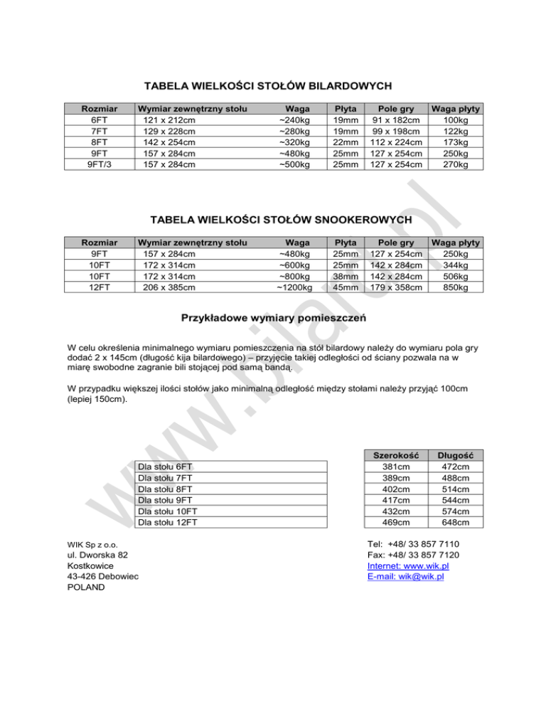 TABELA WIELKOŚCI STOŁÓW BILARDOWYCH Rozmiar 6FT 7FT 8FT 9FT 9FT/3 Wymiar zewnętrzny stołu 121 x 212cm 129 x 228cm 142 x 254cm 157 x 284cm 157 x 284cm Waga ~240kg ~280kg ~320kg ~480kg ~500kg Płyta 19mm 19mm 22mm 25mm 25mm Pole gry 91 x 182cm 99 x 198cm 112 x 224cm 127 x 254cm 127 x 254cm Waga płyty 100kg 122kg 173kg 250kg 270kg TABELA WIELKOŚCI STOŁÓW SNOOKEROWYCH Rozmiar 9FT 10FT 10FT 12FT Wymiar zewnętrzny stołu 157 x 284cm 172 x 314cm 172 x 314cm 206 x 385cm Waga ~480kg ~600kg ~800kg ~1200kg Płyta 25mm 25mm 38mm 45mm Pole gry 127 x 254cm 142 x 284cm 142 x 284cm 179 x 358cm Waga płyty 250kg 344kg 506kg 850kg Przykładowe wymiary pomieszczeń W celu określenia minimalnego wymiaru pomieszczenia na stół bilardowy należy do wymiaru pola gry dodać 2 x 145cm (długość kija bilardowego) – przyjęcie takiej odległości od ściany pozwala na w miarę swobodne zagranie bili stojącej pod samą bandą. W przypadku większej ilości stołów jako minimalną odległość między stołami należy przyjąć 100cm (lepiej 150cm). Dla stołu 6FT Dla stołu 7FT Dla stołu 8FT Dla stołu 9FT Dla stołu 10FT Dla stołu 12FT WIK Sp z o.o. ul. Dworska 82 Kostkowice 43-426 Debowiec POLAND Szerokość 381cm 389cm 402cm 417cm 432cm 469cm Długość 472cm 488cm 514cm 544cm 574cm 648cm Tel: +48/ 33 857 7110 Fax: +48/ 33 857 7120 Internet: www.wik.pl E-mail: [email protected]
