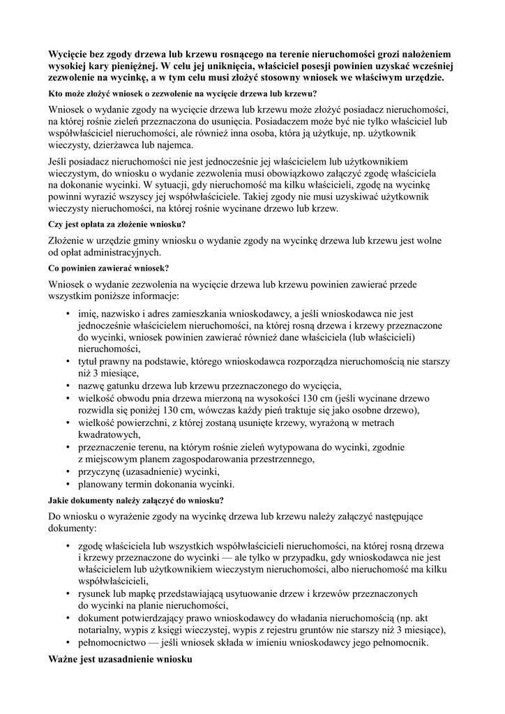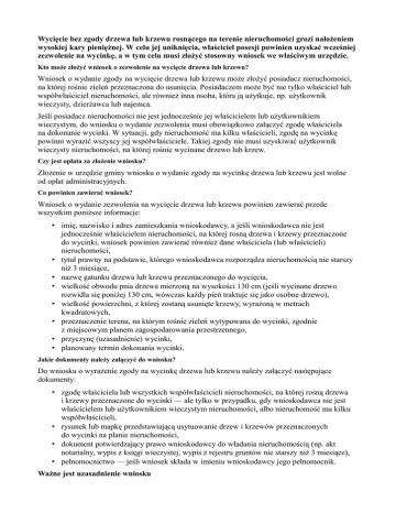 Wycięcie bez zgody drzewa lub krzewu rosnącego na terenie nieruchomości grozi nałożeniem wysokiej kary pieniężnej. W celu jej uniknięcia, właściciel posesji powinien uzyskać wcześniej zezwolenie na wycinkę, a w tym celu musi złożyć stosowny wniosek we właściwym urzędzie. Kto może złożyć wniosek o zezwolenie na wycięcie drzewa lub krzewu? Wniosek o wydanie zgody na wycięcie drzewa lub krzewu może złożyć posiadacz nieruchomości, na której rośnie zieleń przeznaczona do usunięcia. Posiadaczem może być nie tylko właściciel lub współwłaściciel nieruchomości, ale również inna osoba, która ją użytkuje, np. użytkownik wieczysty, dzierżawca lub najemca. Jeśli posiadacz nieruchomości nie jest jednocześnie jej właścicielem lub użytkownikiem wieczystym, do wniosku o wydanie zezwolenia musi obowiązkowo załączyć zgodę właściciela na dokonanie wycinki. W sytuacji, gdy nieruchomość ma kilku właścicieli, zgodę na wycinkę powinni wyrazić wszyscy jej współwłaściciele. Takiej zgody nie musi uzyskiwać użytkownik wieczysty nieruchomości, na której rośnie wycinane drzewo lub krzew. Czy jest opłata za złożenie wniosku? Złożenie w urzędzie gminy wniosku o wydanie zgody na wycinkę drzewa lub krzewu jest wolne od opłat administracyjnych. Co powinien zawierać wniosek? Wniosek o wydanie zezwolenia na wycięcie drzewa lub krzewu powinien zawierać przede wszystkim poniższe informacje: • imię, nazwisko i adres zamieszkania wnioskodawcy, a jeśli wnioskodawca nie jest jednocześnie właścicielem nieruchomości, na której rosną drzewa i krzewy przeznaczone do wycinki, wniosek powinien zawierać również dane właściciela (lub właścicieli) nieruchomości, • tytuł prawny na podstawie, którego wnioskodawca rozporządza nieruchomością nie starszy niż 3 miesiące, • nazwę gatunku drzewa lub krzewu przeznaczonego do wycięcia, • wielkość obwodu pnia drzewa mierzoną na wysokości 130 cm (jeśli wycinane drzewo rozwidla się poniżej 130 cm, wówczas każdy pień traktuje się jako osobne drzewo), • wielkość powierzchni, z której zostaną usunięte krzewy, wyrażoną w metrach kwadratowych, • przeznaczenie terenu, na którym rośnie zieleń wytypowana do wycinki, zgodnie z miejscowym planem zagospodarowania przestrzennego, • przyczynę (uzasadnienie) wycinki, • planowany termin dokonania wycinki. Jakie dokumenty należy załączyć do wniosku? Do wniosku o wyrażenie zgody na wycinkę drzewa lub krzewu należy załączyć następujące dokumenty: • zgodę właściciela lub wszystkich współwłaścicieli nieruchomości, na której rosną drzewa i krzewy przeznaczone do wycinki — ale tylko w przypadku, gdy wnioskodawca nie jest właścicielem lub użytkownikiem wieczystym nieruchomości, albo nieruchomość ma kilku współwłaścicieli, • rysunek lub mapkę przedstawiającą usytuowanie drzew i krzewów przeznaczonych do wycinki na planie nieruchomości, • dokument potwierdzający prawo wnioskodawcy do władania nieruchomością (np. akt notarialny, wypis z księgi wieczystej, wypis z rejestru gruntów nie starszy niż 3 miesiące), • pełnomocnictwo — jeśli wniosek składa w imieniu wnioskodawcy jego pełnomocnik. Ważne jest uzasadnienie wniosku Wśród najczęściej wskazywanych przyczyn wycinki wymieniane jest: obumieranie wycinanej roślinności, niszczenie przez drzewa lub krzewy murów budynków, zagrożenie dla bezpieczeństwa ludzi, ruchu drogowego. W sporadycznych przypadkach, gdy uzasadnienie wniosku budzi wątpliwości organu, może on uzależnić wydanie zgody od przesadzenia lub zastąpienia wycinanych drzew i krzewów innymi w liczbie nie mniejszej niż liczba roślin usuwanych. Nazywa się to „kompensacją przyrodniczą”. Kto wydaje zezwolenie na wycięcie drzewa lub krzewu? Zezwolenie na wycięcie drzewa lub krzewu wydawane jest przez organ gminy — wójta, burmistrza lub prezydenta miasta. W przypadku, gdy drzewo lub krzew jest usuwane z nieruchomości będących własnością gminy, zezwolenie wydaje starosta powiatowy (aby uniknąć sytuacji, w której gmina sama sobie udziela zgody na usunięcie zieleni z nieruchomości, które do niej należą). Gdy drzewo lub krzew przeznaczone do wycięcia rośnie na terenie nieruchomości wpisanej do rejestru zabytków, wówczas zezwolenie jest wydawane przez wojewódzkiego konserwatora zabytków. W przypadku, gdy drzewo rośnie w obrębie pasa drogowego drogi publicznej, zezwolenie wydawane jest po uzgodnieniach z regionalnym dyrektorem ochrony środowiska. Kiedy nie trzeba mieć zezwolenia na wycięcie drzewa lub krzewu? Zezwolenie na wycinkę nie jest konieczne, gdy wiek drzewa lub krzewu nie przekracza 10 lat. Zezwolenia nie wymaga również wycięcie drzew i krzewów owocowych, które nie rosną na terenie nieruchomości wpisanej do rejestru zabytków, na terenie parku narodowego albo rezerwatu przyrody — na obszarach nieobjętych ochroną krajobrazową. W przypadku drzew owocowych należy pamiętać również o tym, że zezwolenie nie jest wymagane tylko wtedy, gdy wycinane są drzewa wydające owoce. Wycięcie ozdobnego drzewa owocowego będzie już bowiem wymagało uzyskania zezwolenia. Ponadto nie trzeba mieć zezwolenia na usunięcie drzew i krzewów rosnących na plantacjach. Jak długo czeka się na wydanie zezwolenia na wycięcie drzewa? Wniosek o wydanie zezwolenia na wycięcie drzewa lub krzewu powinien zostać rozpatrzony w przeciągu miesiąca, natomiast gdy sprawa jest szczególnie skomplikowana, termin ten może ulec wydłużeniu do dwóch miesięcy. Czy są opłaty za wycięcie drzewa? Jak już wspomnieliśmy powyżej, złożenie wniosku jest wolne od opłat. Natomiast samo wycięcie drzewa lub krzewu na podstawie uzyskanej zgody może w określonych przypadkach podlegać opłatom. Opłat za wycięcie drzewa lub krzewu nie ponoszą osoby fizyczne w sytuacji, gdy uzyskały zgodę na tę wycinkę i nie ma ona z