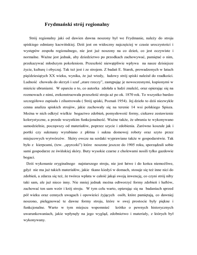 Frydmański strój regionalny Strój regionalny jaki od dawien dawna noszony był we Frydmanie, należy do stroju spiskiego odmiany kacwińskiej. Dziś jest on widoczny najczęściej w czasie uroczystości i występów zespołu regionalnego, nie jest już noszony na co dzień, co jest oczywiste i normalne. Ważne jest jednak, aby dziedzictwo po przodkach zachowywać, pamiętać o nim, przekazywać młodszym pokoleniom. Przeszłość niewątpliwie wpływa na nasze dzisiejsze życie, kulturę i obyczaj. Tak też jest i ze strojem. Z badań E. Starek, prowadzonych w latach pięćdziesiątych XX wieku, wynika, że już wtedy, ludowy strój spiski należał do rzadkości. Ludność chowała do skrzyń i szaf „stare rzeczy”, zastępując je nowoczesnymi, kupionymi w mieście ubraniami. W oparciu o to, co autorka zdołała u ludzi znaleźć, oraz opierając się na rozmowach z nimi, zrekonstruowała przeszłość stroju aż po ok. 1870 rok. To wszystko bardzo szczegółowo zapisała i zilustrowała ( Strój spiski, Poznań 1954). Jej dzieło to dziś niezwykle cenna analiza spiskich strojów, jakie zachowały się na terenie 14 wsi polskiego Spisza. Można w nich odkryć wielkie bogactwo zdobień, pomysłowość formy, ciekawe zestawienie kolorystyczne, a przede wszystkim funkcjonalność. Ważne także, że ubrania te wykonywano samodzielnie, począwszy od materiałów, poprzez szycie i zdobienia. Zarówno koszule jak i portki czy sukmany wyrabiano z płótna i sukna domowej roboty oraz szyto przez miejscowych wytwórców. Skóry owcze na serdaki wyprawiano także w gospodarstwie. Tak było z kierpcami, (tzw. „spyrcoki”) które noszone jeszcze do 1905 roku, sporządzali sobie sami gospodarze ze świńskiej skóry. Buty wysokie czarne z cholewami nosili tylko gazdowie bogaci. Dziś wykonanie oryginalnego najstarszego stroju, nie jest łatwe i do końca niemożliwe, gdyż nie ma już takich materiałów, jakie tkano kiedyś w domach, stosuje się też inne nici do zdobień, a zdarza się też, że twórca wplata w całość jakąś swoją inwencję, co czyni strój niby taki sam, ale już nieco inny. Nie mniej jednak można odtworzyć formy zdobień i haftów, zachować ten sam wzór i krój stroju. W tym celu warto, opierając się na badaniach sprzed pół wieku oraz cennych uwagach i opowieści żyjących osób, które pamiętają, co dawniej noszono, pielęgnować te dawne formy stroju, które w swej prostocie były piękne i funkcjonalne. Warto w tym miejscu wspomnieć krótko o pewnych historycznych uwarunkowaniach, jakie wpłynęły na jego wygląd, zdobnictwo i materiały, z których był wykonywany. Teren Spisza, jako teren przygraniczny, w ciągu swej ciekawej historii podlegał zmianom, jakie tu zachodziły w związku z przynależnością do różnych właścicieli i państw. Miały one wpływ również na wygląd ubrań. Różni się on od stroju regionów sąsiadujących i wykazuje wpływy obce, a mianowicie niemieckie i węgierskie, a nawet wołoskie. Wpływy węgierskie odbiły się głównie na terminologii, np. borytasy to pętlowe ozdoby spodni ( występowały m.in. w Krempachach, Łaszach Niżnych) ale na kroju także, chociażby wspomnieć kapelusze męskie, tzw. „węgierskie” – filcowe o szerokim do góry wywiniętym rondzie, kupowane w miastach spiskich, noszone np. w Niedzicy. Po 1920 roku, w momencie przyłączenia obszaru dzisiejszego Spisza do Polski, zaznaczyły się z kolei wpływy podhalańskie, nastąpiła zmiana źródła zakupu materiałów odzieżowych. O ile przedtem Spiszacy zaopatrywali się na terenie miast spiskich, jak Stara Wieś, Kieżmark, Lubownia, tak po 1920 roku przenieśli się z zakupami do Nowego Targu i Krościenka, gdzie nie zawsze znajdowali towary odpowiadające ich dotychczasowemu przyzwyczajeniu. Jednak przejęli nowe tkaniny i nieco inne fasony. Dość często zamiast tworzyć samodzielnie w domu, co było bardzo pracochłonne, kupowali gotowe ubrania, tańsze i wygodniejsze. Na terenie Polskiego Spisza, który obejmuje 14 wsi, wykształtowały się trzy odmiany stroju spiskiego, różniące się od siebie głównie zdobieniami i niektórymi elementami kroju. Są to odmiana trybska, jurgowska i kacwińska. Strój noszony we Frydmanie zaliczany jest do odmiany kacwińskiej. Mimo to, posiada elementy jedyne dla siebie, odmienne od pozostałych wiosek. Na codzienny strój kobiecy składały się: koszula bawełniana z rękawami długimi lub krótkimi. Koszula była dość krótka, sięgała nieco poniżej pasa. Rękaw uszyty był z całej „szerzyny” płótna. Pod pachą wszywano „ćwikle”. Rękawy dołem były marszczone, ujęte w obszywkę, która z kolei wykończona była koronką, szerszą (młode dziewczyny, które się bardziej stroiły) lub węższą (starsze kobiety). Szerokość przodu, tyłu i rękawów marszczono przy szyi, gdzie wszywano obszywkę, również wykończoną koronką. Koszula miała rozcięcie do połowy przodu, celem łatwiejszego włożenia przez głowę. Kolejny element stroju to spódnica zwana „kanafoską”, która jest najstarszą odmianą. Uszyta z pasiatego płótna o tle czerwonym, które odpowiednio tkane, przypominało atłas. W zależności od rozmieszczenia i rodzaju pasków nazywane były: „tęczowa”, „czerwona trojaka”, „czerwona czworaka”, „mieszana”. Fałdy ułożone były tak, że paski wzoru pasiaka trafiały w środek fałd, czyli były ukryte, a cała spódnica robiła wrażenie jednolicie czerwonej. Szyto je w ten sposób, żeby szerokość materiału stanowiła długość spódnicy. W pasie ułożona była w fałdy i wszyta w obszewkę. Przód „kanafoski” stanowił tzw. „przodek”, czyli płat z płótna lnianego. Używano jej zarówno na co dzień, jak i od święta. „Kanafoski” wyrabiano na terenie Spisza do I wojny światowej. Z początkiem XX wieku zaczęto nosić spódnice jednobarwne szyte z cienkiej wełenki, tzw. „śtofki” oraz kreton