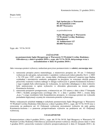 Konstancin-Jeziorna, 21 grudnia 2010 r. Bogna Janke (..................) Sąd Apelacyjny w Warszawie Pl. Krasińskich 2/4/6 00-207 Warszawa za pośrednictwem Sądu Okręgowego w Warszawie VI Wydział Cywilny RodzinnyOdwoławczy Al. Solidarności 127 00-898 Warszawa Sygn. akt: VI Ns 54/10 ZAŻALENIE na postanowienie Sądu Okręgowego w Warszawie VI Wydział Cywilny RodzinnyOdwoławczy z dnia 6 grudnia 2010 r., sygn. akt VI Ns 54/10, doręczonego wraz z uzasadnieniem w dniu 16 grudnia 2010 r. Jako wnosząca protest wyborczy zaskarżam powyższe postanowienie w całości, zarzucając mu: 1. naruszenie przepisu prawa materialnego, a mianowicie przepisu art. 58 ust. 3 Ordynacji wyborczej do rad gmin, rad powiatów i sejmików wyborczych (tekst jednolity Dz.U. z 2003 r. Nr 159, poz. 1547, z późn. zm., zwana dalej „Ordynacją wyborczą”) poprzez jego błędną wykładnię i niewłaściwe ustalenie, polegające na przyjęciu, że wnosząca złożyła protest przeciwko ważności wyboru radnego w okręgu wyborczym w gminie Konstancin-Jeziorna i z tego względu była zobowiązana do wykazania, że nazwisko składającej w dniu wyborów było umieszczone w spisie wyborców w obwodzie głosowania na terenie gminy Konstancin-Jeziorna; 2. naruszenie przepisów postępowania, a mianowicie art. 233 ustawy z dnia z dnia 17 listopada 1964 r. Kodeks postępowania cywilnego (Dz. U. z dnia 1 grudnia 1964 r., zwana dalej „k.p.c.”) czego rezultatem było bezpodstawne przyjęcie, że wnosząca protest nie wykazała posiadania legitymacji czynnej do wniesienia protestu wyborczego. Wobec wskazanych uchybień wnoszę o uchylenie postanowienia Sądu Okręgowego w Warszawie VI Wydział Cywilny Rodzinny-Odwoławczy z dnia 6 grudnia 2010 r., sygn. akt VI Ns 54/10 oraz o orzeczenie na podstawie art. 61 Ordynacji wyborczej nieważności wyborów do rady gminy Konstancin-Jeziorna i o ponowne przeprowadzanie wyborów na podstawie art. 63 Ordynacji wyborczej. UZASADNIENIE Postanowieniem z dnia 6 grudnia 2010 r., sygn. akt VI Ns 54/10, Sąd Okręgowy w Warszawie VI Wydział Cywilny Rodzinny-Odwoławczy pozostawił protest wyborczy złożony przeze mnie w dniu 3 grudnia 2010 r. przeciwko ważności wyborów przeprowadzonych w dniu 21 listopada 2010 r. do rady gminy Konstancin-Jeziorna bez dalszego biegu. W uzasadnieniu Sąd wskazał, że powyższy protest nie może zostać rozpoznany wobec nie wskazania legitymacji czynnej przez wnoszącą protest. Z przepisu art. 58 ust. 3 Ordynacji wyborczej wynika, że uprawnienie do wniesienia protestu posiada wyborca, którego nazwisko w dniu wyborów było umieszczone w spisie wyborców w jednym z obwodów głosowania na obszarze danego okręgu wyborczego. Ponadto Sąd wskazał, że powyższa okoliczność nie została przez wnoszącą protest wskazana. W związku z powyższym, z uwagi na to, że do postępowania w sprawach protestów wyborczych nie ma zastosowania art. 130 § 1 k.p.c., Sąd na podstawie art. 60 ust. 2 Ordynacji wyborczej postanowił o pozostawieniu protestu wyborczego bez dalszego biegu. Z takim rozstrzygnięciem Sądu nie można się zgodzić. I. W pierwszej kolejności należy podnieść, że zgodnie z treścią protestu wyborczego z dnia 3 grudnia 2010 r., wniosłam protest przeciwko ważności wyborów do rady gminy Konstancin-Jeziorna z uwagi na naruszenie przepisów ustawy Ordynacja wyborcza dotyczących głosowania, ustalenia wyników głosowania lub wyników wyborów (art. 58 ust. 1 pkt 2 Ordynacji wyborczej). Naruszenie to polegało na złamaniu przepisów dotyczących podziału gminy Konstancin-Jeziorna na okręgi wyborcze oraz przepisów nakładających na władze samorządowego obowiązek odpowiedniego poinformowania wyborców o granicach okręgów wyborczych. Wybory do rady gminy Konstancin-Jeziorna w przedmiotowej sprawie odbyły się w oparciu o uchwałę Rady Miejskiej Konstancin-Jeziorna z dnia 5 lipca 2010 r., która w świetle prawa nie ma charakteru obowiązującego aktu prawa miejscowego. Doszło bowiem do naruszenia art. 92 ust. 3 Ordynacji wyborczej. Nie dokonano ogłoszenia uchwały rady gminy w sprawie okręgów wyborczych w Dzienniku Urzędowym Województwa Mazowieckiego oraz nie podano jej do publicznej wiadomości w sposób zwyczajowo przyjęty. Dokonana korekta granic okręgu wyborczego jest zatem nieważna w świetle prawa. W konsekwencji spowodowało to istotne zakłócenie wyniku wyborów do rady gminy Konstancin-Jeziorna. Należy zatem zdecydowanie podkreślić, że przedmiotowy protest wyborczy nie został złożony przeciwko ważności wyboru radnego w wyborach samorządowych (art. 58 ust. 1 in fine Ordynacji wyborczej). Z tego względu w niniejszej sprawie nie ma zastosowania przepis art. 58 ust. 3 Ordynacji wyborczej. Wnosząca protest oparła swoje zarzuty na art. 58. ust 1 pkt 2 Ordynacji wyborczej. Z tego względu protest ten może być przedmiotem merytorycznego rozpoznania przez sąd w ramach specjalnej procedury, uregulowanej w rozdziale 10 Ordynacji wyborczej „Protesty wyborcze. Ważność wyborów” (postanowienie Sądu Apelacyjnego w Katowicach z dnia 10 stycznia 2007 r., sygn. akt ACz 1/07, LEX nr 337309). II. W świetle powyższego, zgodnie z art. 58 ust. 2 Ordynacji wyborczej protest wyborczy przeciwko ważności wyborów do rady gminy Konstancin-Jeziorna, którego podstawę stanowi zarzut naruszenia przez organy wyborcze przepisów ustawy dotyczących ustalenia wyników głosowania lub wyników wyborów, może wnieść każdy wyborca zamieszkały na obszarze działania tej rady. Zgodnie z przepisami Ordynacji wyborczej osoba wnosząca protest obowiązana jest nie tylko sformułować w nim zarzuty, ale również przedstawić dowody, gdy takowe posiada, lub wskazać je, gdy nie pozostają w jego dyspozycji (postanowienie Sądu Apelacyjnego w Katowicach z dnia 30 stycznia 2003 r., sygn. akt I ACz 130/03, OSA 2003/11/52). Regulacja z art. 59 ust. 2 wyklucza więc możliwość odpowiedniego stosowania art. 130 