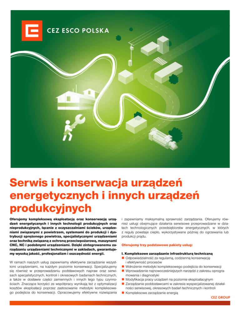 CEZ ESCO POLSK A Serwis i konserwacja urządzeń energetycznych i innych urządzeń produkcyjnych Oferujemy kompleksową eksploatację oraz konserwację urządzeń energetycznych i innych technologii produkcyjnych oraz nieprodukcyjnych, łącznie z oczyszczalniami ścieków, urządzeniami związanymi z powietrzem, systemami do produkcji i dystrybucji sprężonego powietrza, specjalistycznymi urządzeniami oraz techniką związaną z ochroną przeciwpożarową, maszynami CNC, NC i podobnymi urządzeniami. Dzięki zintegrowanemu zarządzaniu urządzeniami technicznymi w zakładach, gwarantujemy wysoką jakość, profesjonalizm i oszczędność energii. W ramach naszych usług zapewniamy efektywne zarządzanie wszystkimi urządzeniami, na każdym poziomie konserwacji. Specjalizujemy się również w przeprowadzaniu podstawowych napraw oraz serwisach specjalistycznych, kontroli i okresowych badaniach technicznych, a także w dostawie części zamiennych i innych tego typu czynnościach. Znaczące korzyści ze współpracy wynikają też z optymalizacji kosztów eksploatacji poprzez zastosowanie metodyki kompleksowego podejścia do konserwacji. Opracowujemy efektywne rozwiązania i zapewniamy maksymalną sprawność zarządzania. Oferujemy również usługi obejmujące działania serwisowe przeprowadzane w działach technologicznych przedsiębiorstw energetycznych, w których z reguły powstaje ciepło, wykorzystywane później do ogrzewania lub produkcji prądu. Oferujemy trzy podstawowe pakiety usług: I. Kompleksowe zarządzanie infrastrukturą techniczną Odpowiedzialność za regularną, codzienną konserwację i efektywność procesów Wdrożenie metodyki kompleksowego podejścia do konserwacji Wprowadzenie najnowocześniejszych narzędzi z zakresu oprogramowania i diagnostyki Modyfikacja pracy urządzeń na poziomie eksploatacyjnym Zarządzanie poddostawcami w zakresie wyspecjalizowanej działalności serwisowej, okresowych badań technicznych i kontroli Kompleksowe zarządzanie energią CEZ GROUP II. Profesjonalna działalność serwisowa Badanie funkcjonowania eksploatowanych urządzeń (diagnostyka, pomiary, szczegółowe przeglądy) Gwarancyjna i pogwarancyjna działalność serwisowa Regularny serwis urządzeń technicznych Naprawy i konserwacja urządzeń technicznych Konserwacja prewencyjna i inspekcje Referencje Konserwacja urządzeń technicznych i maszyn w zakładach produkcji papieru CEREPA, a.s. ČEZ ESCO, a.s., za pośrednictwem swojej spółki zależnej ČEZ Energetické služby zapewnia w zakładzie produkcyjnym CEREPA, a.s., kompleksową konserwację maszyn i urządzeń technicznych. Najwyższy standard wykonywanej pracy, dzięki doskonale wykwalifikowanym pracownikom, znacząco obniża prawdopodobieństwo przestojów technologicznych, a tym samym minimalizuje wynikające z nich straty w produkcji. W związku z powyższym w ramach realizacji projektu ČEZ ESCO wprowadza wysoce intuicyjny system konserwacji oraz bierze udział w modernizacji technologii i całego terenu. Równocześnie firma ČEZ ESCO przejęła całą odpowiedzialność za optymalizację systemu energetycznego. W ciągu zaledwie 6 miesięcy przeprowadzone optymalizacje przyniosły oszczędności rzędu kilku milionów koron. III. Audyty procesowe Ocena aktualnych rozwiązań z punktu widzenia parametrów eksploatacyjnych, ekonomicznych i jakościowych Projektowanie i zarządzanie optymalizacjami i zmianami Doradztwo w zakresie wykonywania usług Korzyści: Obniżenie kosztów związanych z energią Wzrost niezawodności maszyn i urządzeń oraz obniżenie liczby przestojów technologicznych Wprowadzenie intuicyjnego systemu konserwacji Ustabilizowanie i wzmocnienie jakościowe zespołu Dane podstawowe Klient: CEREPA, a.s., Červená Řečice Realizowane usługi: Kompleksowe zarządzanie techniczne i konserwacja, utrzymanie technologii produkcyjnych i maszyn, energetyka, dostawy mediów Kontakt W przypadku zainteresowania ofertą prosimy o kontakt z naszym przedstawicielem handlowym. Wszystkich nowych Klientów uprzejmie prosimy o korzystanie z podanych obok kontaktów. CEZ ESCO Polska sp. z o.o. Al. Jerozolimskie 61, 00-697 Warszawa telefon: +48 22 218 01 41, fax: + 48 22 218 01 40 e-mail: [email protected] www.cezpolska.pl Treści tutaj zawarte nie stanowią oferty handlowej w rozumieniu art. 66 Kodeksu cywilnego, a są jedynie informacją w rozumieniu art. 71 Kodeksu cywilnego. CEZ ESCO Polska sp. z o.o. z siedzibą w Warszawie zastrzega, że wszelkie przedstawione wyżej inwestycje zostały zaprojektowane i wykonane przez spółkę ČEZ ESCO, a.s. z siedzibą w Pradze, w ramach jej działalności. Jednocześnie zastrzega, że żaden fragment niniejszej publikacji nie może być powielany lub rozpowszechniany w jakiejkolwiek formie i w jakikolwiek sposób bez zezwolenia. Wszelkie znaki towarowe, znaki graficzne, nazwy własne, logotypy i inne dane są chronione na podstawie przepisów ustawy o prawie autorskim i prawach pokrewnych, ustawy prawo własności przemysłowej, a także innych ustaw.