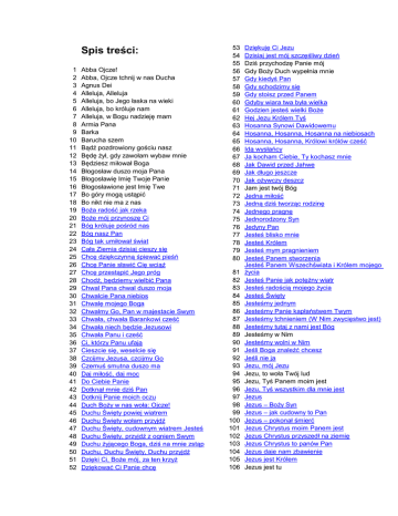 Spis treści: 1 2 3 4 5 6 7 8 9 10 11 12 13 14 15 16 17 18 19 20 21 22 23 24 25 26 27 28 29 30 31 32 33 34 35 36 37 38 39 40 41 42 43 44 45 46 47 48 49 50 51 52 Abba Ojcze! Abba, Ojcze tchnij w nas Ducha Agnus Dei Alleluja, Alleluja Alleluja, bo Jego łaska na wieki Alleluja, bo króluje nam Alleluja, w Bogu nadzieję mam Armia Pana Barka Barucha szem Bądź pozdrowiony gościu nasz Będę żył, gdy zawołam wybaw mnie Będziesz miłował Boga Błogosław duszo moja Pana Błogosławię Imię Twoje Panie Błogosławione jest Imię Twe Bo góry mogą ustąpić Bo nikt nie ma z nas Boża radość jak rzeka Boże mój przynoszę Ci Bóg króluje pośród nas Bóg nasz Pan Bóg tak umiłował świat Cała Ziemia dzisiaj cieszy się Chcę dziękczynną śpiewać pieśń Chcę Panie sławić Cię wciąż Chcę przestąpić Jego próg Chodź, będziemy wielbić Pana Chwal Pana chwal duszo moja Chwalcie Pana niebios Chwalę mojego Boga Chwalmy Go, Pan w majestacie Swym Chwała, chwała Barankowi cześć Chwała niech będzie Jezusowi Chwała Panu i cześć Ci, którzy Panu ufają Cieszcie się, weselcie się Czcijmy Jezusa, czcijmy Go Czemuś smutna duszo ma Daj miłość, daj moc Do Ciebie Panie Dotknął mnie dziś Pan Dotknij Panie moich oczu Duch Boży w nas woła: Ojcze! Duchu Święty powiej wiatrem Duchu Święty wołam przyjdź Duchu Święty, cudownym wiatrem Jesteś Duchu Święty, przyjdź z ogniem Swym Duchu żyjącego Boga, dziś na mnie zstąp Duchu, Duchu Święty, Duchu przyjdź Dzięki Ci, Boże mój, za ten krzyż Dziękować Ci Panie chcę 53 54 55 56 57 58 59 60 61 62 63 64 65 66 67 68 69 70 71 72 73 74 75 76 77 78 79 80 81 82 83 84 85 86 87 88 89 90 91 92 93 94 95 96 97 98 99 100 101 102 103 104 105 106 Dziękuję Ci Jezu Dzisiaj jest mój szczęśliwy dzień Dziś przychodzę Panie mój Gdy Boży Duch wypełnia mnie Gdy kiedyś Pan Gdy schodzimy się Gdy stoisz przed Panem Gdyby wiara twa była wielka Godzien jesteś wielki Boże Hej Jezu Królem Tyś Hosanna Synowi Dawidowemu Hosanna, Hosanna, Hosanna na niebiosach Hosanna, Hosanna, Królowi królów cześć Idą wysłańcy Ja kocham Ciebie, Ty kochasz mnie Jak Dawid przed Jahwe Jak długo jeszcze Jak ożywczy deszcz Jam jest twój Bóg Jedna miłość Jedną dziś tworząc rodzinę Jednego pragnę Jednorodzony Syn Jedyny Pan Jesteś blisko mnie Jesteś Królem Jesteś mym pragnieniem Jesteś Panem stworzenia Jesteś Panem Wszechświata i Królem mojego życia Jesteś Panie jak potężny wiatr Jesteś radością mojego życia Jesteś Święty Jesteśmy jednym Jesteśmy Panie kapłaństwem Twym Jesteśmy tchnieniem (W Nim zwycięstwo jest) Jesteśmy tutaj z nami jest Bóg Jesteśmy w Nim Jesteśmy wolni w Nim Jeśli Boga znaleźć chcesz Jeśli nie ja Jezu, mój Jezu Jezu, to woła Twój lud Jezu, Tyś Panem moim jest Jezu, Tyś wszystkim dla mnie jest Jezus Jezus – Boży Syn Jezus – jak cudowny to Pan Jezus – pokonał śmierć Jezus Chrystus moim Panem jest Jezus Chrystus przyszedł na ziemię Jezus Chrystus to panów Pan Jezus daje nam zbawienie Jezus jest Królem Jezus jest tu 107 108 109 110 111 112 113 114 115 116 117 118 119 120 121 122 123 124 125 126 127 128 129 130 131 132 133 134 135 136 137 138 139 140 141 142 143 144 145 146 147 148 149 150 151 152 153 154 155 156 157 158 159 160 161 Jezus jest mym Panem, mym Mistrzem i Zbawcą Jezus moją siłą Jezus mój dobry jest Jezus najwyższe Imię Jezus najwyższej godzien chwały Jezus żyje! Jezus, o Jezus Królem naszym jest Jubilate deo Już się nie lękaj Już teraz we mnie kwitną Twe ogrody Każdego dnia Każdy dzień upewnia mnie Każdy wschód słońca Kiedy Bóg zaczyna działać Kocham, więc nie muszę się bać Któż jest Bogiem KUMBAYAH...(Przyjdźcie do Źródła) Magnificat Memu Bogu Królowi będę śpiewał tę pieśń Miłość Bożą w sercu swym Miłość da Misericordias Domini Mój Bóg jest źródłem mego życia Mój Jezu, mój Zbawco Mój Jezus Królem królów jest Mój Pan Bogiem moim jest Mój Pan żyje! Na wieki Na wieki żyjącemu Nie bój się Nie jesteś sam Nie ma takich gorzkich łez Nie mam nic Nie nam, lecz Twemu Imieniu Nie parę drobnych monet Nie zasypia Jahwe Nie żałuję Niebo to najwspanialsze z miejsc Niech będzie chwała i cześć Niech Pan udzieli mocy Niech przyjmie chwałę i cześć Niech twa wiara Niech Twój Święty Duch Niechaj zstąpi Duch Twój Nowe stworzenie to jestem ja O mój Jezu O klaszczcie wraz wszyscy ludzie O Panie szukasz dzieci Twych O Piękności niestworzona O wstań, błogosław Bogu dziś O, niebo jest w sercu mym Oblubieniec czeka już Oddaję Ci całą chwałę i cześć Oddajmy Bogu cześć i chwałę Oddychać Tobą chcę 162 163 164 165 166 167 168 169 170 171 172 173 174 175 176 177 178 179 180 181 182 183 184 185 186 187 188 189 190 191 192 193 194 195 196 197 198 199 200 201 202 203 204 205 206 207 208 209 210 211 212 213 214 215 216 Ofiaruję Tobie Panie Mój Ojcze chwała Tobie Ojcze błogosławię święte dzieła Twe On może Oto jest dzień, który dał nam Pan Otwórz me oczy Otwórz me oczy o Panie Otwórz okna swego serca i patrz Oznajmiono ci, człowiecze Pan blisko jest Pan jest wśród nas Pan pasterzem moim Pan mnie strzeże Pan Światłem mym Pan wywyższony Pan Zastępów Adonai Panie będę wielbić Cię Panie mój Panie mój przychodzę dziś Panie mów, bo sługa Twój słucha Panie nasz i Stwórco Panie proszę zabierz mnie Panie sercem swym Panie Ty jesteś moim źródłem Panie, Twój tron Panu chwała i cześć Panu Naszemu pieśni grajcie Pozwól mi przyjść do Twej rzeki, Panie mój! Póki mego życia Prawda jedyna Prawdziwie żyje Pan Przed obliczem Pana uniżmy się Przed tronem Twym stoimy Przybądź Duchu Święty – Sekwencja Przychodzimy Panie dziś do ciebie Przychodzimy pod Górę Syjon Przyjaciela mam Przyjdź do Jezusa, oddaj Mu życie swe Przyjdź i sprawdź Przyjdźmy tam, gdzie miejsce najświętsze Przyszedł bezbronny na świat Przyznajcie Pa