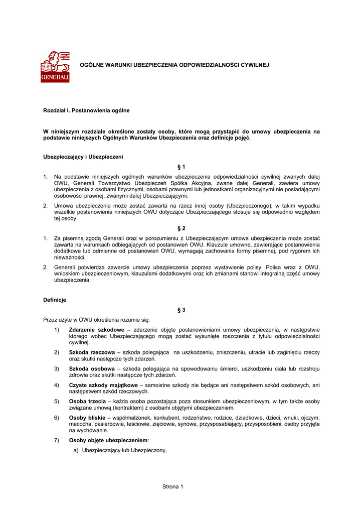 OGÓLNE WARUNKI UBEZPIECZENIA ODPOWIEDZIALNOŚCI CYWILNEJ Rozdział I. Postanowienia ogólne W niniejszym rozdziale określone zostały osoby, które mogą przystąpić do umowy ubezpieczenia na podstawie niniejszych Ogólnych Warunków Ubezpieczenia oraz definicje pojęć. Ubezpieczający i Ubezpieczeni §1 1. Na podstawie niniejszych ogólnych warunków ubezpieczenia odpowiedzialności cywilnej zwanych dalej OWU, Generali Towarzystwo Ubezpieczeń Spółka Akcyjna, zwane dalej Generali, zawiera umowy ubezpieczenia z osobami fizycznymi, osobami prawnymi lub jednostkami organizacyjnymi nie posiadającymi osobowości prawnej, zwanymi dalej Ubezpieczającymi. 2. Umowa ubezpieczenia może zostać zawarta na rzecz innej osoby (Ubezpieczonego); w takim wypadku wszelkie postanowienia niniejszych OWU dotyczące Ubezpieczającego stosuje się odpowiednio względem tej osoby. §2 1. Za pisemną zgodą Generali oraz w porozumieniu z Ubezpieczającym umowa ubezpieczenia może zostać zawarta na warunkach odbiegających od postanowień OWU. Klauzule umowne, zawierające postanowienia dodatkowe lub odmienne od postanowień OWU, wymagają zachowania formy pisemnej, pod rygorem ich nieważności. 2. Generali potwierdza zawarcie umowy ubezpieczenia poprzez wystawienie polisy. Polisa wraz z OWU, wnioskiem ubezpieczeniowym, klauzulami dodatkowymi oraz ich zmianami stanowi integralną część umowy ubezpieczenia. Definicje §3 Przez użyte w OWU określenia rozumie się: 1) Zdarzenie szkodowe – zdarzenie objęte postanowieniami umowy ubezpieczenia, w następstwie którego wobec Ubezpieczającego mogą zostać wysunięte roszczenia z tytułu odpowiedzialności cywilnej. 2) Szkoda rzeczowa – szkoda polegająca na uszkodzeniu, zniszczeniu, utracie lub zaginięciu rzeczy oraz skutki następcze tych zdarzeń. 3) Szkoda osobowa – szkoda polegająca na spowodowaniu śmierci, uszkodzeniu ciała lub rozstroju zdrowia oraz skutki następcze tych zdarzeń. 4) Czyste szkody majątkowe – samoistne szkody nie będące ani następstwem szkód osobowych, ani następstwem szkód rzeczowych. 5) Osoba trzecia – każda osoba pozostająca poza stosunkiem ubezpieczeniowym, w tym także osoby związane umową (kontraktem) z osobami objętymi ubezpieczeniem. 6) Osoby bliskie – współmałżonek, konkubent, rodzeństwo, rodzice, dziadkowie, dzieci, wnuki, ojczym, macocha, pasierbowie, teściowie, zięciowie, synowe, przysposabiający, przysposobieni, osoby przyjęte na wychowanie. 7) Osoby objęte ubezpieczeniem: a) Ubezpieczający lub Ubezpieczony, Strona 1 b) obecni i byli pełnomocnicy oraz pracownicy Ubezpieczającego lub Ubezpieczonego w zakresie szkód wyrządzonych w związku z wykonywaniem czynności służbowych na ich rzecz lub czynności objętych zakresem umocowania. 8) Franszyza redukcyjna – kwota, o którą zmniejsza się wysokość wypłacanego odszkodowania. Wszystkie szkody, których wartość nie przekracza kwoty franszyzy redukcyjnej nie są objęte ubezpieczeniem. 9) Szkoda seryjna – wszystkie szkody będące następstwem tego samego zdarzenia albo wynikające z tej samej przyczyny, niezależnie od liczby osób poszkodowanych. 10) Pracownik – osoba zatrudniona na podstawie umowy o pracę, powołania, wyboru, mianowania lub spółdzielczej umowy o pracę lub też świadcząca pracę na podstawie umowy cywilnoprawnej, jeżeli Ubezpieczający, na rzecz którego świadczy pracę jest w stosunku do niej płatnikiem składek z tytułu ubezpieczeń społecznych. 11) Wartości pieniężne – krajowe i zagraniczne znaki pieniężne, czeki, weksle i inne dokumenty zastępujące w obrocie gotówkę oraz złoto, srebro i wyroby z tych metali, kamienie szlachetne i perły, a także platyna i pozostałe metale z grupy platynowców. 12) Produkty – wszystkie rzeczy lub ich części, mogące stanowić przedmiot obrotu (towar) wraz z wyposażeniem, oprzyrządowaniem i opakowaniem. 13) Dostarczenie produktu – faktyczne przekazanie produktu przez Ubezpieczającego osobie trzeciej. W przypadku wątpliwości za moment dostarczenia uznaje się moment, w którym Ubezpieczający utracił faktyczne władztwo dysponowania rzeczą, tzn. możliwość decydowania o produkcie lub jego wykorzystaniu. 14) Produkt niebezpieczny – produkt nie zapewniający bezpieczeństwa, jakiego można oczekiwać uwzględniając normalne użycie produktu i okoliczności z chwili wprowadzenia go do obrotu, a zwłaszcza sposób zaprezentowania go na rynku oraz podane informacje o właściwościach produktu. 15) Sublimit – ustalony limit kwotowy lub procentowy w granicach sumy ubezpieczenia, dotyczący określonego ryzyka, ograniczający odpowiedzialność Generali z tytułu tego ryzyka. 16) Polisa – każdy dokument potwierdzający zawarcie umowy ubezpieczenia. Rozdział II. Przedmiot i zakres ubezpieczenia W niniejszym rozdziale określony został przedmiot i zakres ochrony ubezpieczeniowej udzielonej przez Generali na podstawie niniejszych OWU oraz zdarzenia, za które Generali nie ponosi odpowiedzialności (wyłączenia). Przedmiot i zakres ubezpieczenia §4 1. Przedmiotem ubezpieczenia jest ustawowa odpowiedzialność cywilna osób objętych ochroną ubezpieczeniową za szkody osobowe lub rzeczowe wyrządzone osobom trzecim w związku z prowadzeniem działalności lub posiadanym mieniem określonymi w umowie ubezpieczenia. 2. O ile strony nie umówiły się inaczej, ochroną ubezpieczeniową objęta jest także odpowiedzialność cywilna Ubezpieczającego za szkody osobowe i rzeczowe wyrządzone przez określony w polisie produkt niebezpieczny lub wadliwy, po jego dostarczeniu lub wadliwie wykonaną pracę, po jej zakończeniu (wada może odnosić się w szczególności do koncepcji, projektu, wykonania, obróbki lub opracowania, naprawy, składowania, dostarczenia, również błędnej dostawy, instrukcji obsługi). 3. O ile strony nie umówiły się inaczej, ochroną ubezpieczeniową objęte jest zdarzenie szkodowe, które wystą