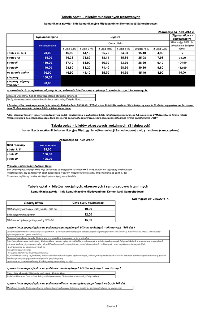 Tabela opłat - biletów miesięcznych trasowanych komunikacja zwykła - linie komunikacyjne Międzygminnej Komunikacji Samochodowej Ogólnodostępne Obowiązuje od 7.09.2014 r. Ulga handlowa samorządowa Ulgowe z ulgą 33% z ulgą 37% z ulgą 49% z ulgą 51% z ulgą 78% z ulgą 93% Bilet z ulgą 20% dla mieszkańca Związku Gmin strefa I st. kl. # 70,00 46,90 44,10 35,70 34,30 15,40 4,90 x Cena biletu cena normalna strefa I i II 114,00 76,38 71,82 58,14 55,86 25,08 7,98 91,20 strefa III 130,00 87,10 81,90 66,30 63,70 28,60 9,10 104,00 strefa IV 140,00 93,80 88,20 71,40 68,60 30,80 9,80 112,00 na terenie gminy 70,00 46,90 44,10 35,70 34,30 15,40 4,90 56,00 sieciowy sieciowy ulgowy imienny * 160,00 107,20 100,80 81,60 78,40 35,20 11,20 90,00 uprawnienia do przejazdów ulgowych na podstawie biletów samorządowych – miesięcznych trasowanych: Dzieci po ukończeniu 4 lat do czasu rozpoczęcia obowiązku szkolnego Osoby niepełnosprawne z narządem słuchu – mieszkańcy Związku Gmin # Pasażer, który przed wejściem w życie uchwały Związku Gmin PKS Nr II/115/2014 z dnia 22.08.2014 posiadał bilet miesięczny w cenie 70 zł lub z ulgą ustawową liczoną od ceny 70 zł ma prawo do nabycia biletu w takiej samej cenie. * Bilet sieciowy imienny ulgowy sprzedawany na podst. oświadczenia o wykupieniu biletu miesięcznego trasowanego lub sieciowego ZTM Rzeszów na terenie miasta Rzeszowa wraz z dołączoną kserokopią tego biletu oraz dokumentu potwierdzającyego adres zamieszkania na terenie Związku Gmin „PKS” Tabela opłat - biletów okresowych rodzinnych (31 dniowych) komunikacja zwykła - linie komunikacyjne Międzygminnej Komunikacji Samochodowej z ulgą handlową (samorządową) Obowiązuje od 7.09.2014 r. Bilet rodzinny cena normalna strefa I i II 99,00 strefa III 106,00 strefa IV 125,00 Pracujący mieszkańcy Związku Gmin Bilet okresowy rodzinny uprawnia jego posiadacza do przejazdów na liniach MKS wraz z członkami najbliższej rodziny (dzieci, współmałżonek) bez dodatkowych opłat całodobowo w soboty, niedziele i święta oraz w dni powszednie po godz. 17-tej. Członkowie najbliższej rodziny winni być zgłoszeni przy zakupie biletu. Tabela opłat - biletów socjalnych, okresowych i samorządowych gminnych komunikacja zwykła - linie komunikacyjne Międzygminnej Komunikacji Samochodowej Obowiązuje od 7.09.2014 r. Rodzaj biletu Cena biletu normalnego Bilet socjalny okresowy ważny maks. 365 dni 10,00 Bilet socjalny miesięczny 12,00 Bilet samorządowy gminny ważny 365 dni 15,00 uprawnienia do przejazdów na podstawie samorządowych biletów socjalnych – okresowych (365 dni ). Osoby niepełnosprawne - mieszkańcy Związku Gmin - z orzeczeniem określającym znaczny stopień niepełnosprawności lub całkowitą niezdolność do pracy i samodzielnej egzystencji (dawna I grupa inwalidzka) Niewidomi mieszkańcy Związku Gmin wraz z przewodnikiem towarzyszącym im w pojeździe Dzieci niepełnosprawne - mieszkańcy Związku Gmin - uczęszczające do oddziałów przedszkolnych w szkołach podstawowych lub przedszkolach oraz uczniowie o specjalnych potrzebach edukacyjnych uczęszczający do szkół podstawowych, gimnazjalnych, ponad gimnazjalnych i policealnych wraz z opiekunem, który podróżuje: - z uprawnionym, po uprawnionego lub po odwiezieniu uprawnionego - wyłącznie na trasie od miejsca zamieszkania do placówki oświatowej i z powrotem, oraz do ośrodków rehabilitacyjno-wychowawczych, domów pomocy społecznych ośrodków wsparcia, zakładów opieki zdrowotnej, poradni Psychologiczno-pedagogicznej w tym poradni specjalistycznej (opiekunem na podstawie odrębnej EM-karty osoby uprawnionej do ulgi) uprawnienia do przejazdów na podstawie samorządowych biletów socjalnych miesięcznych. Osoby, które ukończyły 70 lat życia, - mieszkańcy Związku Gmin Zasłużeni Honorowi Dawcy Krwi, którzy oddali co najmniej 20 litrów krwi- mieszkańcy Związku Gmin uprawnienia do przejazdów na podstawie biletów samorządowych gminnych ważnych 365 dni. Mieszkańcy Związku Gmin na podstawie dokumentu potwiedzającego tożsamość pasażera i adres zamieszkania na terenie gmin Strona 1
