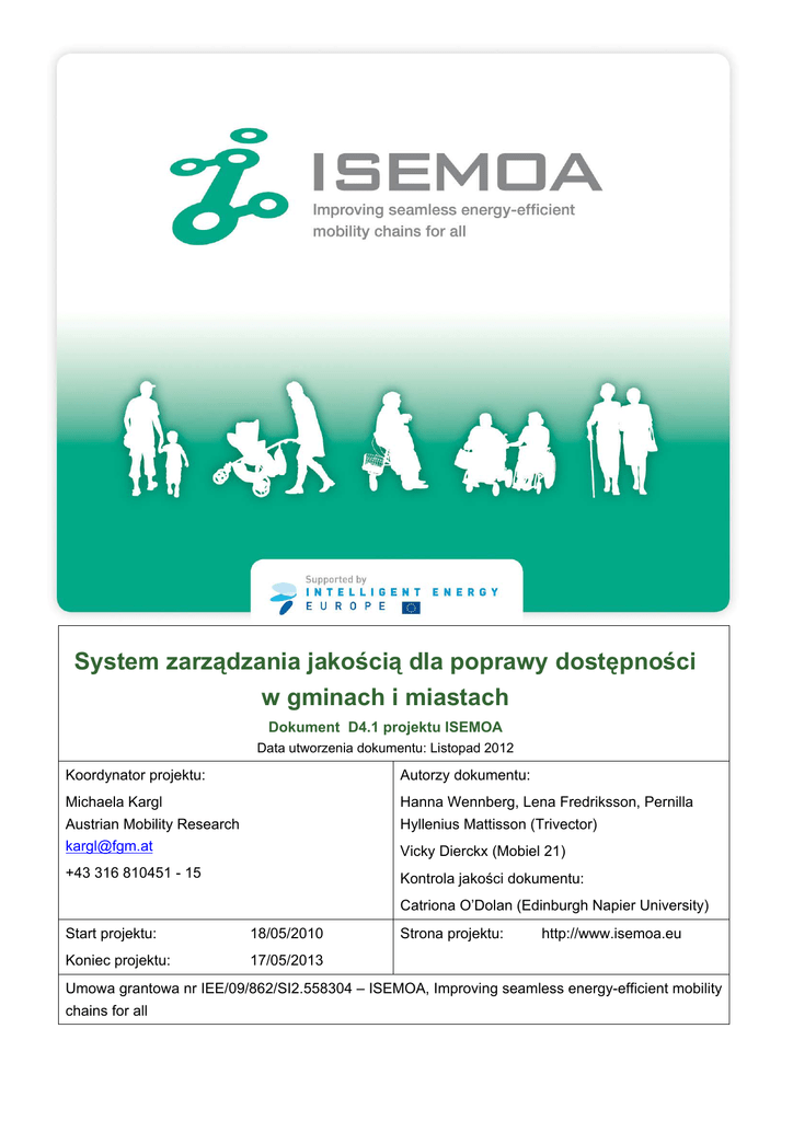 System zarządzania jakością dla poprawy dostępności w gminach i miastach Dokument D4.1 projektu ISEMOA Data utworzenia dokumentu: Listopad 2012 Koordynator projektu: Autorzy dokumentu: Michaela Kargl Hanna Wennberg, Lena Fredriksson, Pernilla Austrian Mobility Research [email protected] Hyllenius Mattisson (Trivector) +43 316 810451 - 15 Kontrola jakości dokumentu: Vicky Dierckx (Mobiel 21) Catriona O’Dolan (Edinburgh Napier University) Start projektu: 18/05/2010 Koniec projektu: 17/05/2013 Strona projektu: http://www.isemoa.eu Umowa grantowa nr IEE/09/862/SI2.558304 – ISEMOA, Improving seamless energy-efficient mobility chains for all Zastrzeżenia prawne: Wyłączna odpowiedzialność za treść niniejszej publikacji leży po stronie jej autorów. Nie odzwierciedla ona opinii Unii Europejskiej. Ani EACI ani Komisja Europejska nie ponoszą odpowiedzialności za wykorzystanie zawartych tu informacji. Projekt ISEMOA jest współfinansowany przez Unię Europejską w ramach programu IEE 2009 STEER. Inteligentna Energia – Europa STEER SPIS TREŚCI 1 O projeckie ISEMOA............................................................................................ 4 1.1 Konsorcjum ISEMOA: .......................................................................................... 5 2 wprowadzenie ...................................................................................................... 6 3 system zarządzania jakością ISEMOA QMS ....................................................... 8 3.1 Zakres .................................................................................................................. 8 3.2 Pojęcia i definicje ................................................................................................. 8 3.3 Wymogi dotyczące zarządzania jakością w dostępności................................... 11 3.3.1 Kryteria jakości ............................................................................................... 11 3.3.2 Fazy rozwoju w zarządzaniu jakością w dostępności .................................... 17 3.4 4 Wdrożenie i ocena ............................................................................................. 19 3.4.1 Etapy w procesie wdrożenia systemu ISEMOA QMS .................................... 19 3.4.2 Czas trwania i niezbędne nakłady czasu ....................................................... 24 3.4.3 Role i zadania zaangażowanych interesariuszy............................................. 24 3.4.4 Certyfikacja .................................................................................................... 26 3.4.5 Kwalifikacje Audytorów ISEMOA.................................................................... 26 Uwagi końcowe.................................................................................................. 27 System zarządzania jakością ISEMOA QMS dla gmin i miast Strona 3 Inteligentna Energia – Europa STEER 1 O PROJECKIE ISEMOA Projekt ISEMOA – Wolna od barier i energooszczędna mobilność (Improving seamless energy-efficient mobility chains for all) rozpoczął się w maju 2010 r. Projekt trwa 3 lata i jest współfinansowany przez Komisję Europejską w ramach programu IEE (Inteligentna Energia – Europa). Celem projektu ISEMOA jest pomoc władzom na szczeblu lokalnym i regionalnym w Europie w zwiększeniu energooszczędności w transporcie poprzez poprawę dostępności przestrzeni i transportu publicznego w perspektywie „od drzwi do drzwi” i umożliwienie mieszkańcom oraz turystom (również osobom z ograniczonymi możliwościami poruszania się – PRM – People with Reduced Mobility) poruszania się bez samochodu. Ponadto poprawa dostępności przestrzeni i transportu publicznego podnosi jakość i atrakcyjność transportu publicznego i przyczynia się do wzrostu bezpieczeństwa pieszych i rowerzystów. Aby osiągnąć ten cel, w ramach projektu ISEMOA opracowywany jest system zarządzania jakością (ISEMOA QMS) służący ciągłej poprawie dostępności w perspektywie „od drzwi do drzwi” w europejskich gminach/miastach/regionach. ISEMOA QMS jest zbudowany na bazie dostępnych już i wdrożonych z sukcesem systemów BYPAD, MaxQ i MEDIATE. W centrum systemu ISEMOA QMS znajduje się moderowany proces audytu. Audyt ma na celu pomoc lokalnym i regionalnym interesariuszom wspólnie z Audytorem zewnętrznym ocenić prace nad zwiększeniem dostępności przestrzeni i transportu publicznego w swoim regionie oraz opracować strategie i środki do ciągłej poprawy jej jakości. System ISEMOA (QMS) uwzględnienia: - potrzeby osób z ograniczonymi możliwościami poruszania się (PRM), np. osób niepełnosprawnych, osób z ciężkimi/niewymiarowymi bagażami, osób z małymi dziećmi, osób starszych, itp. - łańcuch mobilności w perspektywie „od drzwi do drzwi”, w tym poruszanie się pieszo, rowerem, transportem publicznym, itp. - różnego rodzaju bariery użytkowników drogi, itp.) (fizyczne, organizacyjne, zachowania innych Aby opracować system odpowiadający potrzebom interesariuszy duży nacisk w projekcie jest położony na zaangażowanie osób/instytucji związanych z problematyką dostępności. System ISEMOA QMS zostanie pilotażowo wdrożony w 15 rejonach w Europie i doskonalony na podstawie zebranych komentarzy. Celem wdrożenia systemu ISEMOA QMS jest zwrócenie uwagi lokalnych i regionalnych decydentów na kwestie dostępności dla osób z ograniczonymi możliwościami poruszania się. System zarządzania jakością ISEMOA QMS dla gmin i miast Strona 4 Inteligentna Energia – Europa STEER Konsultanci, agencje i organizacje współpracujące z gminami, miastami i regionami w całej Europie otrzymają zaproszenie na warsztaty szkoleniowe ISEMOA dla zewnętrznych Audytorów. Odbędą się one w 15 państwach europejskich, a ich celem będzie umożliwienie tym podmiotom korzystania z systemu ISEMOA QMS w ich codziennej pracy na rzecz władz lo