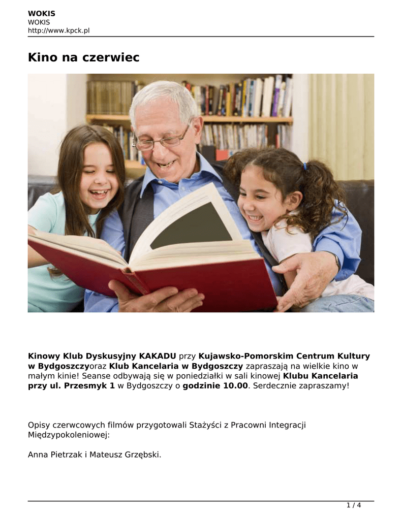 WOKIS WOKIS http://www.kpck.pl Kino na czerwiec Kinowy Klub Dyskusyjny KAKADU przy Kujawsko-Pomorskim Centrum Kultury w Bydgoszczyoraz Klub Kancelaria w Bydgoszczy zapraszają na wielkie kino w małym kinie! Seanse odbywają się w poniedziałki w sali kinowej Klubu Kancelaria przy ul. Przesmyk 1 w Bydgoszczy o godzinie 10.00. Serdecznie zapraszamy! Opisy czerwcowych filmów przygotowali Stażyści z Pracowni Integracji Międzypokoleniowej: Anna Pietrzak i Mateusz Grzębski. 1/4 WOKIS WOKIS http://www.kpck.pl 01.06.2015. „Mały sklepik z horrorami” to amerykański horror komediowy Franka Oza z 1986 roku nakręcony na podstawie broadwayowskiego musicalu Howarda Ashmana. Jest to także remake głośnej komedii z 1960 roku. Akcja filmu toczy się w małej kwiaciarni pana Mushnika, w której pracuje dwoje młodych ludzi – piękna Audrey oraz Seymour, fajtłapa zakochany po uszy w swojej koleżance. Interes podupada, sam pan Mushnik ma zamiar zamknąć sklep. Sytuacja zmienia się jednak, gdy Seymour pokazuje szefowi niezwykłą roślinę, którą z miłości nazywa Audrey II, a która zaczyna przyciągać klientów. Jednak jak każda istota, by żyć, musi coś jeść… Czarny humor przeplata się tutaj z absurdem, a rytmiczna muzyka, sprawia, że widz świetnie się bawi oglądając ów „horror”. Dzieła dopełniają znakomite jak na lata 80-te efekty specjalne, za które film był nominowany do Oscara. 08.06.2015. „Kamerdyner” z 2013 roku w reżyserii Lee Danielsa to film będący historią pewnego kamerdynera Cecila. Nie jest on jednak zwykłym służącym, bowiem jego pracodawcą jest sam prezydent Stanów Zjednoczonych, a miejscem pracy Biały Dom. Przez 30 lat pracy, 8 prezydentów i tysiące tajemnic Cecil staje się naocznym świadkiem wydarzeń, które na zawsze zmieniły oblicze współczesnego świata. W pewnym momencie musi także podjąć trudną walkę o dobro i szczęście rodziny, któremu na drodze stanie jego własne, bezgraniczne oddanie wykonywanym obowiązkom. Film warto zobaczyć z dwóch powodów. Po pierwsze, by zdać sobie sprawę z kolosalnych zmian, jakie zaszły w Stanach na przestrzeni zaledwie kilku dekad. A także by zacząć się zastanawiać nad problemem segregacji rasowej, który w tym filmie jest ukazany znakomicie. 15.06.2015. „Witaj w klubie” z 2013 roku to historia pewnego elektryka Ron’a Woodroofa. Żyje on z dnia na dzień. Nałogowo pali, lubi wypić, często zmienia kobiety, a pasjonuje go rodeo. Pewnego dnia, przez przypadek dowiaduje się, że jest nosicielem wirusa HIV. Dla Rona brzmi to jak wyrok śmierci, jednak on nie zamierza się z tym godzić. Pełna humoru, prawdziwa historia człowieka, który nie chce żegnać się z życiem. Ponad to zakłada klub, który zaczyna pomagać takim jak on! Walka o przetrwanie, jest tutaj tak umiejętnie przekształcona, że widz w pewnym momencie zapomina, w jak poważnej sytuacji są bohaterowie. Doceniona została także świetna gra aktorska, czego dowodem są dwa Oscary za pierwszo i drugoplanową rolę. Poważna tematyka, jednak potrafi wywołać uśmiech na twarzach widzów. 2/4 WOKIS WOKIS http://www.kpck.pl 22.06.2015. „Whiplash” z 2014 roku w reżyserii Damiena Chazelle to jeden z rzadkich filmów, w których główną rolę gra sama muzyka. Andrew (Miles Teller) jest utalentowanym młodym perkusistą, który marzy o wielkiej karierze. Dołącza do szkolnego zespołu jazzowego, prowadzonego przez okrutnego nauczyciela Terence'a Fletchera (J.K. Simmons), który często wyładowuje się na uczniach. Andrew dążąc do doskonałości gotów jest poświęcić wszystko- w pewnym momencie nawet własne człowieczeństwo. Znakomita muzyka i wielkie zaangażowanie aktorów sprawiają, że jest to film, który zapamięta się na długo. 29.06.2015. „Frida” w reżyserii Julie Taymor to film z 2002 roku, przedstawiający życie i twórczość meksykańskiej malarki Fridy Kahlo – w tej roli znakomita Salma Hayek. Frida zasłynęła nie tylko dzięki niebywałemu talentowi, ale także bogatej osobowości i skandalicznemu życiu osobistemu. Produkcja ukazuje kulisy burzliwego związku malarki z jej mentorem i mężem Diego Riverą. W życiu przeszkadzają jej ułomności fizyczne, nabyte w młodości, ciągłe poronienia i częsta niewierność męża. Wydarzenia te jednak stają się także tematem jej najlepszych obrazów, co sprawia, że Frida jest tak wyjątkowa. Na uwagę zasługują nie tylko ciekawe ujęcia i muzyka, ale także szczera gra aktorska, która w niejednym oku wywoła łezkę wzruszenia. Ważne informacje: 1. Wejście na spotkanie KAKADU kosztuje 4 złote, płatne w barze KLUBU. 2. Telefony komórkowe należy wyciszyć przed prelekcją i seansem. 3. Przed prelekcją i seansem prosimy zaczekać w pomieszczeniach KLUBU. 4. Na salę proszę wchodzić dopiero po wcześniejszym jej przygotowaniu. 5. Osoba, która wejdzie do nieprzygotowanej sali kinowej lub nie chce czekać w KLUBIE na prelekcję i seans robi to na swoją odpowiedzialność. Pełen repertuar KAKADU 3/4 WOKIS WOKIS http://www.kpck.pl Pracownia Integracji Międzypokoleniowej Julian Waszak e-mail. [email protected] tel. 52 585 15 01 Up: J. Waszak 01.06.2015 4/4 Powered by TCPDF (www.tcpdf.org)