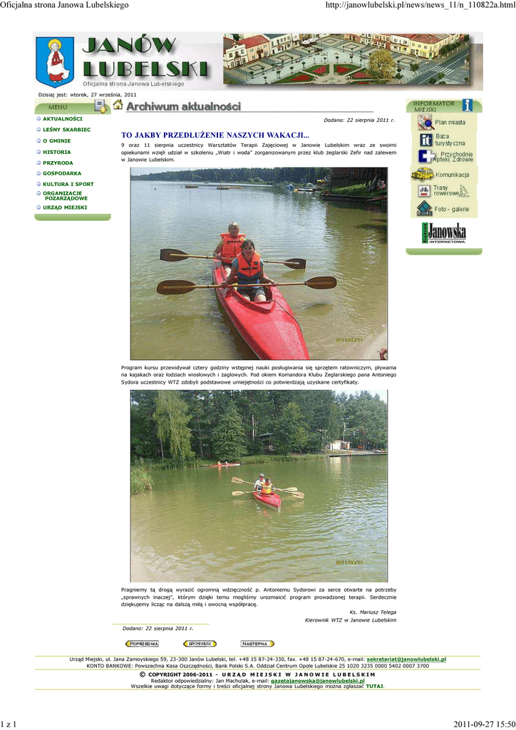 Oficjalna strona Janowa Lubelskiego 1z1 http://janowlubelski.pl/news/news_11/n_110822a.html Dzisiaj jest: wtorek, 27 września, 2011 AKTUALNOŚCI LEŚNY SKARBIEC O GMINIE HISTORIA PRZYRODA Dodano: 22 sierpnia 2011 r. TO JAKBY PRZEDŁUŻENIE NASZYCH WAKACJI... 9 oraz 11 sierpnia uczestnicy Warsztatów Terapii Zajęciowej w Janowie Lubelskim wraz ze swoimi opiekunami wzięli udział w szkoleniu „Wiatr i woda” zorganizowanym przez klub żeglarski Zefir nad zalewem w Janowie Lubelskim. GOSPODARKA KULTURA I SPORT ORGANIZACJE POZARZĄDOWE URZĄD MIEJSKI Program kursu przewidywał cztery godziny wstępnej nauki posługiwania się sprzętem ratowniczym, pływania na kajakach oraz łodziach wiosłowych i żaglowych. Pod okiem Komandora Klubu Żeglarskiego pana Antoniego Sydora uczestnicy WTZ zdobyli podstawowe umiejętności co potwierdzają uzyskane certyfikaty. Pragniemy tą drogą wyrazić ogromną wdzięczność p. Antoniemu Sydorowi za serce otwarte na potrzeby „sprawnych inaczej”, którym dzięki temu mogliśmy urozmaicić program prowadzonej terapii. Serdecznie dziękujemy licząc na dalszą miłą i owocną współpracę. Ks. Mariusz Telega Kierownik WTZ w Janowie Lubelskim Dodano: 22 sierpnia 2011 r. Urząd Miejski, ul. Jana Zamoyskiego 59, 23-300 Janów Lubelski, tel. +48 15 87-24-330, fax. +48 15 87-24-670, e-mail: [email protected] KONTO BANKOWE: Powszechna Kasa Oszczędności, Bank Polski S.A. Oddział Centrum Opole Lubelskie 25 1020 3235 0000 5402 0007 3700 © COPYRIGHT 2006-2011 - U R Z Ą D M I E J S K I W J A N O W I E L U B E L S K I M Redaktor odpowiedzialny: Jan Machulak, e-mail: [email protected] Wszelkie uwagi dotyczące formy i treści oficjalnej strony Janowa Lubelskiego można zgłaszać TUTAJ. 2011-09-27 15:50