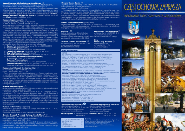 Muzea Klasztoru OO. Paulinów na Jasnej Górze 1 Jasnogórskie Centrum Informacji, ul. Kordeckiego 2, tel. +48 34 365 38 88, fax +48 34 365 43 43, www.jasnagora.pl, e-mail: [email protected] Zbiory przechowywane w Klasztorze to ogromne dziedzictwo narodowe, podróż przez ważne wydarzenia w dziejach Polski, możliwość poznania, jak historia Kościoła splata się z historią narodu. Dotknięcie wartości, które przeszłość niesie nam – współcześnie żyjącym. Zbiory poznać można zwiedzając m.in.: Skarbiec, Muzeum 600-lecia, Bastion św. Rocha (w godzinach od 9.00 do 17.00) oraz Wie¿ê (sezonowo od 8.00 do 16.00). Muzeum Częstochowskie 7 Aleja Najświętszej Maryi Panny 45 A (Odwach) tel. +48 34 360 56 31, tel./fax. +48 34 360 54 55, www.muzeumczestochowa.pl, e-mail: [email protected] wtorek - niedziela, godz. 11.00 - 17.00 (z mo¿liwoœci¹ zmian) Dokumentuje dziedzictwo narodowe oraz regionalne dotyczące przeszłości Częstochowy. Posiada wspaniałe zbiory malarstwa, a wśród nich obrazy Jacka Malczewskiego, Wojciecha Weissa, Jana Cybisa, Teodora Axentowicza oraz bogaty i reprezentacyjny dla polskiej sztuki zbiór grafiki. W zakresie etnografii na uwagę zasługuje kolekcja polskiej sztuki dewocyjnej, zbiory z zakresu regionalnej sztuki ludowej, a wśród nich niepowtarzalna kolekcja rzeźby ludowej. Muzeum gromadzi bogate zbiory z zakresu historii i przyrody – w tym zbiory: broni, monet i medali oraz kolekcję owadów. Unikatową ekspozycję stanowi część cmentarzyska z okresu nazywanego kulturą łużycką, udostêpniona w Rezerwacie Archeologicznym. Muzeum swoje wystawy prezentuje w nastêpuj¹cych obiektach: 77 Ratusz, Aleja Najœwiêtszej Maryi Panny 45a, tel. +48 34 366 80 50 7b 7b Muzeum Pielgrzymowania, Aleja Najświętszej Maryi Panny 47, tel. +48 34 368 21 64, 7c 7c Pawilon Wystawowy, Park Staszica, tel. +48 34 360 56 33, 7c 7c Zagroda Włościańska, ul. 7 Kamienic 4, 7d 7d Galeria Malarstwa i Rzeźby, ul. Katedralna 8, tel. +48 34 423 99 93 7e Dom Poezji. Muzeum Haliny Poświatowskiej, 7e ul. Jasnogórska 23, tel. +48 34 368 16 17 Rezerwat Archeologiczny, ul. Łukasińskiego 20, tel. +48 34 323 19 51, (poza planem) Dworek Krasińskich, Złoty Potok ul. Kościuszki 11, tel. +48 34 327 81 91, ekspozycja poświęcona Zygmuntowi Krasińskiemu (poza planem). Muzeum Archidiecezji Częstochowskiej 14 ul. św. Barbary 41, tel. +48 34 368 33 61, wtorek - sobota, godz. 9.00 - 13.00 Zbiory Muzeum stanowią zabytki sztuki sakralnej z Częstochowy i okolic, mające wartość nie tylko artystyczną, ale także historyczną i kulturową. Prezentowane są tutaj rzeźby sakralne - najstarsze datowane na XV wiek i kompozycje malarskie, w większości obrazy przedstawiające świętych bliskich polskiej duchowości religijnej. Ciekawą częścią zbiorów są numizmaty oraz medale wydawane z okazji różnych wydarzeń kościelnych i uroczystości religijnych, stanowiące swoistą historię Kościoła. Muzeum Produkcji Zapałek 15 ul. Ogrodowa 68, tel./fax +48 34 365 12 69, www.zapalki.pl, e-mail: [email protected] poniedziałek - piątek, godz. 8.00 - 13.00 Pracująca zabytkowa linia technologiczna z lat 30. ubiegłego stulecia, w połączeniu z zabudowaniami fabrycznymi z XIX wieku, czyni Muzeum unikatem na skalę europejską. Muzeum Produkcji Zapałek działa w czynnym, powstałym w 1882 roku zakładzie. Pozwala to zwiedzającym na wędrówkę w czasie, przeniesienie się w rzeczywistość międzywojennego przemysłu poruszanego parą. Główną atrakcją jest zwiedzanie pracującego zabytkowego parku maszynowego oraz możliwość zapoznania się z niezwykle ciekawym procesem powstawania zapałek. Muzeum Historii Kolei (poza planem) Dworzec PKP Częstochowa Stradom, ul. Pułaskiego 100/120, tel. +48 34 322 26 89, soboty - godz. 9.00 - 13.00 Ekspozycja zabytkowego sprzętu i wyposażenia kolejowego. Galeria - Ośrodek Promocji Kultury „Gaude Mater” 16 ul. Dąbrowskiego 1, tel. +48 34 324 36 38 , tel./fax +48 34 365 17 60, www.gaudemater.pl, e-mail: [email protected] poniedziałek - piątek, godz 9.00 - 18.00 Jest miejscem prezentacji twórców wszystkich dyscyplin artystycznych, spotkania ze sztuką współczesną, często promocji nowych twórców i kierunków. Kameralny klimat Galerii sprzyja bezpośredniemu odbiorowi sztuki, koncentruje uwagę na prezentowanych dziełach. Miejska Galeria Sztuki 17 Aleja Najświętszej Maryi Panny 64, tel. +48 34 324 55 81, tel./fax +48 34 324 60 57 www.galeria.czest.pl, [email protected], wtorek - niedziela, godz 10.30 - 18.00 Prezentuje wystawy sztuki współczesnej, indywidualne, tematyczne i wystawy problemowe. Przedstawia także kolekcję dzieł Zdzisława Beksińskiego ze zbiorów P. Dmochowskiego. Wśród głównych cyklów realizowanych przez Galerię polecić należy coroczne plenery: Jurajska Jesień i Plener Miejski, międzynarodowe Triennale Sztuki SACRUM, Triennale Malarstwa Młodych. Galeria posiada bogate zbiory malarstwa, grafiki i rysunku. Przy Galerii działa Ośrodek Kultury Filmowej. Galeria Sztuki Odlewniczej (poza planem) Aleja Armii Krajowej 19, tel. +48 34 325 07 47, www.mim.pcz.czest.pl/galeria_sztuki Galeria gromadzi odlewy artystyczne i dekoracyjne; historyczne i współczesne. Liczną grupę eksponatów stanowią medale. Art-Foto 18 Galeria Regionalnego Ośrodka Kultury ul. Ogińskiego 13a, tel. +48 34 324 46 51, Filharmonia Częstochowska 20 ul. Wilsona 16, tel. +48 34 324 18 54 www.filharmonia.com.pl, www.rok.czestochowa.pl, [email protected] [email protected] poniedziałek - piątek godz. 8.00 - 15.00 Kino Teatr im. Adama Mickiewicza 19 Cinema City Wolność 21 ul. Kilińskiego 15, tel. +48 34 372 33 00, Aleja Kosciuszki 1/5, www.teatr-mickiewicza.pl, tel. +48 34 371 71 71, [email protected] www.cinema-city.pl BAZA NOCLEGOWA HOTELE MERCURE PATRIA ***, ul. Popiełuszki 2, tel. +48 34 324 70 01, www.orbis.pl, [email protected] SCOUT ***, ul. Drogowców 12, tel. +48 34 361 56 62, www.hotel.scout.pl, [e