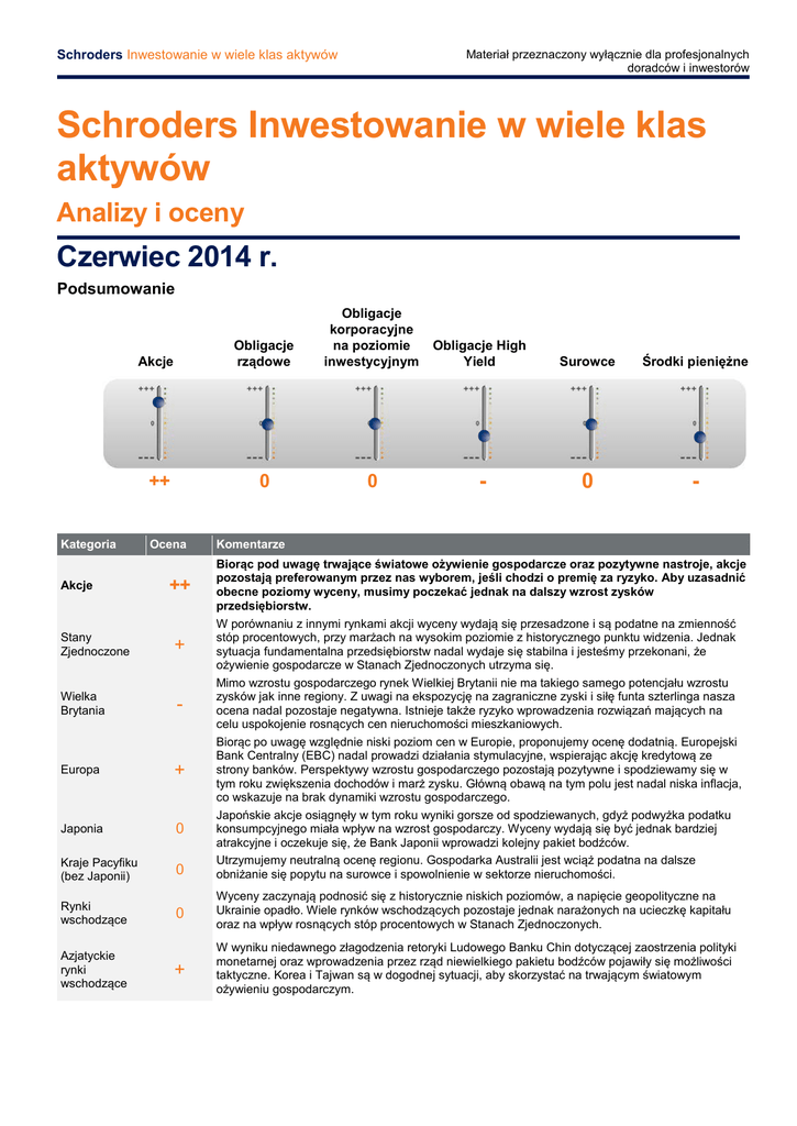 Materiał przeznaczony wyłącznie dla profesjonalnych doradców i inwestorów Schroders Inwestowanie w wiele klas aktywów Schroders Inwestowanie w wiele klas aktywów Analizy i oceny Czerwiec 2014 r. Podsumowanie Kategoria Akcje Akcje Obligacje rządowe Obligacje korporacyjne na poziomie inwestycyjnym ++ 0 0 Ocena ++ Obligacje High Yield Surowce Środki pieniężne - 0 - Komentarze Biorąc pod uwagę trwające światowe ożywienie gospodarcze oraz pozytywne nastroje, akcje pozostają preferowanym przez nas wyborem, jeśli chodzi o premię za ryzyko. Aby uzasadnić obecne poziomy wyceny, musimy poczekać jednak na dalszy wzrost zysków przedsiębiorstw. W porównaniu z innymi rynkami akcji wyceny wydają się przesadzone i są podatne na zmienność stóp procentowych, przy marżach na wysokim poziomie z historycznego punktu widzenia. Jednak sytuacja fundamentalna przedsiębiorstw nadal wydaje się stabilna i jesteśmy przekonani, że ożywienie gospodarcze w Stanach Zjednoczonych utrzyma się. Mimo wzrostu gospodarczego rynek Wielkiej Brytanii nie ma takiego samego potencjału wzrostu zysków jak inne regiony. Z uwagi na ekspozycję na zagraniczne zyski i siłę funta szterlinga nasza ocena nadal pozostaje negatywna. Istnieje także ryzyko wprowadzenia rozwiązań mających na celu uspokojenie rosnących cen nieruchomości mieszkaniowych. Biorąc po uwagę względnie niski poziom cen w Europie, proponujemy ocenę dodatnią. Europejski Bank Centralny (EBC) nadal prowadzi działania stymulacyjne, wspierając akcję kredytową ze strony banków. Perspektywy wzrostu gospodarczego pozostają pozytywne i spodziewamy się w tym roku zwiększenia dochodów i marż zysku. Główną obawą na tym polu jest nadal niska inflacja, co wskazuje na brak dynamiki wzrostu gospodarczego. Japońskie akcje osiągnęły w tym roku wyniki gorsze od spodziewanych, gdyż podwyżka podatku konsumpcyjnego miała wpływ na wzrost gospodarczy. Wyceny wydają się być jednak bardziej atrakcyjne i oczekuje się, że Bank Japonii wprowadzi kolejny pakiet bodźców. Utrzymujemy neutralną ocenę regionu. Gospodarka Australii jest wciąż podatna na dalsze obniżanie się popytu na surowce i spowolnienie w sektorze nieruchomości. Stany Zjednoczone + Wielka Brytania - Europa + Japonia 0 Kraje Pacyfiku (bez Japonii) 0 Rynki wschodzące 0 Wyceny zaczynają podnosić się z historycznie niskich poziomów, a napięcie geopolityczne na Ukrainie opadło. Wiele rynków wschodzących pozostaje jednak narażonych na ucieczkę kapitału oraz na wpływ rosnących stóp procentowych w Stanach Zjednoczonych. + W wyniku niedawnego złagodzenia retoryki Ludowego Banku Chin dotyczącej zaostrzenia polityki monetarnej oraz wprowadzenia przez rząd niewielkiego pakietu bodźców pojawiły się możliwości taktyczne. Korea i Tajwan są w dogodnej sytuacji, aby skorzystać na trwającym światowym ożywieniu gospodarczym. Azjatyckie rynki wschodzące Schroders Inwestowanie w wiele klas aktywów Kategoria Ocena Obligacje rządowe 0 Stany Zjednoczone 0 Wielka Brytania 0 Europa 0 Japonia 0 Komentarze Nasze nastawienie względem duration pozostaje neutralne, gdyż napływ kapitału oraz oczekiwane zwiększenie bodźców w zakresie polityki monetarnej (EBC, Chiny) wpływają korzystnie na obligacje. Wzrost gospodarczy pozostaje na umiarkowanym poziomie, choć pojawiają się pierwsze oznaki wzrostu oczekiwań inflacyjnych. Ostatnie dane o zatrudnieniu potwierdzają stopniowe, choć powolne ożywienie gospodarcze, dlatego też nasze stanowisko dotyczące czasu trwania amerykańskich obligacji pozostaje neutralne, gdyż inwestorzy nadal mają możliwość realizacji zysków z transakcji carry trade i korzystania ze strategii polegającej na kupowaniu obligacji długoterminowych i sprzedawaniu ich przed okresem zapadalności w celu osiągnięcia zysku z ich wzrastającej wartości nominalnej. Zmniejszenie stóp zwrotu z 10-letnich amerykańskich obligacji skarbowych od początku roku było spowodowane wcześniejszą przesadzoną reakcją na program ograniczenia złagodzenia ilościowego Rezerwy Federalnej i niższymi oczekiwaniami inflacyjnymi. Choć najnowsze dane dotyczące Wielkiej Brytanii wyglądają optymistycznie (a przez to wpływają negatywnie na obligacje), nadal spodziewamy się, że stopy krótkoterminowe pozostaną na niezmienionym poziomie, z uwagi na zależność ożywienia gospodarczego od brytyjskiego rynku mieszkaniowego oraz wysoki poziom zadłużenia gospodarstw domowych. Dlatego też utrzymujemy ocenę neutralną. Spowolnienie eksportu (będące następstwem niższego chińskiego popytu) w połączeniu z silnym euro w dalszym ciągu osłabiają tempo wzrostu gospodarczego, a naciski deflacyjne nadal występują. Obcięcie stóp kredytowych przez EBC powinno wpłynąć na ograniczenie rentowności. Po odnotowanym w Kwietniu zwiększeniu konsumpcji dane dotyczące wzrostu gospodarczego Japonii pogarszają się. Spodziewamy się, że Bank Japonii przeprowadzi interwencję w postaci dalszego złagodzenia ilościowego. Inflacja jednak wzrosła, co skłania nas do utrzymania oceny na poziomie neutralnym. Obligacje amerykańskie powiązane z inflacją + Czynniki napędzające inflację zaczynają rosnąć. Na amerykańskim rynku pracy rosną płace, a ceny żywności i koszty wynajmu również wykazują trend wzrostowy. Choć gwałtowny wzrost inflacji nie jest nieuchronny, preferujemy obligacje powiązane z inflacją od obligacji o oprocentowaniu nominalnym, gdyż te ostatnie zbyt nisko wyceniają ryzyko inflacji. Rynki wschodzące 0 Mimo podwyższonego ryzyka związanego z płynnością z uwagi na dodatni wskaźnik carry utrzymujemy neutralną pozycję względem obligacji rynków wschodzących denominowanych w dolarach amerykańskich. Kategoria Ocena Obligacje korporacyjne na poziomie inwestycyjnym 0 Stany Zjednoczone - Europa + Kategoria Obligacje High Yield Komentarze Ocena Mimo że ożywienie gospodarcze w Stanach Zjednoczon