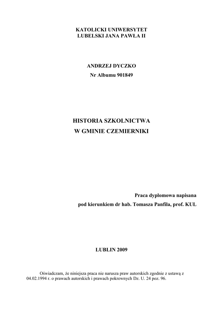 KATOLICKI UNIWERSYTET LUBELSKI JANA PAWŁA II ANDRZEJ DYCZKO Nr Albumu 901849 HISTORIA SZKOLNICTWA W GMINIE CZEMIERNIKI Praca dyplomowa napisana pod kierunkiem dr hab. Tomasza Panfila, prof. KUL LUBLIN 2009 Oświadczam, że niniejsza praca nie narusza praw autorskich zgodnie z ustawą z 04.02.1994 r. o prawach autorskich i prawach pokrewnych Dz. U. 24 poz. 96. 2 Spis treści 1. Wstęp……………………………………………………………………………………..3 2. Krótki rys historii Czemiernik i okolic………………………………….…………….….4 3. Najdawniejsze dzieje szkolnictwa w Gminie Czemierniki ………………………….…...8 4. Szkoła Podstawowa w Czemiernikach……………………………………………………9 5. Szkolnictwo w Lichtach i Niewęgłoszu ………………………….…..….………..……..23 5.1. Szkoła w Lichtach w latach 1920 – 1939 ……………………………..……….……23 5.2. Szkoła w Lichtach w okresie powojennym …………………………..……………..35 5.3. Szkoła w Niewęgłoszu w okresie powojennym …………..……………………..….37 6. Szkoła Podstawowa w Stoczku ………………….………………………………………44 7. Ośrodek Szkolno – Wychowawczy w Radzyniu Podlaskim ……………….……………52 8. Inne Szkoły gminy Czemierniki ………………………………………………………... 62 9. Zakończenie ……………………………………………………………………………...64 10. Bibliografia ……………………………………………...……………………………….67 3 1. Wstęp Niniejsza praca będzie syntezą różnorodnych opracowań i źródeł dotyczących szkolnictwa na terenie Gminy Czemierniki w jej aktualnych granicach. W mojej pracy wykorzystałem informacje zawarte w kronikach szkolnych, które są doskonałym źródłem wiedzy o pracy szkoły. Są one prowadzone w różny sposób w zależności od okresu oraz intencji piszącego. Duża liczba szkół, zwłaszcza wiejskich jest likwidowana głównie z powodu zmniejszającej się liczby uczniów a większość dokumentów szkolnych po likwidacji placówki ginie a fakty z historii szkoły są zapominane. Niniejsza praca ma na celu zachowanie w pamięci działalności szkół i przedstawienie trudu nauczycieli wkładających tak wiele wysiłku w kształtowanie kolejnych pokoleń uczniów. W pracy wiele uwagi poświeciłem opisaniu pracy szkół w zmieniających się warunkach społecznych i politycznych takich jak budowa struktur państwa polskiego po 1918 roku, okres drugiej wojny światowej czy też czasy PRL. Gmina Czemierniki jest niewielką gminą rolniczą leżącą na tzw. „ścianie wschodniej”. Na jej terenie znajduje się obecnie trzy szkoły: Publiczne Gimnazjum im. Harcmistrza M. Lisowskiego w Czemiernikach, Publiczna Szkoła Podstawowa im. Tadeusza Kościuszki w Czemiernikach, oraz Publiczna Szkoła Podstawowa w Niewęgłoszu. W mojej pracy przedstawiłem w syntetyczny sposób historię tych szkół oraz szkół, których już dzisiaj nie ma. Szkołami nie istniejącymi a opisanymi przeze mnie są Szkoła Podstawowa w Lichtach oraz Szkoła Podstawowa w Stoczku. W pracy przedstawiłem też historię Ośrodka Szkolno – Wychowawczego w Radzyniu Podlaskim, który od chwili powstania do roku 2002 miał swoją siedzibę najpierw w Stoczku i Czemiernikach a dopiero od 2002 roku w Radzyniu Podlaskim. Nie udało mi się dotrzeć do źródeł historii Szkoły Podstawowej w Bełczącu oraz w Skokach. Szkoły te zostały zlikwidowane w latach siedemdziesiątych XX wieku. Pracę moją podzieliłem na rozdziały opisujące historię poszczególnych szkół Gminy Czemierniki jak też dzieje Czemiernik i początki szkolnictwa na tym terenie. W pierwszym rozdziale opisałem historię Czemiernik i okolic ponieważ wyszedłem z założenia, że nie można rozważać historii szkolnictwa w oderwaniu od innych ważnych wydarzeń historycznych regionu. Jest to miejscowość obfitująca w zabytki kultury świeckiej i sakralnej. Mieszkańcy Czemiernik i regionu uczestniczyli w wielu ważnych wydarzeniach z historii Polski. Skutki tych wydarzeń odczuwało szkolnictwo na tym terenie. 4 W rozdziale drugim opisałem najdawniejsze dzieje szkolnictwa na terenie Czemiernik i okolic. Kolejne rozdziały opisują już historię poszczególnych placówek szkolnych gminy Czemierniki. Starałem się w pracy opisać kolejne lata funkcjonowania szkół z najważniejszymi zmianami oraz wydarzeniami każdego roku. Szkolnictwo w Lichtach i Niewęgłoszu opisałem łącznie w jednym rozdziale ponieważ w okresie międzywojennym funkcjonowała na terenie tych wsi jedna szkoła – Szkoła Powszechna w Lichtach. Po drugiej wojnie światowej obie wsie posiadały już własne szkoły, których historię opisałem w dwóch oddzielnych podrozdziałach. W pracy jako źródła posłużyły mi kroniki szkolne oraz opracowania w postaci opublikowanych prac. Historia Szkoły Podstawowej w Czemiernikach została opracowana przeze mnie na podstawie kroniki szkoły oraz pracy magisterskiej Beaty Kublickiej „Dzieje szkolnictwa w Czemiernikach”1. Dzieje Szkoły Podstawowej w Stoczku opracowałem korzystając z kroniki szkoły oraz opracowania Mariana Mazurka, które zostało opublikowane w gazecie okolicznościowej „Szkoła Podstawowa w Stoczku 1890-2005”2. Opisując historię Ośrodka Szkolno – Wychowawczego w Radzyniu Podlaskim posłużyłem się wydawnictwami okolicznościowymi opublikowanymi z okazji nadania imienia Zofii Sękowskiej ośrodkowi. Historię szkolnictwa w Niewęgłoszu i Lichtach opracowałem wyłącznie w oparciu o dokumenty szkolne takie jak kroniki szkolne, księgi uczniów księgi protokołów rad pedagogicznych oraz dzienniki lekcyjne. W pracy wykorzystałem zdjęcia zamieszczone w kronikach szkolnych, użyczone mi przez prywa
