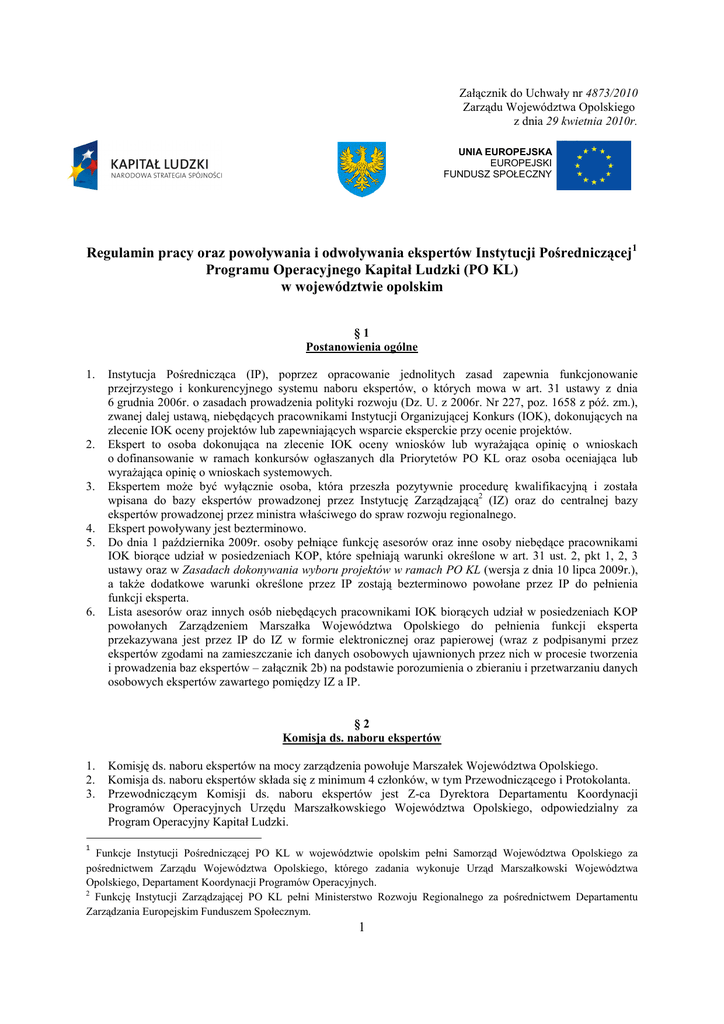 Załącznik do Uchwały nr 4873/2010 Zarządu Województwa Opolskiego z dnia 29 kwietnia 2010r. UNIA EUROPEJSKA EUROPEJSKI FUNDUSZ SPOŁECZNY Regulamin pracy oraz powoływania i odwoływania ekspertów Instytucji Pośredniczącej1 Programu Operacyjnego Kapitał Ludzki (PO KL) w województwie opolskim §1 Postanowienia ogólne 1. 2. 3. 4. 5. 6. Instytucja Pośrednicząca (IP), poprzez opracowanie jednolitych zasad zapewnia funkcjonowanie przejrzystego i konkurencyjnego systemu naboru ekspertów, o których mowa w art. 31 ustawy z dnia 6 grudnia 2006r. o zasadach prowadzenia polityki rozwoju (Dz. U. z 2006r. Nr 227, poz. 1658 z póź. zm.), zwanej dalej ustawą, niebędących pracownikami Instytucji Organizującej Konkurs (IOK), dokonujących na zlecenie IOK oceny projektów lub zapewniających wsparcie eksperckie przy ocenie projektów. Ekspert to osoba dokonująca na zlecenie IOK oceny wniosków lub wyraŜająca opinię o wnioskach o dofinansowanie w ramach konkursów ogłaszanych dla Priorytetów PO KL oraz osoba oceniająca lub wyraŜająca opinię o wnioskach systemowych. Ekspertem moŜe być wyłącznie osoba, która przeszła pozytywnie procedurę kwalifikacyjną i została wpisana do bazy ekspertów prowadzonej przez Instytucję Zarządzającą2 (IZ) oraz do centralnej bazy ekspertów prowadzonej przez ministra właściwego do spraw rozwoju regionalnego. Ekspert powoływany jest bezterminowo. Do dnia 1 października 2009r. osoby pełniące funkcję asesorów oraz inne osoby niebędące pracownikami IOK biorące udział w posiedzeniach KOP, które spełniają warunki określone w art. 31 ust. 2, pkt 1, 2, 3 ustawy oraz w Zasadach dokonywania wyboru projektów w ramach PO KL (wersja z dnia 10 lipca 2009r.), a takŜe dodatkowe warunki określone przez IP zostają bezterminowo powołane przez IP do pełnienia funkcji eksperta. Lista asesorów oraz innych osób niebędących pracownikami IOK biorących udział w posiedzeniach KOP powołanych Zarządzeniem Marszałka Województwa Opolskiego do pełnienia funkcji eksperta przekazywana jest przez IP do IZ w formie elektronicznej oraz papierowej (wraz z podpisanymi przez ekspertów zgodami na zamieszczanie ich danych osobowych ujawnionych przez nich w procesie tworzenia i prowadzenia baz ekspertów – załącznik 2b) na podstawie porozumienia o zbieraniu i przetwarzaniu danych osobowych ekspertów zawartego pomiędzy IZ a IP. §2 Komisja ds. naboru ekspertów 1. 2. 3. Komisję ds. naboru ekspertów na mocy zarządzenia powołuje Marszałek Województwa Opolskiego. Komisja ds. naboru ekspertów składa się z minimum 4 członków, w tym Przewodniczącego i Protokolanta. Przewodniczącym Komisji ds. naboru ekspertów jest Z-ca Dyrektora Departamentu Koordynacji Programów Operacyjnych Urzędu Marszałkowskiego Województwa Opolskiego, odpowiedzialny za Program Operacyjny Kapitał Ludzki. 1 Funkcje Instytucji Pośredniczącej PO KL w województwie opolskim pełni Samorząd Województwa Opolskiego za pośrednictwem Zarządu Województwa Opolskiego, którego zadania wykonuje Urząd Marszałkowski Województwa Opolskiego, Departament Koordynacji Programów Operacyjnych. 2 Funkcję Instytucji Zarządzającej PO KL pełni Ministerstwo Rozwoju Regionalnego za pośrednictwem Departamentu Zarządzania Europejskim Funduszem Społecznym. 1 4. 5. 6. Przewodniczący Komisji ds. naboru ekspertów moŜe wyznaczyć spośród członków Komisji swojego Zastępcę. Wyznaczenie Zastępcy następuje w formie pisemnego upowaŜnienia. W skład Komisji ds. naboru ekspertów wchodzą pracownicy Urzędu Marszałkowskiego Województwa Opolskiego. Zadaniem Komisji ds. naboru ekspertów jest: − ocena wniosków o wpis do bazy ekspertów prowadzonej przez IZ oraz do centralnej bazy ekspertów prowadzonej przez ministra właściwego do spraw rozwoju regionalnego, − sporządzenie listy kandydatów spełniających wymagania określone w ogłoszeniu o naborze i przedłoŜenie jej w formie rekomendacji Marszałkowi Województwa Opolskiego, − fakultatywne przeprowadzenie rozmów kwalifikacyjnych z kandydatami wskazanymi przez Marszałka Województwa Opolskiego. §3 Wymagania i warunki niezbędne do pełnienia funkcji eksperta Ekspertem moŜe zostać osoba, która spełnia jednocześnie następujące warunki: − korzysta z pełni praw publicznych, − posiada pełną zdolność do czynności prawnych, − nie została skazana prawomocnym wyrokiem za przestępstwa umyślne lub za umyślne przestępstwo skarbowe, − posiada wykształcenie wyŜsze, − posiada minimum 2-letnie doświadczenie zawodowe w niŜej wymienionych obszarach objętych programami operacyjnymi współfinansowanymi z Europejskiego Funduszu Społecznego3: − zatrudnienie, − edukacja, − integracja społeczna, − adaptacyjność pracowników i przedsiębiorstw, − rozwój zasobów ludzkich na obszarach wiejskich, − innowacyjność, − współpraca ponadnarodowa, − w ciągu ostatnich 6 miesięcy przed dniem złoŜenia wniosku o wpis do bazy ekspertów prowadzonej przez IZ oraz do centralnej bazy ekspertów prowadzonej przez ministra właściwego do spraw rozwoju regionalnego, nie pozostawała w stosunku pracy z IZ, Instytucją Pośredniczącą II stopnia4 (IP2) oraz IP prowadzącą nabór ekspertów, − nie została uprzednio skreślona z listy ekspertów, która prowadzona była przez IZ, centralnej bazy ekspertów prowadzonej przez ministra właściwego do spraw rozwoju regionalnego lub z listy asesorów prowadzonej przy którejkolwiek z IP/IP2. − w momencie składania wniosku nie pozostaje w stosunku pracy z firmą konsultingową lub innym podmiotem zajmującym się doradztwem projektowym. §4 Powoływanie ekspertów 1. 2. Ogłoszenie o moŜliwości ubiegania się o wpis do bazy prowadzonej przez IZ oraz do centralnej bazy ekspertów prowadzonej przez ministra właściwego do spraw rozwoju regionalnego podlega ogłoszeniu: - w swojej siedzibie w miejscu publicznie dostępnym, - na stronie