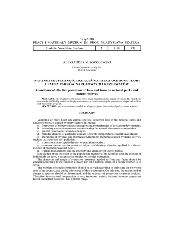PR¥DNIK PRACE I MATERIA£Y MUZEUM IM. PROF. W£ADYS£AWA SZAFERA Pr¹dnik. Prace Muz. Szafera 3 912 1991 ALEKSANDER W. SOKO£OWSKI Zak³ad Ochrony Przyrody IBL 17-230 Bia³owie¿a WARUNKI SKUTECZNOCI DZIA£AÑ NA RZECZ OCHRONY FLORY I FAUNY PARKÓW NARODOWYCH I REZERWATÓW Conditions of effective protection of flora and fauna in national parks and nature reserves ABSTRACT. This article presents factors which cause plant and animal species to vanish. The conditions that must be fulfilled by studies of this phenomenon and activities ensuring the permanence of species localities and biocenoses are given. KEY WORDS: species extinction, conditions of species protection, national parks, nature reserves. SUMMARY Vanishing of many plant and animal species, occurring also in the national parks and nature reserves, is caused by many factors, including: a. the process of primary succession expressing the tendencies of ecosystem development, b. secondary succession process reconstructing the natural biocenoses composition, c. general (directional) climate changes, d. periodic changes of particular climate elements (temperature, rainfall, insolation), e. alterations of physical and chemical environment properties caused by mans activity such as air, water and soil pollution, f. protection system applied (strict or partial protection), g. economy system on the protected object (cultivating, thinning applied in a forest, method of protection against pests), h. tourism management and the intensity and character of tourist traffic, Knowledge about the state of the population, number of its localities and the amount of individuals on each, is essential for studies on species extinction. The character and range of protection measures applied to flora and fauna should be decided according to the function a given part of a national park, or a nature reserve is to serve. The problem of species extinction should be solved according to their state on the whole area of the country, and on the whole area of their occurrence. On this area, the real extend of danger to species should be determined, and the urgency of protection measures decided. Therefore, international cooperation in very important, mainly because the most dangerous factor (industrial pollution) has a global range. PR¥DNIK PRACE I MATERIA£Y MUZEUM IM. PROF. W£ADYS£AWA SZAFERA Pr¹dnik. Prace Muz. Szafera 3 1322 1991 ZBIGNIEW WITKOWSKI Zak³ad Ochrony Przyrody i Zasobów Naturalnych PAN ul. Lubicz 46, 31-512 Kraków UWAGI O OCHRONIE PULI GENOWEJ POPULACJI On the conservation of gene pool of population ABSTRACT. Geneticists are all agreed that the genetic variability of population determines its fitness and survival. This has been proved by comparative studies on homo- and heterozygotes as well as by observations of diplo- and poliploidal populations of the same species. Small populations are at the great risk of losing their genetic variability due to so-called founder effect, inbreeding and genetic drift. The conservation of gene pool should concern, first of all, rare, vanishing, and genetically isolated species. Gene pools of other species should be secured by an adequate system of protected areas. KEY WORDS: small population, fitness, genetic variability, gene pool, conservation of gene pool. SUMMARY Population geneticists are of an unanimous opinion that the fitness of an individual is determined by its genetic variability as well as by the genetic diversity of the whole population. The genetic polymorphism of an individual increases its chances for survival and makes it more resistant to diseases. Heterozygotic individuals develop quicker and the process of their development is better stabilized than in homozygotes. Parthenogenetic poliploidal forms, in comparison with the reproducing sexually diploidal forms of the same species, have, in general, a much wider geographical range and they are also more resistant to unfavourable environmental conditions. In small populations the progressive loss of genetic variability is a very dangerous natural (endogenic) phenomenon. It is caused by inbreeding, genetic drift, and founder effect. The conservation of the gene pool of rare species consists in preventing these negative phenomena. Adequate population numbers are a chief factor securing specimens from the loss of genetic variability. A so-called effective number of specimens on the scale of several generations should be not smaller than 50, and on the scale of some hundred generations than 500. Not all species can and should be included in the conservation of gene pool. First of all, we should protect these forms that are genetically distant from others, that are strongly threatened with extinction, or that live in isolated populations. To conserve gene pools of other species an adequate system of protected areas should be created. PR¥DNIK PRACE I MATERIA£Y MUZEUM IM. PROF. W£ADYS£AWA SZAFERA Pr¹dnik. Prace Muz. Szafera 3 2329 1991 PIOTR KOSIBA, LUCYNA MRÓZ, JAN SAROSIEK Instytut Botaniki Uniwersytetu Wroc³awskiego Zak³ad Ekologii i Ochrony Przyrody ul. Kanonia 6/8, 50-328 Wroc³aw OCENA WARUNKÓW SIEDLISKOWYCH WSTÊPNYM ZADANIEM W CZYNNEJ OCHRONIE GATUNKOWEJ ROLIN Evaluation of habitat conditions as a preliminary task in the active protection of plant species ABSTRACT. The active protection of plant species, and particularly their introduction, reintroduction, and metaplantation, needs the knowledge of their autecology. The principles of the optimum selection of natural populations and specimens for the preservative culture should be worked out. It is necessary to know optimum habitat and microhabitat conditions for the plant populations investigated. The planned experimenting in this field is postulated. KEY WORDS: optimum habitat conditions, preservative plan culture, ecological variability of microhabitats, ecological structure of population. SUMMARY In a small area occupied by a given plant species, its different populations occur