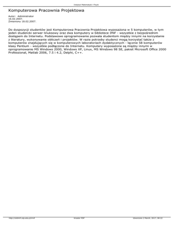 Instytut Matematyki i Fizyki Komputerowa Pracownia Projektowa Autor: Administrator 16.02.2007. Zmieniony 18.02.2007. Do dyspozycji studentów jest Komputerowa Pracownia Projektowa wyposażona w 5 komputerów, w tym jeden studencki serwer linuksowy oraz dwa komputery w bibliotece IMiF - wszystkie z bezpośrednim dostępem do Internetu. Podstawowe oprogramowanie pozwala studentom między innymi na korzystanie z literatury, wykonywanie obliczeń i projektów. W razie potrzeby studenci mogą korzystać także z komputerów znajdujących się w komputerowych laboratoriach dydaktycznych - łącznie 58 komputerów klasy Pentium - wszystkie podłączone do Internetu. Komputery wyposażone są między innymi w oprogramowanie MS Windows 2000, Windows XP, Linux, MS Windows 98 SE, pakiet Microsoft Office 2000 Professional, Matlab 2006, 7.5 i 4.2, Delphi, C++. http://oldimif.utp.edu.pl/imif Kreator PDF Utworzono 2 March, 2017, 08:22