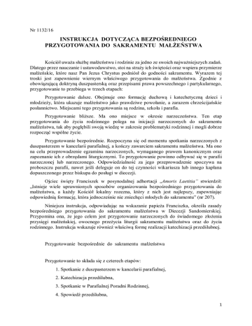 Nr 1132/16 INSTRUKCJA DOTYCZĄCA BEZPOŚREDNIEGO PRZYGOTOWANIA DO SAKRAMENTU MAŁŻEŃSTWA Kościół uważa służbę małżeństwu i rodzinie za jedno ze swoich najważniejszych zadań. Dlatego przez nauczanie i ustawodawstwo, stoi na straży ich świętości oraz wspiera przymierze małżeńskie, które nasz Pan Jezus Chrystus podniósł do godności sakramentu. Wyrazem tej troski jest zapewnienie wiernym właściwego przygotowania do małżeństwa. Zgodnie z obowiązującą doktryną duszpasterską oraz przepisami prawa powszechnego i partykularnego, przygotowanie to przebiega w trzech etapach: Przygotowanie dalsze. Obejmuje ono formację duchową i katechetyczną dzieci i młodzieży, która ukazuje małżeństwo jako prawdziwe powołanie, a zarazem chrześcijańskie posłannictwo. Miejscami tego przygotowania są rodzina, szkoła i parafia. Przygotowanie bliższe. Ma ono miejsce w okresie narzeczeństwa. Ten etap przygotowania do życia rodzinnego polega na inicjacji narzeczonych do sakramentu małżeństwa, tak aby pogłębili swoją wiedzę w zakresie problematyki rodzinnej i mogli dobrze rozpocząć wspólne życie. Przygotowanie bezpośrednie. Rozpoczyna się od momentu spotkania narzeczonych z duszpasterzem w kancelarii parafialnej, a kończy zawarciem sakramentu małżeństwa. Ma ono na celu przeprowadzenie egzaminu narzeczonych, wymaganego prawem kanonicznym oraz zapoznanie ich z obrzędami liturgicznymi. To przygotowanie powinno odbywać się w parafii narzeczonej lub narzeczonego. Odpowiedzialność za jego przeprowadzenie spoczywa na proboszczu parafii, nawet jeśli deleguje on do tej czynności wikariusza lub innego kapłana dopuszczonego przez biskupa do posługi w diecezji. Ojciec święty Franciszek w posynodalnej adhortacji „Amoris Laetitia” stwierdził: „Istnieje wiele uprawnionych sposobów organizowania bezpośredniego przygotowania do małżeństwa, a każdy Kościół lokalny rozezna, który z nich jest najlepszy, zapewniając odpowiednią formację, która jednocześnie nie zniechęci młodych do sakramentu” (nr 207). Niniejsza instrukcja, odpowiadając na wskazanie papieża Franciszka, określa zasady bezpośredniego przygotowania do sakramentu małżeństwa w Diecezji Sandomierskiej. Przypomina ona, że jego celem jest przygotowanie narzeczonych do świadomego złożenia przysięgi małżeńskiej, owocnego przeżycia liturgii sakramentu małżeństwa oraz do życia rodzinnego. Instrukcja wskazuje również właściwą formę realizacji katechizacji przedślubnej. Przygotowanie bezpośrednie do sakramentu małżeństwa Przygotowanie to składa się z czterech etapów: 1. Spotkanie z duszpasterzem w kancelarii parafialnej, 2. Katechizacja przedślubna, 3. Spotkanie w Parafialnej Poradni Rodzinnej, 4. Spowiedź przedślubna, 1 Uwzględniając realia Diecezji Sandomierskiej, etap przygotowania bezpośredniego do małżeństwa powinien przebiegać w następujący sposób: 1. Spotkanie narzeczonych z duszpasterzem w kancelarii parafialnej 1.1. Pierwsze spotkanie z kapłanem, o charakterze zapoznawczym i informacyjnym, powinno mieć miejsce przynajmniej pół roku przed ślubem. Duszpasterz, który musi być kapłanem dopuszczonym przez Biskupa do posługi w Diecezji, powinien przy tej okazji zorientować się odnośnie poziomu życia narzeczonych oraz ustalić z nimi datę ślubu. Zobowiązany jest on również poinformować narzeczonych o konieczności dostarczenia przynajmniej na trzy miesiące przed ślubem następujących dokumentów: metryki chrztu wystawionej nie wcześniej, niż 6 miesięcy od daty ślubu (nie dotyczy ochrzczonych w parafii, gdzie prowadzone są czynności urzędowe), ostatniego świadectwa katechizacji szkolnej, zaświadczeń ukończonego kursu przedmałżeńskiego, odbycia dnia skupienia i trzech spotkań w Poradni Życia Rodzinnego oraz w przypadku zawierania małżeństwa konkordatowego, ważnego zaświadczenia z USC o braku okoliczności wyłączających zawarcie małżeństwa (3 egz.). Umożliwi to przeprowadzenie egzaminu przedślubnego oraz sporządzenie kanonicznego protokołu badania narzeczonych i innych wymaganych dokumentów. W sytuacji kiedy narzeczeni lub jedno z nich nie byli jeszcze bierzmowani, duszpasterz powinien pomóc im przygotować się do przyjęcia tego sakramentu oraz skierować ich do parafii, w której mogą go przyjąć. Jeżeli w trakcie badania kanonicznego okaże się, że małżeństwo pragnie zawrzeć osoba nieochrzczona, ale gotowa na przyjęcie chrztu lub osoba ochrzczona niewprowadzona w życie eucharystyczne, to należy ją skierować do diecezjalnego centrum katechumenatu. Jeśli jedno z narzeczonych lub obydwoje nie uczęszczali na szkolną katechezę, wówczas należy udostępnić im pomocne materiały z dziedziny wiedzy religijnej (np.: „Katechizm dla dorosłych”, „Kompendium Katechizmu Kościoła katolickiego”, „Katechezy o sakramentach” t.1-2 itd.) na podstawie których duszpasterz przeprowadzi egzamin. Jego wyniki powinny zostać potwierdzone zaświadczeniem, które następnie należy załączyć do aneksu protokołu przedślubnego. Przypomina się, że świadectwo maturalne z religii oraz inne dokumenty potwierdzające katechizację szkolną, nie zwalniają z obowiązku odbycia kursów przedmałżeńskich. 1.2. W czasie kolejnych spotkań duszpasterz powinien podjąć z narzeczonymi rozmowę dotyczącą sakramentalności małżeństwa, a także problematyki etycznej, szczególnie jeśli chodzi o katolicką etykę małżeńską. Ma ich również zachęcić do odbycia dwóch spowiedzi przedślubnych, uwypuklając bardziej aspekt duchowy niż formalny sakramentu pokuty. Rozmowa duszpasterska powinna dotyczyć jednocześnie kwestii związanych z przebiegiem ceremonii ślubu. Należy zatem wstępnie omówić liturgię ślubną, zwracając uwagę narzeczonych na symbolikę znaków i obrzędów sakramentu małżeństwa, jak również na właściwy dobór oprawy muzycznej (w czasie l
