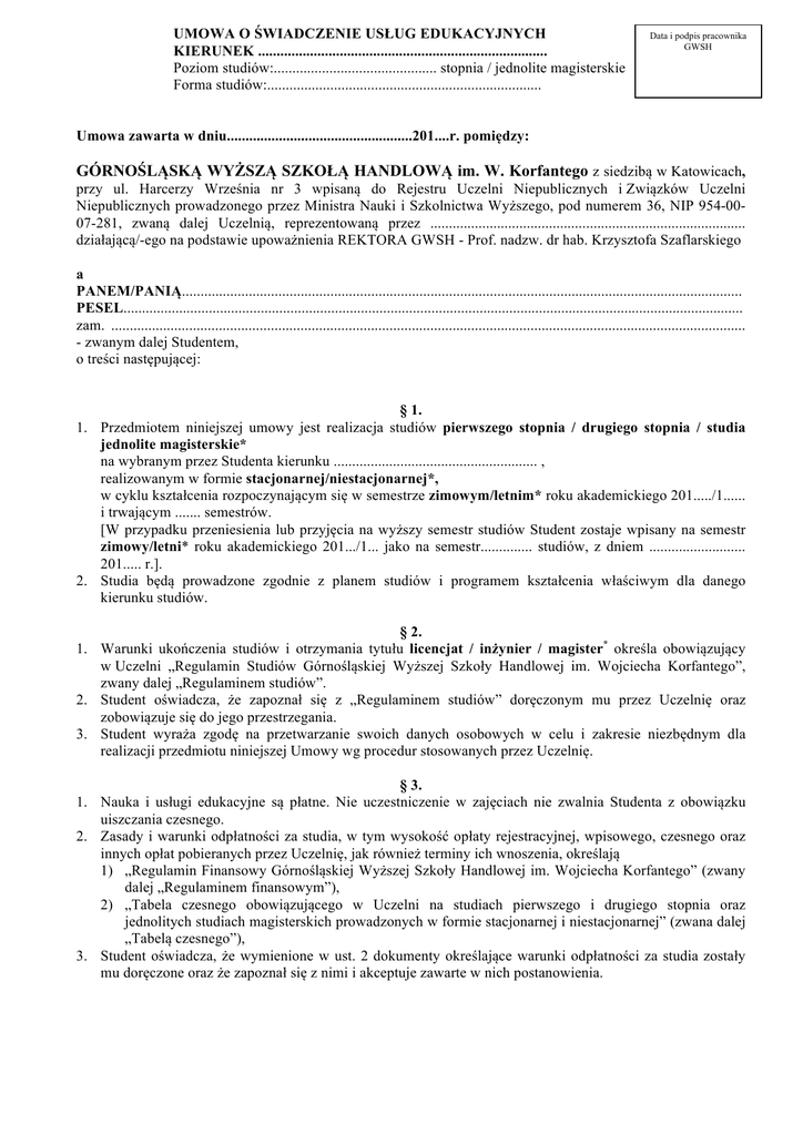 UMOWA O ŚWIADCZENIE USŁUG EDUKACYJNYCH KIERUNEK .............................................................................. Poziom studiów:............................................ stopnia / jednolite magisterskie Forma studiów:.......................................................................... Data i podpis pracownika GWSH Umowa zawarta w dniu..................................................201....r. pomiędzy: GÓRNOŚLĄSKĄ WYŻSZĄ SZKOŁĄ HANDLOWĄ im. W. Korfantego z siedzibą w Katowicach, przy ul. Harcerzy Września nr 3 wpisaną do Rejestru Uczelni Niepublicznych i Związków Uczelni Niepublicznych prowadzonego przez Ministra Nauki i Szkolnictwa Wyższego, pod numerem 36, NIP 954-0007-281, zwaną dalej Uczelnią, reprezentowaną przez ..................................................................................... działającą/-ego na podstawie upoważnienia REKTORA GWSH - Prof. nadzw. dr hab. Krzysztofa Szaflarskiego a PANEM/PANIĄ....................................................................................................................................................... PESEL....................................................................................................................................................................... zam. ........................................................................................................................................................................... - zwanym dalej Studentem, o treści następującej: § 1. 1. Przedmiotem niniejszej umowy jest realizacja studiów pierwszego stopnia / drugiego stopnia / studia jednolite magisterskie* na wybranym przez Studenta kierunku ....................................................... , realizowanym w formie stacjonarnej/niestacjonarnej*, w cyklu kształcenia rozpoczynającym się w semestrze zimowym/letnim* roku akademickiego 201...../1...... i trwającym ....... semestrów. [W przypadku przeniesienia lub przyjęcia na wyższy semestr studiów Student zostaje wpisany na semestr zimowy/letni* roku akademickiego 201.../1... jako na semestr.............. studiów, z dniem .......................... 201..... r.]. 2. Studia będą prowadzone zgodnie z planem studiów i programem kształcenia właściwym dla danego kierunku studiów. § 2. 1. Warunki ukończenia studiów i otrzymania tytułu licencjat / inżynier / magister* określa obowiązujący w Uczelni „Regulamin Studiów Górnośląskiej Wyższej Szkoły Handlowej im. Wojciecha Korfantego”, zwany dalej „Regulaminem studiów”. 2. Student oświadcza, że zapoznał się z „Regulaminem studiów” doręczonym mu przez Uczelnię oraz zobowiązuje się do jego przestrzegania. 3. Student wyraża zgodę na przetwarzanie swoich danych osobowych w celu i zakresie niezbędnym dla realizacji przedmiotu niniejszej Umowy wg procedur stosowanych przez Uczelnię. § 3. 1. Nauka i usługi edukacyjne są płatne. Nie uczestniczenie w zajęciach nie zwalnia Studenta z obowiązku uiszczania czesnego. 2. Zasady i warunki odpłatności za studia, w tym wysokość opłaty rejestracyjnej, wpisowego, czesnego oraz innych opłat pobieranych przez Uczelnię, jak również terminy ich wnoszenia, określają 1) „Regulamin Finansowy Górnośląskiej Wyższej Szkoły Handlowej im. Wojciecha Korfantego” (zwany dalej „Regulaminem finansowym”), 2) „Tabela czesnego obowiązującego w Uczelni na studiach pierwszego i drugiego stopnia oraz jednolitych studiach magisterskich prowadzonych w formie stacjonarnej i niestacjonarnej” (zwana dalej „Tabelą czesnego”), 3. Student oświadcza, że wymienione w ust. 2 dokumenty określające warunki odpłatności za studia zostały mu doręczone oraz że zapoznał się z nimi i akceptuje zawarte w nich postanowienia. § 4. 1. W okresie trwania niniejszej Umowy Uczelnia zastrzega sobie prawo do: 1) zmiany, z początkiem każdego kolejnego semestru, „Tabeli czesnego” i dokonania waloryzacji wysokości czesnego oraz innych opłat pobieranych od studentów, na zasadach określonych w „Regulaminie finansowym”, 2) zmiany „Regulaminu finansowego”, przy zachowaniu postanowień ust. 2-4. Zmiany dokumentów, o których mowa w pkt 1) i 2) wprowadzane są Zarządzeniem Rektora Uczelni. 2. Zmiany „Regulaminu finansowego” nie mogą zmieniać zasad waloryzacji czesnego i innych opłat pobieranych przez Uczelnię, doręczonych Studentowi w momencie zawarcia niniejszej Umowy. 3. Zmiany „Regulaminu finansowego” wiążą Studenta pod warunkiem, że nie wypowie on niniejszej Umowy w formie pisemnej w terminie 14 dni od dnia ich doręczenia w sposób określony w niniejszej Umowie. W przypadku złożenia przez Studenta wypowiedzenia, o którym mowa wyżej, rozwiązanie Umowy następuje z ostatnim dniem miesiąca, w którym zostało złożone wypowiedzenie, przy czym w okresie wypowiedzenia stosuje się dotychczasowe postanowienia „Regulaminu finansowego”. 4. W razie wydłużenia planowego okresu studiów z przyczyn leżących po stronie Studenta, w szczególności w razie powtarzania semestru / roku studiów albo skorzystania z urlopu od zajęć, w miejsce przepisów określających warunki odpłatności za studia, o których mowa w § 3, Uczelnia może przedstawić Studentowi przepisy obowiązujące na roku i semestrze studiów, na którym Student będzie aktualnie studiował. W takim przypadku ust. 2 nie znajduje zastosowania. Postanowienie ust. 3 stosuje się odpowiednio. § 5. 1. Jeżeli Student nie uiści którejkolwiek z należności, o których mowa w dokumentach określonych § 3 ust. 2 w okresie dwóch miesięcy od daty, w której należności te powinny zostać uiszczone, Uczelnia może – bez dodatkowych wezwań do zapłaty – skreślić Studenta z listy studentów. W przypadku skreślenia Studenta z listy studentów Uczelni niniejsza Umowa ulega rozwiązaniu z ostatnim dniem miesiąca, w którym nastąpiło skreślenie. 2. Student może zostać 