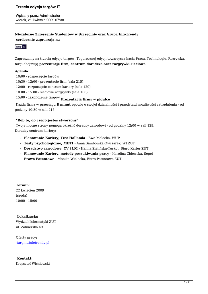 Trzecia edycja targów IT Wpisany przez Administrator wtorek, 21 kwietnia 2009 07:38 Niezależne Zrzeszenie Studentów w Szczecinie oraz Grupa InfoTrendy serdecznie zapraszają na Zapraszamy na trzecią edycję targów. Tegorocznej edycji towarzyszą hasła Praca, Technologie, Rozrywka, targi obejmują prezentacje firm, centrum doradcze oraz rozgrywki sieciowe. Agenda: 10:00 - rozpoczęcie targów 10:30 - 12:00 - prezentacje firm (sala 215) 12:00 - rozpoczęcie centrum kariery (sala 129) 10:00 - 15:00 - sieciowe rozgrywki (sala 100) 15:00 - zakończenie targów Prezentacja firmy w pigułce Każda firma w przeciągu 8 minut opowie o swojej działalności i przedstawi możliwości zatrudnienia - od godziny 10:30 w sali 215 "Rób to, do czego jesteś stworzony" Twoje mocne strony pomogą określić doradcy zawodowi - od godziny 12:00 w sali 129. Doradcy centrum kariery: - Planowanie Kariery, Test Hollanda - Ewa Małecka, WUP - Testy psychologiczne, MBTI - Anna Samborska-Owczarek, WI ZUT - Doradztwo zawodowe, CV i LM - Hanna Zielińska-Turkot, Biuro Karier ZUT - Planowanie Kariery, metody poszukiwania pracy - Karolina Zblewska, Segel - Prawo Patentowe - Monika Wielecka, Biuro Patentowe ZUT Termin: 22 kwiecień 2009 (środa) 10:00 - 15:00 Lokalizacja: Wydział Informatyki ZUT ul. Żołnierska 49 Oferty pracy: targi-it.infotrendy.pl Kontakt: Krzysztof Wiśniewski 1/2 Trzecia edycja targów IT Wpisany przez Administrator wtorek, 21 kwietnia 2009 07:38 [email protected] Dodatkowe informacje i oferty pracy: targi-it.infotrendy.pl 2/2