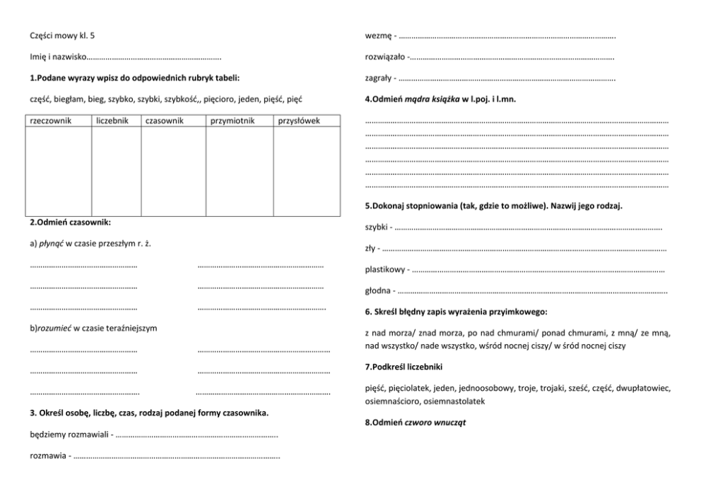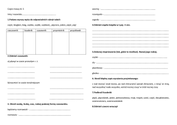 Części mowy kl. 5 wezmę - …………………………………………………………………………………………. Imię i nazwisko………………………………………………………. rozwiązało -……………………………………………………………………………………. 1.Podane wyrazy wpisz do odpowiednich rubryk tabeli: zagrały - …………………………………………………………………………………………. część, biegłam, bieg, szybko, szybki, szybkość,, pięcioro, jeden, pięść, pięć 4.Odmień mądra książka w l.poj. i l.mn. rzeczownik ……………………………………………………………………………………………………………………………… ……………………………………………………………………………………………………………………………… ……………………………………………………………………………………………………………………………… ……………………………………………………………………………………………………………………………… ……………………………………………………………………………………………………………………………… ……………………………………………………………………………………………………………………………… liczebnik czasownik przymiotnik przysłówek 5.Dokonaj stopniowania (tak, gdzie to możliwe). Nazwij jego rodzaj. 2.Odmień czasownik: szybki - ………………………………………………………………………………………………………………. a) płynąć w czasie przeszłym r. ż. zły - ……………………………………………………………………………………………………………………… …………………………………………… …………………………………………………… …………………………………………… …………………………………………………… …………………………………………… ……………………………………………………. b)rozumieć w czasie teraźniejszym plastikowy - ………………………………………………………………………………………………………… głodna - ……………………………………………………………………………………………………………….. 6. Skreśl błędny zapis wyrażenia przyimkowego: …………………………………………… ……………………………………………………… z nad morza/ znad morza, po nad chmurami/ ponad chmurami, z mną/ ze mną, nad wszystko/ nade wszystko, wśród nocnej ciszy/ w śród nocnej ciszy …………………………………………… ……………………………………………………… 7.Podkreśl liczebniki ……………………………………………. ………………………………………………………. pięść, pięciolatek, jeden, jednoosobowy, troje, trojaki, sześć, część, dwupłatowiec, osiemnaścioro, osiemnastolatek 3. Określ osobę, liczbę, czas, rodzaj podanej formy czasownika. 8.Odmień czworo wnucząt będziemy rozmawiali - ………………………………………………………………….. rozmawia - …………………………………………………………………………………….. Imię i nazwisko……………………………………………………………..klasa…5… Części mowy 1. Wypisz z tekstu wszystkie czasowniki, określ ich formę gramatyczną. Wyszliśmy z obozu, pan Rateau szedł pierwszy, a za nim my, drużynami, razem z drużynowymi. Zupełnie jak w prawdziwym pochodzie. Kazano nam śpiewać mnóstwo piosenek i śpiewaliśmy bardzo głośno, bo byliśmy bardzo dumni. Szkoda tylko, że było jeszcze wcześnie i nikt nas nie widział, szczególnie kiedy żeśmy przechodzili koło pensjonatów, gdzie spędza wakacje pełno ludzi. Chociaż w końcu otworzyło się jedno okno i jakiś pan zawołał: - Czy wyście powariowali, żeby urządzać krzyki o tej porze? (fragm. „Wakacje Mikołajka”) ……………………………………………………………………………………………………………………………………………………………………………………………………… ……………………………………………………………………………………………………………………………………………………………………………………………………… ……………………………………………………………………………………………………………………………………………………………………………………………………… ……………………………………………………………………………………………………………………………………………………………………………………………………… ……………………………………………………………………………………………………………………………………………………………………………………………………… …………………………………………………………………………………………………………………………………………………………………………………………………… 2. Od bezokolicznika „kląć” utwórz: a) b) c) d) 1 osobę l. mn. trybu rozkazującego ……………………………………………………. 3 osobę l. poj. trybu rozkazującego…………………………………………………….. 2 osobę l.mn. r. mos. trybu
