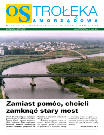 S B I U L E T Y N TROŁĘKA A M O R Z Ą D O W A I N F O R M A C Y J N Y M I A S T A MIESIĘCZNIK BEZPŁATNY O S T R O Ł Ę K I MAJ/CZERWIEC 2015 Nr 3 (23) Zamiast pomóc, chcieli zamknąć stary most Dzień 25 maja mógł się zakończyć prawdziwym paraliżem komunikacyjnym miasta i regionu. Wojewoda Jacek Kozłowski oraz wojewódzki inspektor nadzoru budowlanego Jaromir Grabowski przyjechali do Ostrołęki z zamiarem zamknięcia starego mostu. Wcześniej prezydenci Janusz Kotowski i Paweł Stańczyk wielokrotnie wysyłali pisma i uczestniczyli w spotkaniach u wojewody, prosząc o konkretną pomoc w sprawie remontu mostu. Prócz snucia ogólnych rozważań przedstawiciele władz rządowych nie udzielili miastu żadnej pomocy. Dokończenie na str. 3 Z Ż Y C IA SAMORZĄDU Zapachniało przedwojenną Ostrołęką www.ostroleka.pl Jubileusz „Piątki” Szkoła Podstawowa nr 5 obchodziła dziesiątą rocznicę nadania imienia Zofii Niedziałkowskiej i wręczenia sztandaru. Swój jubileusz uczniowie, pedagodzy, rodzice i zaproszeni goście świętowali w hali sportowo-widowiskowej im. A. Gołasia. W jeden z majowych weekendów powrócił do Ostrołęki czar garnizonowego miasta. Na ulicach znów było słychać stukot końskich kopyt. Przez Ostrołękę przejechali w szyku defiladowym jeźdźcy kontynuujący tradycję 5. Pułku Ułanów Zasławskich. Nie zabrakło śpiewanych przez nich żurawiejek i patriotycznych pieśni. Dzień wcześniej jeźdźcy rywalizowali na nadnarwiańskich błoniach w konkurencjach kawaleryjskich. Imprezę zorganizowało Stowarzyszenie Sympatyków 5. Pułku Ułanów Zasławskich. W uroczystościach udział wzięli między innymi przedstawiciele samorządu: przewodniczący Rady Miasta – Jerzy Grabowski, prezydent Ostrołęki – Janusz Kotowski, reprezentanci kuratorium, władz oświatowych miasta oraz rodziny patronki. Wszyscy gratulowali szkole osiągnięć i przekazywali same dobre życzenia całej szkolnej społeczności. - Jesteśmy dumni z naszej szkoły, a nasza patronka byłaby zapewne dumna z tego, że ciągle obecna jest w naszej placówce mająca głęboką tradycję kultura. Jesteśmy szkołą, gdzie nikt nie żałuje wychowawczego trudu, by prawda i dobro zwyciężało w ludzkich sercach oraz, tak jak pragnęła nasza patronka, nieustannie rosła kultura i rzetelność w codziennym obcowaniu z ludźmi – mówiła podczas uroczystości dyrektor SP nr 5, Beata Kowalczyk. Spotkanie zakończyła bardzo ciekawa część artystyczna przygotowana przez „piątkowiczów”. Goście w Ratuszu Wiceprezydent Paweł Stańczyk i dyrektor Wydziału Oświaty UM Mirosław Rosak spotkali się z przebywającymi w Ostrołęce uczestnikami międzynarodowej wymiany uczniów Comenius. Goście z Turcji, Słowenii, Portugalii i Szkocji przyjechali na zaproszenie Zespołu Szkół STO. W trakcie tygodniowej wizyty w naszym kraju uczestnicy wymiany zwiedzili Warszawę, w której obejrzeli m.in. Centrum Nauki „Kopernik” i odwiedzili Białowieski Park Narodowy. W siedzibie władz miasta zapoznali się z pracą ostrołęckiego samorządu, jego obowiązkami i zasadami działania. Spotkanie w ratuszu było też okazją do podziękowania samorządowi miasta za wspieranie programu 2 międzynarodowej współpracy. Od 13 czerwca przebywali w Ostrołęce także goście z miasta Antalya w Turcji. Grupa ta współpracuje z Zespołem Szkół nr 5. Młodzież z Turcji mieszkała OSTROŁĘKA SAMORZĄDOWA maj/czerwiec 2015 w domach swoich kolegów z Ostrołęki. Młodzi Turcy zwiedzili Warszawę, Gdańsk, pływali kajakami na Mazurach. Ostrołęka i Polska bardzo się im podobały. www.ostroleka.pl K O M E N TA R Z Szanowni Państwo, Nadchodzą wakacje. To chyba najlepsza wiadomość dla wielkiej grupy Ostrołęczan związanych z oświatą. Serdecznie dziękuję dyrektorom, nauczycielom, pracownikom szkół i przedszkoli oraz naszym uczniom – małym i prawie dorosłym, za wszystkie wysiłki i starania, gratuluję sukcesów – tych skromnych i tych wielkich. Życzę, by czas wakacyjny był piękny, obfitował w wypoczynek, ciekawe przeżycia i piękne spotkania z ludźmi. Maturzystom „ruszającym w świat” życzę szczęścia, pięknego rozwoju, ale też wierności największym wartościom, które od wieków wyróżniały i kształtowały ludzi naszej ziemi. Czerwiec to też czas różnych sprawozdań, bilansów i podsumowań. Rozliczamy sprawozdawczo rok 2014 w samorządzie, spółkach i instytucjach miejskich. Jaki obraz się wyłania? „Zdaliśmy” kolejne egzaminy w bardzo trudnych dla samorządu czasach. Regionalna Izba Obrachunkowa bez zastrzeżeń przyjęła sprawozdanie budżetowe. Miasto ma niski poziom zadłużenia, nie zlikwidowaliśmy żadnej placówki szkolnej, nie podnosiliśmy podatków lokalnych, nie było zwolnień w instytucjach samorządowych. Spółki miejskie podsumowały rok na małym „plusie”. OTBS prowadziło potężną inwestycję miejską – budowę stacji segregacji. MZK ze swoimi inwestycjami i programami unijnymi należy do czołówki krajowej, cieszą inwestycje prowadzone w OPWiK i programy realizowane w ARR. Wnioski nasuwają się same. Mamy w mieście wiele problemów, doskwiera brak środków i wsparcia rządowego , zwłaszcza na zadania zlecone samorządowi przez państwo. Ale miasto funkcjonuje na przyzwoitym poziomie. Warto to zauważyć i ucieszyć się tym, co jest oraz krok po kroku rozwiązywać problemy. Prezydent Ostrołęki Zamiast pomóc, chcieli zamknąć stary most Dokończenie ze str. 1 Co gorsza przed spotkaniem z prezydentem (planowanym na godz. 14:00), wojewoda i jego współpracownicy zwołali konferencję prasową i zamierzali ogłosić zamknięcie mostu. O planowanej „ustawce” wojewody i próbie przerzucenia odpowiedzialności na miasto świadczy choćby fakt, że wojewoda i jego służby doskonale wiedziały o zleconych przez prezydenta kolejnych szczegółowych, specjalistycznych badaniach stanu mostu. Wyniki ty