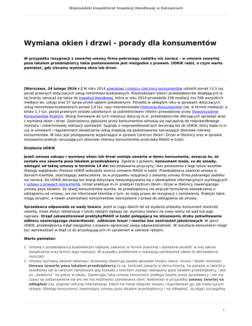 Wojewódzki Inspektorat Inspekcji Handlowej w Katowicach Wymiana okien i drzwi - porady dla konsumentów W przypadku rezygnacji z zawartej umowy firma pobranego zadatku nie zwraca – w umowie zawartej poza lokalem przedsiębiorcy takie postanowienie jest niezgodne z prawem. UOKiK radzi, o czym warto pamiętać, gdy zlecamy wymianę okna lub drzwi. [Warszawa, 24 lutego 2016 r.] W roku 2014 powiatowi i miejscy rzecznicy konsumentów udzielili ponad 13,5 tys. porad prawnych dotyczących usług remontowo-budowlanych. Poszkodowani klienci przedsiębiorców działających w tej branży zwracali się także do Inspekcji Handlowej, która w roku 2014 prowadziła 158 mediacji (na 556 wszystkich mediacji ws. usług) oraz 57 spraw przed sądami polubownymi. Ponadto w ubiegłym roku w sprawach dotyczących usług remontowo-budowlanych ponad 1,6 tys. razy interweniowała Federacja Konsumentów (np. w formie mediacji), a blisko 1,7 tys. porad prawnych zostało udzielonych za pośrednictwem infolinii prowadzonej przez Stowarzyszenie Konsumentów Polskich. Skargi kierowane do tych instytucji dotyczą m.in. przedsiębiorców oferujących sprzedaż wraz z wymianą okien i drzwi. Zastrzeżenia zgłaszane przez konsumentów odnoszą się najczęściej do nieprawidłowego montażu i nieterminowej realizacji zamówień. Sygnały o nieprawidłowościach docierają też do UOKiK, który bada m.in. czy w umowach i regulaminach świadczenia usług znajdują się postanowienia naruszające zbiorowe interesy konsumentów. W toku jest postępowanie wyjaśniające w sprawie Centrum Okien i Drzwi w Oleśnicy oraz w sprawie stosowania praktyk naruszających zbiorowe interesy konsumentów przeciwko MAGO w Łodzi. Działania UOKiK Jeżeli umowa zakupu i wymiany okien lub drzwi zostaje zawarta w domu konsumenta, oznacza to, że została ona zawarta poza lokalem przedsiębiorcy. Zgodnie z prawem, konsument może, co do zasady, odstąpić od takiej umowy w terminie 14 dni bez podawania przyczyny i bez ponoszenia z tego tytułu kosztów. Dlatego wątpliwości Prezesa UOKiK wzbudziły wzorce umowne MAGO w Łodzi. Przedsiębiorca zawierał umowy w domach klientów, zastrzegając jednocześnie, że w przypadku rezygnacji z zawartej umowy firma pobranego zadatku nie zwraca. Do UOKiK docierają też skargi dotyczące niewywiązywania się z obowiązków informacyjnych wynikających z ustawy o prawach konsumenta. Urząd analizuje m.in. praktyki Centrum Okien i Drzwi w Oleśnicy zawierającego umowy poza lokalem. Ze skarg konsumentów wynika, że przedsiębiorca nie wręczał formularza oświadczenia o odstąpieniu od umowy, ani nie informował klientów o tym, że mają prawo do rezygnacji z zamówienia. Praktyki takie mogą utrudnić, a nawet uniemożliwić konsumentowi skorzystanie z prawa do odstąpienia od umowy. Sprzedawca odpowiada za wady towaru. Jeżeli w ciągu dwóch lat od wydania produktu konsument stwierdzi usterkę, może złożyć reklamację z tytułu rękojmi żądając np. wymiany towaru na nowy wolny od wad lub jego naprawy. Urząd zakwestionował praktykęMAGO w Łodzi polegającą na stosowaniu druku pokwitowania odbioru zawierającego stwierdzenie: odbieram towar i montaż bez zastrzeżeń jakościowych. W opinii UOKiK, przedsiębiorca mógł niezgodnie z prawem ograniczać swoją odpowiedzialność. W rezultacie konsumenci mogli być wprowadzani w błąd co do przysługujących im uprawnień w zakresie rękojmi. Warto pamiętać: 1. Umowę z przedsiębiorcą budowlanym najlepiej zawierać w formie pisemnej i dokładnie określić w niej zakres świadczenia oraz termin jego realizacji. W wypadku problemów z realizacją zamówienia ułatwi to dochodzenie roszczeń. 2. Umowy wymiany stolarki okiennej i drzwiowej obejmują zwykle sprzedaż towaru (okna i drzwi) i dzieło (montaż). Umowa zawarta poza lokalem przedsiębiorcy to np. kontrakt zawarty w domu klienta, na pokazie w świetlicy osiedlowej lub w centrum handlowym gdy kontakt z klientem zostaje nawiązany poza lokalem przedsiębiorcy i jest on „zwabiony” na pokaz w lokalu. Zawierając taką umowę konsument podlega zwykle presji sprzedawcy i nie ma czasu na zastanowienie się ani nie ma możliwości porównania ofert. Natomiast w przypadku umowy zwartej na odległość (np. poprzez witrynę internetową), klient nie może obejrzeć towaru i wypróbować go, jak tradycyjnym sklepie. Dlatego konsumenci zawierający umowy poza lokalem przedsiębiorcy i na odległość, są objęci szczególną 1 Wojewódzki Inspektorat Inspekcji Handlowej w Katowicach 3. 4. 5. 6. ochroną w postaci prawa do odstąpienia od umowy w ciągu 14 dni, bez ponoszenia z tego tytułu kosztów. Jednak prawo do odstąpienia od umowy zawartej poza lokalem przedsiębiorcy i na odległość nie dotyczy m.in. rzeczy wyprodukowanej według specyfikacji konsumenta – np. drzwi na zamówienie o niestandardowych wymiarach. Wielu przedsiębiorców przed wykonaniem zlecenia pobiera od klientów zadatek lub zaliczkę. Warto pamiętać o różnicy pomiędzy tymi formami przedpłat. Jeżeli konsument rezygnuje z usługi po wpłacie zaliczki, może domagać się jej zwrotu. Gdy klient rezygnuje ze zlecenia po wpłacie zadatku, wykonawca ma prawo zatrzymać pieniądze (chyba że umowa określa to inaczej). Wyjątkiem jest sytuacja, gdy konsumentowi przysługuje ustawowe prawo do odstąpienia od umowy zawartej poza lokalem przedsiębiorcy. Natomiast gdy po wpłacie zadatku od umowy odstępuje wykonawca, klientowi przysługuje zwrot dwukrotności wpłaconej kwoty (chyba że umowa określa to inaczej). Jeżeli w ciągu dwóch lat od wydania towaru konsument stwierdzi jego wadę, ma prawo złożyć reklamację z tytułu rękojmi. Gdy usterka została zauważona w ciągu pierwszego roku, sytuacja jest korzystniejsza dla konsumenta, ponieważ domniemywa się, że wada istniała w chwili wydania towaru. Oznacza to, że w wypadku sporu przed sądem to przedsiębiorca będzie musiał udowodnić, że je