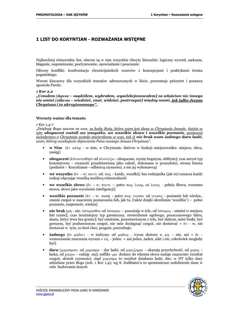 PNEUMATOLOGIA – DAR JĘZYKÓW 1 Koryntian – Rozważania wstępne 1 LIST DO KORYNTIAN - ROZWAŻANIA WSTĘPNE Najbardziej różnorodny list, obecne są w nim wszystkie chwyty literackie: logiczny wywód, sarkazm, błaganie, napominanie, poetyzowanie, opowiadanie i pouczanie. Główny konflikt: konfrontacja chrześcijańskich wzorców z koncepcjami i praktykami świata pogańskiego. Werset kluczowy dla wszystkich tematów adresowanych w liście, prezentuje priorytet i postawę apostoła Pawła: 1 Kor 2,2 „Uznałem [¦krina – osądziłem, wybrałem, wyselekcjonowałem] za właściwe nic innego nie umieć [eÆdeinai – wiedzieć, znać, widzieć, postrzegać] między wami, jak tylko Jezusa Chrystusa i to ukrzyżowanego”. Wersety ważne dla tematu 1 Kor 1,4-7 „Dziękuję Bogu zawsze za was, za łaskę Bożą, która wam jest dana w Chrystusie Jezusie, iżeście w nim ubogaceni zostali we wszystko, we wszelkie słowo i wszelkie poznanie, ponieważ świadectwo o Chrystusie zostało utwierdzone w was, tak iż nie brak wam żadnego daru łaski, wam, którzy oczekujecie objawienia Pana naszego Jezusa Chrystusa”. • w Nim [¦n aÛtå - w nim, w Chrystusie; dativus w funkcji miejscownika: miejsce, sfera, zasięg] • ubogaceni [¦ploutisq0te od ploutizw - ubogacam, czynię bogatym, obfitym]; czas aoryst typ konstatywny - czynność przedstawiona jako całość, dokonana w przeszłości, strona bierna (podmiot - Koryntianie - odbiorcą czynności, a nie jej wykonawcą) • we wszystko [¦n – w; panti od: paH - każdy, wszelki]; bez rodzajnika (jak tu) oznacza każdy rodzaj włączając wszelką możliwą różnorodność • we wszelkie słowo [¦n – w; panti – patrz paH; logå, od logoH - pełnia Słowa, rozumna mowa, słowo jako wyrażenie inteligencji] • wszelkie poznanie [¦n – w; pas® - patrz paH; gnwsei od gnwsiH - poznanie lub wiedza,. znanie czegoś w znaczeniu poznawania lub, jak tu, (także dzięki określeniu ‘wszelkie’) – pełne poznanie, znajomość, wiedza] • nie brak [m0 - nie; Ûsteresqai od Ûsterew – pozostaję w tyle, od ÛsteroH - ostatni w miejscu lub czasie]; czas teraźniejszy typ gnomiczny, stwierdzenie ogólnego, pozaczasowego faktu, stanu, który trwa bez granic]; być ostatnim, pozostawionym z tyłu, być słabym, mieć braki, być gorszym, być pozbawionym czegoś, nie móc dosięgnąć czegoś, nie dostawać + ¦n – w, nie dostawać w tym, co ktoś chce, pragnie, potrzebuje; • żadnego [¦n mhdeni – w żadnym; od mhdeiH - wyraz złożony z: mh – nie, ani + de wzmocnienie znaczenia wyrazu + eÆH - jeden = ani jeden, żaden, nikt i nic, cokolwiek mogłoby być] • daru [carismati od carisma - dar łaski, od carizomai - okazuję przychylność, od cariH łaska, od cairw – raduję się]; suffiks -ma dodany do rdzenia słowa nadaje znaczenie: rezultat czegoś, skutek czynności; stąd carisma to rezultat działania łaski, dar; w NT tylko dary udzielane przez Boga (zob. 1 Kor 1,4); wg S. Zodhiates’a to spontaniczne uzdolnienie dane w celu budowania innych KOŚCIÓŁ EWANGELICZNY MISJA ŁASKI W WARSZAWIE www.ggwo.pl PNEUMATOLOGIA – DAR JĘZYKÓW 1 Koryntian – Rozważania wstępne 1 Kor 2,12 „Otrzymaliśmy Ducha, który jest z Boga, abyśmy wiedzieli, czym nas Bóg łaskawie obdarzył” (dosł. „aby znaliśmy te przez Boga darowane nam”) • te – [ta - te (rzeczy)] • przez Boga [ßpo qeou ] • darowane [carisqenta od carizomai – okazuję przychylność, od cariH - łaska, od cairw – raduję się]; deponens medialny (strona czynna, ale końcówki charakterystyczne dla strony zwrotnej), imiesłów (rodzaj czynności w pierwszym planie) aoryst – czynność jako całość, dokonana w przeszłości, strona bierna – podmiot („my”) odbiorcą czynności; suffiks –izo – nadaje czasownikowi znaczenie: powoduję coś, podkreśla siłę działania czynności Najczęstsze znaczenie w NT – wybaczyć, darować, łaskawie usunąć czyjś grzech (Kol 2,13), karę, w stronie biernej - być obdarzonym czymś. Paweł zdecydował się na użycie tego czasownika, a nie caritow (zob. poniżej), zatem mocniejszego słowa, używanego w kontekście ofiary Jezusa Chrystusa caritow– zaszczycam, wysoko honoruję, okazuję wszelką przychylność; suffiks -ow nadaje znaczenie – czynię kogoś czymś; o Marii w Łk 1,28, o wierzących w Ef 1,6 (obdarzyć łaską w umiłowanym), nie tylko udzielenie Bożej łaski, ale adopcja do Bożej rodziny poprzez udzielenie szczególnej przychylności. 1 Kor 2,13 „Głosimy to nie w uczonych słowach ludzkiej mądrości, lecz w Słowach, które naucza Duch, przykładając do duchowych rzeczy duchową miarę” (dosł. „ale w wyuczonych Ducha duchowymi (rzeczy) duchowe zestawiając” • rzeczy duchowe [pneumatika od pneumatikoH - duchowy od pneuma – tchnienie, oddech]; suffiks –-ikoH wskazuje na przynależność, podobieństwo, stąd duchowy, przynależny Duchowi, na podobieństwo Ducha; przekazany lub udzielony przez Ducha; sformułowanie to występuje w Rz 1,11 carisma pneumatikon – dosł. dar łaski duchowy, oraz w 1 Kor 12,1 (co do darów duchowych – w grece: co do rzeczy duchowych) • zestawiając [sunkrinonteH od sunkrinw = sun - razem + krinw - osądzam, zestawiam razem i porównuję]; imiesłów czasu teraźniejszego, okolicznik środków – wskazuje na środki, za pomocą których czynność czasownika głównego jest osiągana 1 Kor 3,1-2 „I ja, bracia,. nie mogłem mówić do was jako do duchowych, lecz jako do cielesnych (dosł. jak duchowym, ale jak cielesnym), jako do niemowląt w Chrystusie. Poiłem was mlekiem, nie stałym pokarmem, bo jeszcze go przyjąć nie mogliście, a i teraz jeszcze nie możecie (dosł. „ale ani jeszcze teraz nie możecie”)” • I ja [k•gw] – podkreślenie autorytetu osoby mówiącej • bracia [•defloi – społeczność życia oparta na tożsamości pochodzenia]; Paweł stawia się w pozycji nie nauczyciela, ale wspó