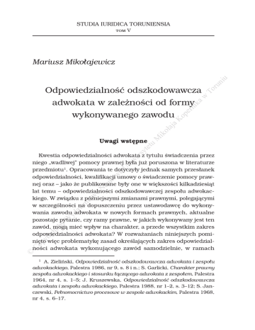 STUDIA IURIDICA TORUNIENSIA tom V sy t et u Uwagi wstępne M ik oł aj a K op er n ik aw To r Odpowiedzialność odszkodowawcza adwokata w zależności od formy wykonywanego zawodu un iu Mariusz Mikołajewicz © Co p yt ig ht by W yd aw ni ct w o N au k ow eU ni w er Kwestia odpowiedzialności adwokata z tytulu świadczenia przez niego „wadliwej” pomocy prawnej była już poruszona w literaturze przedmiotu1. Opracowania te dotyczyły jednak samych przesłanek odpowiedzialności, kwalifikacji umowy o świadczenie pomocy prawnej oraz – jako że publikowane były one w większości kilkadziesiąt lat temu – odpowiedzialności odszkodowawczej zespołu adwokackiego. W związku z późniejszymi zmianami prawnymi, polegającymi w szczególności na dopuszczeniu przez ustawodawcę do wykonywania zawodu adwokata w nowych formach prawnych, aktualne pozostaje pytanie, czy ramy prawne, w jakich wykonywany jest ten zawód, mogą mieć wpływ na charakter, a przede wszystkim zakres odpowiedzialności adwokata? W rozważaniach niniejszych pominięto więc problematykę zasad określających zakres odpowiedzialności adwokata wykonującego zawód samodzielnie, w ramach 1 A. Zieliński, Odpowiedzialność odszkodowawcza adwokata i zespołu adwokackiego, Palestra 1986, nr 9, s. 8 i n.; S. Garlicki, Charakter prawny zespołu adwokackiego i stosunku łączącego adwokata z zespołem, Palestra 1964, nr 4, s. 1–5; J. Kruszewska, Odpowiedzialność odszkodowawcza adwokata i zespołu adwokackiego, Palestra 1988, nr 1–2, s. 3–12; S. Janczewski, Pełnomocnictwo procesowe w zespole adwokackim, Palestra 1968, nr 4, s. 6–17. 166 Mariusz Mikołajewicz eU ni w er sy t et u M ik oł aj a K op er n ik aw To r un iu kancelarii. Wynika to z faktu, że kwestia ta nie budzi większych wątpliwości; adwokat za szkodę spowodowaną wadliwą pomocą prawną odpowiada w sposób nieograniczony, osobiście i wprost. Skupiono się natomiast na pozostałych formach prawnych wykonywania zawodu adwokata oraz podjęto próbę przybliżenia sytuacji prawnej „nieudolnego” prawnika w kontekście obowiązku odszkodowawczego powstałego w związku z błędem w sztuce. Wskazać należy, że choć od 2000 r. adwokaci wykonujący zawód podlegają obowiązkowemu ubezpieczeniu odpowiedzialności cywilnej2, to jednak – co istotne – odszkodowanie z ubezpieczenia OC ustala się i wypłaca w granicach odpowiedzialności cywilnej ubezpieczonego. Stąd też w niniejszych rozważaniach pominięto problematykę związaną z umową ubezpieczenia i procesem likwidacji szkody przez zakład ubezpieczeń, w szczególności pominięta została problematyka dochodzenia przez poszkodowanego roszczeń bezpośrednio od zakładu ubezpieczeń na zasadzie actio directa. N au k ow Odpowiedzialność adwokata wykonującego zawód w zespole adwokackim © Co p yt ig ht by W yd aw ni ct w o Jak wynika z uchwały Sądu Najwyższego z 11 marca 1988 r., za szkodę spowodowaną klientowi uchybieniem adwokata, będącego członkiem zespołu adwokackiego, w związku z obowiązkiem starannego działania przy wykonywaniu zlecenia udzielenia pomocy prawnej odpowiedzialność ponosi wyłącznie zespół adwokacki3. W uzasadnieniu swego stanowiska Sąd podkreślił, że to wyposażony w podmiotowość prawną zespół adwokacki (art. 10 ustawy Prawo o adwokaturze4) jest stroną umowy o świadczenie pomocy prawnej (zlecenia); jedynie przez osoby fizyczne – adwokatów, którzy świadczą usługi dla zespołu adwokackiego, podmiot ten realizuje 2 Art. 8a ustawy z 26.05.1982 r. – Prawo o adwokaturze (tekst jednolity Dz.U. z 2002 r. Nr 123, poz. 1058). 3 Uchwała SN – Izba Cywilna z 11.03.1988 r., III CZP 12/88, OSNCP 1989, nr 6, poz. 98, s. 31; Palestra 1988, nr 10, s. 112. 4 Ustawa z 26.05.1982 r. – Prawo o adwokaturze (tekst jednolity Dz.U. z 2002 r. Nr 123, poz. 1058 – dalej pr. adw.). 167 © Co p yt ig ht by W yd aw ni ct w o N au k ow eU ni w er sy t et u M ik oł aj a K op er n ik aw To r un nałożone umową obowiązki. Jedynym węzłem prawnym, łączącym adwokata z klientem-kontrahentem zespołu, jest stosunek pełnomocnictwa, niemodyfikujący bynajmniej treści stosunku zlecania pomiędzy klientem a zespołem, będącego podstawą udzielenia pełnomocnictwa. Co istotne, na kliencie spoczywa obowiązek zapłaty wynagrodzenia wyłącznie na rzecz zespołu adwokackiego; adwokat nie może wypowiedzieć pełnomocnictwa bez zgody kierownika zespołu. Przemawia to – zdaniem Sądu – przeciwko traktowaniu adwokata jako osoby trzeciej (art. 391 k.c.) albo zastępcy (art. 738 k.c.), a więc nie uzasadnia odpowiedzialności adwokata wobec kontrahenta zespołu. O ile prezentowane stanowisko Sądu rozstrzygnęło dość jednoznacznie podstawowy dylemat co do tego, „kto odpowiada wobec klienta”, to wydaje się, że przytoczone wyżej orzeczenie, wbrew pozorom, nie wyjaśnia wszystkich mogących się pojawić wątpliwości. Wciąż jako aktualne jawią się bowiem pytania, czy wobec popełnienia przez adwokata błędu w sztuce z roszczeniem regresowym przeciwko nieudolnemu prawnikowi może wystąpić zespół adwokacki; czy adwokat w jakikolwiek sposób może ponieść odszkodowawcze konsekwencje swojego zawinionego zachowania? Aby odpowiedzieć na to pytanie, należy wskazać, że odpowiedzialność zespołu adwokackiego podlegać będzie ogólnym przepisom regulującym reżim odpowiedzialności ex contractu (art. 471 k.c. i n.). Przyjęcie stanowiska, że adwokat nie jest zastępcą, oznacza, że wskazana odpowiedzialność na zasadach ogólnych nie jest modyfikowana postanowieniami wymienionego już art. 738 k.c. W doktrynie, przy formułowaniu wykładni przepisu art. 474 k.c.5, panuje powszechny pogląd, że o podstawie i zakresie tej odpowiedzialności regresowej pomocników (i „zastępczych wykonawców”), za których dłużnik odpowiada wobec wierzyciela (art. 474 k.c.), rozstrzyga każdorazowo treść łączącego ich stosunku prawnego