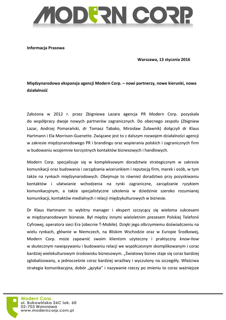 Informacja Prasowa Warszawa, 13 stycznia 2016 Międzynarodowa ekspansja agencji Modern Corp. – nowi partnerzy, nowe kierunki, nowa działalność Założona w 2012 r. przez Zbigniewa Lazara agencja PR Modern Corp. pozyskała do współpracy dwoje nowych partnerów zagranicznych. Do obecnego zespołu (Zbigniew Lazar, Andrzej Pomarański, dr Tomasz Tabako, Mirosław Żuławnik) dołączyli dr Klaus Hartmann i Ela Morrison-Guenette. Związane jest to z dalszym rozwojem działalności agencji w zakresie międzynarodowego PR i brandingu oraz wspierania polskich i zagranicznych firm w budowaniu wzajemnie korzystnych kontaktów biznesowych i handlowych. Modern Corp. specjalizuje się w kompleksowym doradztwie strategicznym w zakresie komunikacji oraz budowania i zarządzania wizerunkiem i reputacją firm, marek i osób, w tym także na rynkach międzynarodowych. Obejmuje to również doradztwo przy pozyskiwaniu kontaktów i ułatwianie wchodzenia na rynki zagraniczne, zarządzanie ryzykiem komunikacyjnym, a także specjalistyczne szkolenia w dziedzinie szeroko rozumianej komunikacji, kontaktów medialnych i relacji międzykulturowych w biznesie. Dr Klaus Hartmann to wybitny manager i ekspert szczycący się wieloma sukcesami w międzynarodowym biznesie. Był między innymi wieloletnim prezesem Polskiej Telefonii Cyfrowej, operatora sieci Era (obecnie T-Mobile). Dzięki jego olbrzymiemu doświadczeniu na wielu rynkach, głównie w Niemczech, na Bliskim Wschodzie oraz w Europie Środkowej, Modern Corp. może zapewnić swoim klientom użyteczny i praktyczny know-how w skutecznym nawiązywaniu i budowaniu relacji we współczesnym skomplikowanym i coraz bardziej wielokulturowym środowisku biznesowym. „Światowy biznes staje się coraz bardziej zglobalizowany, a jednocześnie coraz bardziej wrażliwy i wyczulony na szczegóły. Właściwa strategia komunikacyjna, dobór „języka” i nazywanie rzeczy po imieniu to coraz ważniejsze aspekty nawiązywania i utrwalania skutecznych relacji biznesowych opartych na zaufaniu. Cieszę się, że mogę w tym aspekcie wesprzeć klientów Modern Corp.” – powiedział Klaus Hartmann. Ela Morrison-Guenette posiada wieloletnie doświadczenie w dziedzinie PR i komunikacji zarówno w międzynarodowych korporacjach, jak i instytucjach rządowych. Pracowała między innymi dla takich gigantów, jak General Motors Corporation oraz Delphi, a także w departamencie handlu ambasady USA w Warszawie. Wesprze ona swoimi umiejętnościami i wiedzą działalność agencji głównie w obszarze komunikacji i PR dla samorządów oraz organizacji pożytku publicznego, ze szczególnym uwzględnieniem pozyskiwania funduszy (fundraising) dla akcji społecznych. Jak sama mówi: „Wiem, jak to należy robić – i robię to skutecznie w krajach, które są tego kolebką - w USA i Kanadzie”. Zbigniew Lazar dodaje: „To dla nas ogromny zaszczyt, że możemy korzystać z bogactwa wiedzy i doświadczenia tak wybitnych ekspertów w swoich dziedzinach, jak Klaus i Ela. Poszerzą oni między innymi sieć kontaktów międzynarodowych Modern Corp., co zaowocuje dodatkowymi korzyściami dla naszych klientów. Współczesny skuteczny PR i komunikacja to nie jedynie eventy i liczba artykułów lub tzw. postów. To umiejętne łączenie funkcji zarządczych z dbałością o profesjonalne wykonanie i najwyższe standardy w sposobie komunikowania się z coraz bardziej wymagającym otoczeniem biznesowym i społecznym, w tym także na styku agencja-klient”. Kolejną nowością w Modern Corp. jest nowa strona internetowa prezentująca zakres działalności oraz zespół agencji. Responsywny serwis został zbudowany w oparciu o nowoczesne rozwiązania na zasadzie tzw. rozbudowanego one page i jest w pełni obsługiwany przez urządzenia mobilne. Ma nowy layout i funkcjonalności, takie jak między innymi blog i agencyjny kanał video. Więcej informacji o Modern Corp.: www.moderncorp.com.pl