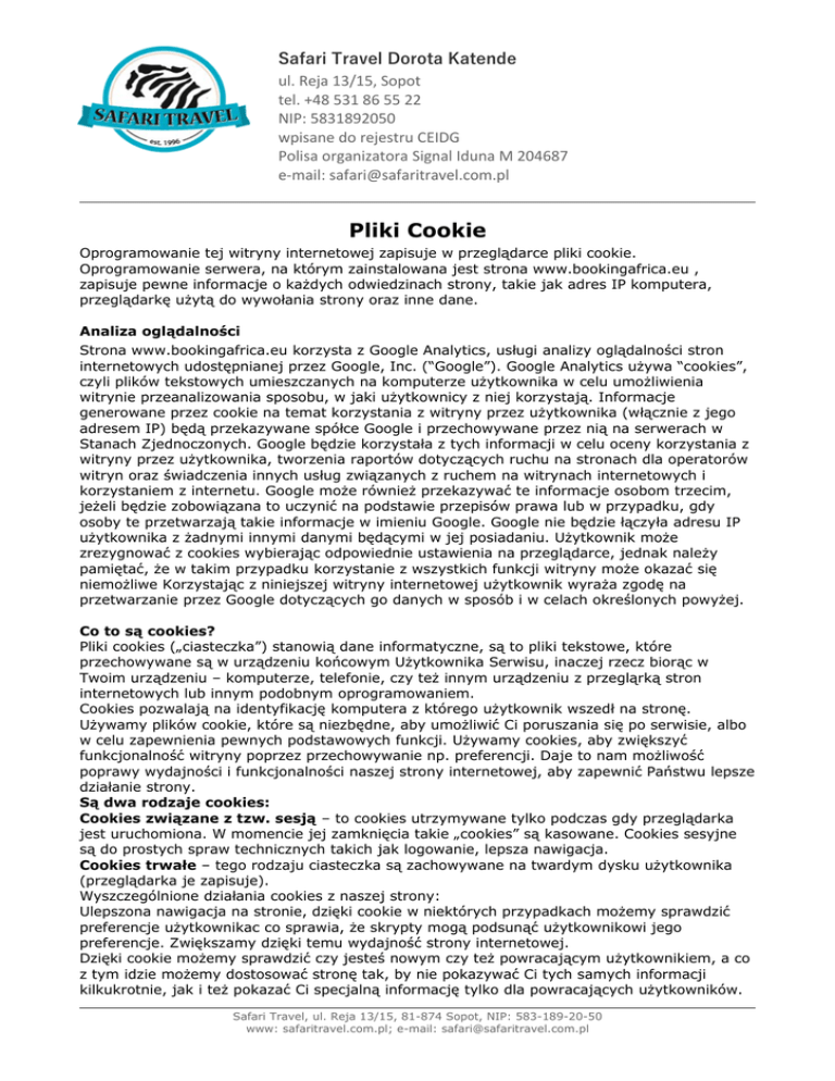 Safari Travel Dorota Katende ul. Reja 13/15, Sopot tel. +48 531 86 55 22 NIP: 5831892050 wpisane do rejestru CEIDG Polisa organizatora Signal Iduna M 204687 e-mail: [email protected] Pliki Cookie Oprogramowanie tej witryny internetowej zapisuje w przeglądarce pliki cookie. Oprogramowanie serwera, na którym zainstalowana jest strona www.bookingafrica.eu , zapisuje pewne informacje o każdych odwiedzinach strony, takie jak adres IP komputera, przeglądarkę użytą do wywołania strony oraz inne dane. Analiza oglądalności Strona www.bookingafrica.eu korzysta z Google Analytics, usługi analizy oglądalności stron internetowych udostępnianej przez Google, Inc. (“Google”). Google Analytics używa “cookies”, czyli plików tekstowych umieszczanych na komputerze użytkownika w celu umożliwienia witrynie przeanalizowania sposobu, w jaki użytkownicy z niej korzystają. Informacje generowane przez cookie na temat korzystania z witryny przez użytkownika (włącznie z jego adresem IP) będą przekazywane spółce Google i przechowywane przez nią na serwerach w Stanach Zjednoczonych. Google będzie korzystała z tych informacji w celu oceny korzystania z witryny przez użytkownika, tworzenia raportów dotyczących ruchu na stronach dla operatorów witryn oraz świadczenia innych usług związanych z ruchem na witrynach internetowych i korzystaniem z internetu. Google może również przekazywać te informacje osobom trzecim, jeżeli będzie zobowiązana to uczynić na podstawie przepisów prawa lub w przypadku, gdy osoby te przetwarzają takie informacje w imieniu Google. Google nie będzie łączyła adresu IP użytkownika z żadnymi innymi danymi będącymi w jej posiadaniu. Użytkownik może zrezygnować z cookies wybierając odpowiednie ustawienia na przeglądarce, jednak należy pamiętać, że w takim przypadku korzystanie z wszystkich funkcji witryny może okazać się niemożliwe Korzystając z niniejszej witryny internetowej użytkownik wyraża zgodę na przetwarzanie przez Google dotyczących go danych w sposób i w celach określonych powyżej. Co to są cookies? Pliki cookies („ciasteczka”) stanowią dane informatyczne, są to pliki tekstowe, które przechowywane są w urządzeniu końcowym Użytkownika Serwisu, inaczej rzecz biorąc w Twoim urządzeniu – komputerze, telefonie, czy też innym urządzeniu z przegląrką stron internetowych lub innym podobnym oprogramowaniem. Cookies pozwalają na identyfikację komputera z którego użytkownik wszedł na stronę. Używamy plików cookie, które są niezbędne, aby umożliwić Ci poruszania się po serwisie, albo w celu zapewnienia pewnych podstawowych funkcji. Używamy cookies, aby zwiększyć funkcjonalność witryny poprzez przechowywanie np. preferencji. Daje to nam możliwość poprawy wydajności i funkcjonalności naszej strony internetowej, aby zapewnić Państwu lepsze działanie strony. Są dwa rodzaje cookies: Cookies związane z tzw. sesją – to cookies utrzymywane tylko podczas gdy przeglądarka jest uruchomiona. W momencie jej zamknięcia takie „cookies” są kasowane. Cookies sesyjne są do prostych spraw technicznych takich jak logowanie, lepsza nawigacja. Cookies trwałe – tego rodzaju ciasteczka są zachowywane na twardym dysku użytkownika (przeglądarka je zapisuje). Wyszczególnione działania cookies z naszej strony: Ulepszona nawigacja na stronie, dzięki cookie w niektórych przypadkach możemy sprawdzić preferencje użytkownikac co sprawia, że skrypty mogą podsunąć użytkownikowi jego preferencje. Zwiększamy dzięki temu wydajność strony internetowej. Dzięki cookie możemy sprawdzić czy jesteś nowym czy też powracającym użytkownikiem, a co z tym idzie możemy dostosować stronę tak, by nie pokazywać Ci tych samych informacji kilkukrotnie, jak i też pokazać Ci specjalną informację tylko dla powracających użytkowników. Safari Travel, ul. Reja 13/15, 81-874 Sopot, NIP: 583-189-20-50 www: safaritravel.com.pl; e-mail: [email protected] Safari Travel Dorota Katende ul. Reja 13/15, Sopot tel. +48 531 86 55 22 NIP: 5831892050 wpisane do rejestru CEIDG Polisa organizatora Signal Iduna M 204687 e-mail: [email protected] Cookies pozwala nam stosować statystyki i analizy dzięki którym dowiadujemy się o preferencjach i pochodzeniu użytkowników. Co też pozwala nam na prawidłowy rozwój naszego portalu w dobrym kierunku, gdyż dzięki temu wiemy co jest w naszym serwisie najbardziej popularne. Jeśli na stronie jest koszyk zakupowy (jest możliwość robienia zakupów) korzysta on z plików cookies. Jeśli na stronie jest możliwość logowania (dostęp tylko dla subskrybentów, użytkowników zalogowanych) wykorzystuje ona cookies. Pliki cookies mogą służyć do zapewnienia bezpieczeństwa, wykorzystywane są do wykrywania nadużyć obrębie serwisu. Jeśli na stronie jest możliwość głosowania/oceniania może wykorzystywać ona cookies. Jeśli na stronie istnieje możliwość wykorzystywania śledzenia poleceń – program partnerski, wykorzystuje ona cookies. Dzięki tej funkcji mamy możliwość śledzenia poleceń – mamy możliwość sprawdzenia kto polecił naszą stronę innemu użytkownikowi dzięki czemu zwiększamy funkcjonalność naszego serwisu. Elementy Flash (Adobe Flash Player) – na podstronach mogą znajdować się elementy flash. Moga one także korzystać z technologii cookie zapisując różne ustawienia. Na stronie dostawcy oprogramowania – znajdziesz szczegóły dotyczące bezpieczeństwa: http://www.adobe.com/security/flashplayer/. Cookie ze stron powiązanych: Korzystamy z usług zewnętrznych na podstronach mogą wystąpić takie elementy które korzystają z cookies jak: Linki (hiperłącza) do innych stron internetowych, każda z tych stron posiada swoją politykę cookies, jeśli skorzystasz (klikniesz w link) powinieneś zapoznać się z polityką cookies strony na której się znalazłeś. Narzędzia Google: statystyki Google Ana