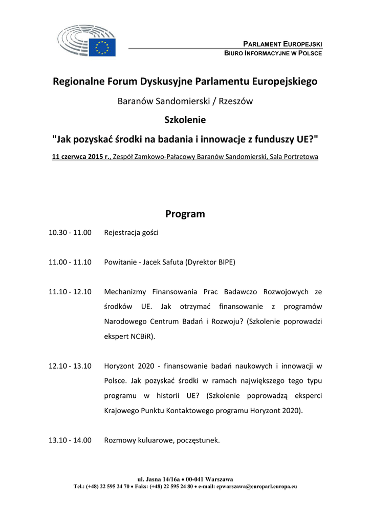 PARLAMENT EUROPEJSKI BIURO INFORMACYJNE W POLSCE Regionalne Forum Dyskusyjne Parlamentu Europejskiego Baranów Sandomierski / Rzeszów Szkolenie "Jak pozyskać środki na badania i innowacje z funduszy UE?" 11 czerwca 2015 r., Zespół Zamkowo-Pałacowy Baranów Sandomierski, Sala Portretowa Program 10.30 - 11.00 Rejestracja gości 11.00 - 11.10 Powitanie - Jacek Safuta (Dyrektor BIPE) 11.10 - 12.10 Mechanizmy Finansowania Prac Badawczo Rozwojowych ze środków UE. Jak otrzymać finansowanie z programów Narodowego Centrum Badań i Rozwoju? (Szkolenie poprowadzi ekspert NCBiR). 12.10 - 13.10 Horyzont 2020 - finansowanie badań naukowych i innowacji w Polsce. Jak pozyskać środki w ramach największego tego typu programu w historii UE? (Szkolenie poprowadzą eksperci Krajowego Punktu Kontaktowego programu Horyzont 2020). 13.10 - 14.00 Rozmowy kuluarowe, poczęstunek. ul. Jasna 14/16a 00-041 Warszawa Tel.: (+48) 22 595 24 70 Faks: (+48) 22 595 24 80 e-mail: [email protected]