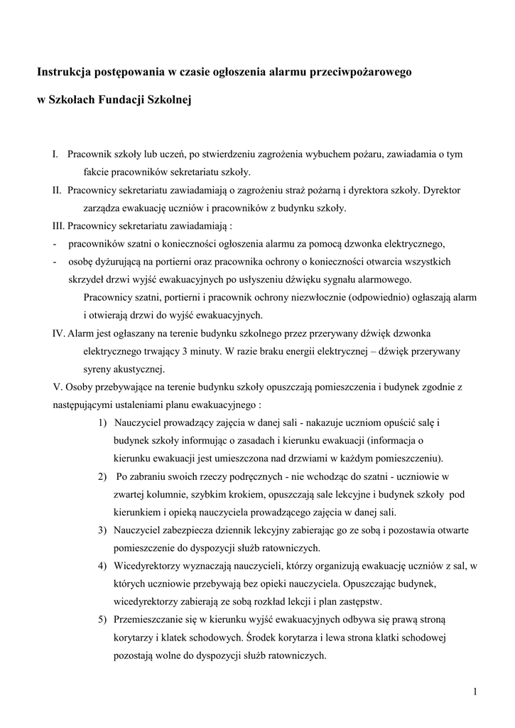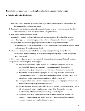 Instrukcja postępowania w czasie ogłoszenia alarmu przeciwpożarowego w Szkołach Fundacji Szkolnej I. Pracownik szkoły lub uczeń, po stwierdzeniu zagrożenia wybuchem pożaru, zawiadamia o tym fakcie pracowników sekretariatu szkoły. II. Pracownicy sekretariatu zawiadamiają o zagrożeniu straż pożarną i dyrektora szkoły. Dyrektor zarządza ewakuację uczniów i pracowników z budynku szkoły. III. Pracownicy sekretariatu zawiadamiają : - pracowników szatni o konieczności ogłoszenia alarmu za pomocą dzwonka elektrycznego, - osobę dyżurującą na portierni oraz pracownika ochrony o konieczności otwarcia wszystkich skrzydeł drzwi wyjść ewakuacyjnych po usłyszeniu dźwięku sygnału alarmowego. Pracownicy szatni, portierni i pracownik ochrony niezwłocznie (odpowiednio) ogłaszają alarm i otwierają drzwi do wyjść ewakuacyjnych. IV. Alarm jest ogłaszany na terenie budynku szkolnego przez przerywany dźwięk dzwonka elektrycznego trwający 3 minuty. W razie braku energii elektrycznej – dźwięk przerywany syreny akustycznej. V. Osoby przebywające na terenie budynku szkoły opuszczają pomieszczenia i budynek zgodnie z następującymi ustaleniami planu ewakuacyjnego : 1) Nauczyciel prowadzący zajęcia w danej sali - nakazuje uczniom opuścić salę i budynek szkoły informując o zasadach i kierunku ewakuacji (informacja o kierunku ewakuacji jest umieszczona nad drzwiami w każdym pomieszczeniu). 2) Po zabraniu swoich rzeczy podręcznych - nie wchodząc do szatni - uczniowie w zwartej kolumnie, szybkim krokiem, opuszczają sale lekcyjne i budynek szkoły pod kierunkiem i opieką nauczyciela prowadzącego zajęcia w danej sali. 3) Nauczyciel zabezpiecza dziennik lekcyjny zabierając go ze sobą i pozostawia otwarte pomieszczenie do dyspozycji służb ratowniczych. 4) Wicedyrektorzy wyznaczają nauczycieli, którzy organizują ewakuację uczniów z sal, w których uczniowie przebywają bez opieki nauczyciela. Opuszczając budynek, wicedyrektorzy zabierają ze sobą rozkład lekcji i plan zastępstw. 5) Przemieszczanie się w kierunku wyjść ewakuacyjnych odbywa się prawą stroną korytarzy i klatek schodowych. Środek korytarza i lewa strona klatki schodowej pozostają wolne do dyspozycji służb ratowniczych. 1 6) Nauczyciele mają obowiązek przeciwdziałać panice, nie dopuszczać do zakłócenia porządku w czasie ewakuacji. Zabrania się biec i zmieniać ustalony dla danej sali kierunek ewakuacji. 7) Pracownicy obsługi technicznej oraz pracownicy administracji pomagają nauczycielom w przeprowadzaniu ewakuacji i opuszczają budynek szkoły jako ostatni. Na zewnątrz budynku przebywają w pobliżu wyjść ewakuacyjnych i nie zezwalają na wejście do środka nikomu poza służbami ratowniczymi. 8) Po wyjściu z budynku szkolnego, uczniowie pod opieką nauczycieli gromadzą się w rejonie ewakuacji – na boiskach szkolnych. Nauczyciele dbają, aby nikt z uczniów nie zbliżał się do budynku szkoły. 9) Po zgromadzeniu się w rejonie ewakuacji, nauczyciel dokładnie sprawdza obecność uczniów danej klasy i stwierdza czy wszyscy uczniowie obecni na jego lekcji opuścili budynek i znajdują się w rejonie ewakuacji. 10) Po sprawdzeniu obecności uczniów, nauczyciel przekazuje Dyrektorowi Szkoły informację o zakończeniu ewakuacji danej klasy podając w kolejności : nazwę klasy – stwierdzenie ewakuowania się wszystkich uczniów (bez podawania ich liczby) – ilość uczniów obecnych na danej lekcji, których brakuje w rejonie ewakuacji. 11) Po opuszczeniu budynku szkoły przez wszystkich uczniów i pracowników, szkolna komisja obserwatorów sprawdza wszystkie pomieszczenia budynku szkoły i po stwierdzeniu pełnej ewakuacji informuje o tym Dyrektora Szkoły. 12) Po uzyskaniu od obserwatorów informacji o pełnej ewakuacji budynku szkoły, dyrektor poleca pracownikowi szatni podanie sygnału o zakończeniu ewakuacji. Sygnałem zakończenia ewakuacji jest ciągły dźwięk dzwonka szkolnego trwający pół minuty. 13) Po usłyszeniu sygnału zakończenia ewakuacji, nauczyciele nakazują uczniom powrót do budynku szkoły. Dyrektor Szkół Fundacji Szkolnej Zatwierdzono na Radzie Pedagogicznej dn. 30.08.2013r. Obowiązuje od 02.09.2013r. 2 Plan – konspekt praktycznego sprawdzenia warunków i organizacji ewakuacji 1. Termin przewidywanego sprawdzenia warunków ewakuacji .......................................... 2. Cel sprawdzianu ............................................................ ................................................ 3. Zakres przewidzianej do prowadzenia ewakuacji i miejsce zbiórki ................................ 4. Osoba odpowiedzialna za wykonanie sprawdzianu ........................................................ 4. Środki pozoracji ............................................................................................................... 5. Faktyczny przebieg sprawdzianu: a) data i godz. rozpoczęcia ........................................................................................ b) godz. zakończenia sprawdzianu .............................................................................. c) uwagi na temat przebiegu sprawdzianu ..................................................................... d) wnioski .................. ..................................... ..................... ............. ....... ...... ........ .................................................. (podpis osoby odpowiedzialnej) 3 Oświadczenie Niniejszym oświadczam, że zostałem (zostałam) zapoznany (zapoznana) z instrukcją Instrukcja postępowania w czasie ogłoszenia alarmu przeciw pożarowego w Szkołach Fundacji Szkolnej w Warszawie, zobowiązuję się do przestrzegania wszystkich zawartych w niej obowiązków w zakresie bezpieczeństwa pożarowego, postępowania na wypadek powstania pożaru i na zachowanie wymaganych warunków ewakuacyjnych – zgodnie z instrukcją postępowania. Imię Nazwisko Podpis Data 4