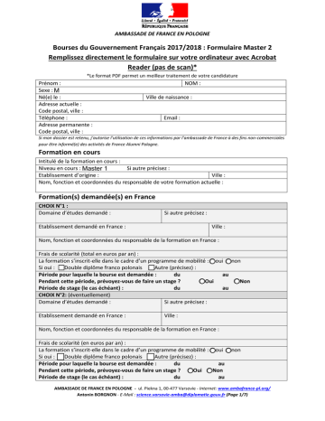 AMBASSADE DE FRANCE EN POLOGNE Bourses du Gouvernement Français 2017/2018 : Formulaire Master 2 Remplissez directement le formulaire sur votre ordinateur avec Acrobat Reader (pas de scan)* *Le format PDF permet un meilleur traitement de votre candidature Prénom : Sexe : M Né(e) le : Adresse actuelle : Code postal, ville : Téléphone : Adresse permanente : Code postal, ville : NOM : Ville de naissance : Email : Si mon dossier est retenu, j’autorise l’utilisation de ces informations par l’ambassade de France à des fins non-commerciales pour être informé(e) des activités de France Alumni Pologne. Formation en cours Intitulé de la formation en cours : Niveau en cours : Master 1 Si autre précisez : Etablissement d’origine : Ville : Nom, fonction et coordonnées du responsable de votre formation actuelle : Formation(s) demandée(s) en France CHOIX N°1 : Domaine d’études demandé : Si autre précisez : Etablissement demandé en France : Ville : Nom, fonction et coordonnées du responsable de la formation en France : Frais de scolarité (total en euros par an) : La formation s’inscrit-elle dans le cadre d’un programme de mobilité : oui non Si oui : Double diplôme franco polonais Autre (précisez) : Période pour laquelle la bourse est demandée : du au Pendant cette période, prévoyez-vous de faire un stage ? Oui Non Période de stage (le cas échéant) : du au CHOIX N°2: (éventuellement) Domaine d’études demandé : Si autre précisez : Etablissement demandé en France : Ville : Nom, fonction et coordonnées du responsable de la formation en France : Frais de scolarité (en euros par an) : La formation s’inscrit-elle dans le cadre d’un programme de mobilité : oui Si oui : Double diplôme franco polonais Autre (précisez) : Période pour laquelle la bourse est demandée : du au Pendant cette période, prévoyez-vous de faire un stage ? Oui Non Période de stage (le cas échéant) : du au non AMBASSADE DE FRANCE EN POLOGNE - ul. Piekna 1, 00-477 Varsovie - Internet: www.ambafrance-pl.org/ Antonin BORGNON - E-Mail : [email protected] (Page 1/7) AMBASSADE DE FRANCE EN POLOGNE Etudiez-vous en France actuellement ? Avez-vous déjà reçu une BGF ? Avez-vous déjà candidaté à une BGF ? Oui Oui Oui Non Non Non Si oui, date de votre arrivée : Si oui, dates de votre séjour : Si oui, année académique : Liste des diplômes obtenus (en commençant par les plus récents). Si vous préparez actuellement un diplôme, veuillez l’indiquer : Année Intitulé du diplôme Nom de l’université ou de l’école (Ville) Domaine d’étude ou de spécialisation Mention Pratique des langues (de 1 à 4 : 4=bilingue, 3= avancé(e), 2=conversation, 1= notions) : Nombre d’années Langue Niveau Diplôme obtenu d’études Séjours les plus significatifs à l’étranger : Pays Année et durée du séjour Objet du séjour Source de financement (personnel, bourse…) AMBASSADE DE FRANCE EN POLOGNE - ul. Piekna 1, 00-477 Varsovie - Internet: www.ambafrance-pl.org/ Antonin BORGNON - E-Mail : [email protected] (Page 2/7) AMBASSADE DE FRANCE EN POLOGNE Règlement concernant les bourses du gouvernement français (BGF) : Master 2ème année Conditions générales 1/ Si vous êtes lauréat d’une Bourse du Gouvernement Français, vous ne devrez pas quitter votre pays avant d’être en possession du CampusPass’, des originaux des diplômes et d’une pièce d’identité. 2/ Les facilités vous étant accordées, notamment en matière de prise en charge financière et administratives, ne s’étendront pas aux membres de votre famille qui pourraient vous rejoindre. 3/ Dès votre arrivée en France, vous devez suivre les instructions du CampusPass’ et contacter le centre Campus France de votre région. 4/ A votre demande expresse, Campus France vous proposera, dans la limite des disponibilités, un logement dès votre arrivée, en totalité ou partiellement à votre charge. La réservation d’une chambre universitaire n’est pas systématique, surtout en région parisienne, en raison du nombre élevé de demandes. 5/ Votre statut de Boursier du Gouvernement Français est lié à votre présence sur le territoire français. Il n’est pas possible de bénéficier du statut de BGF durant un stage effectué en dehors du territoire français. Dans le cas échéant, la bourse est automatiquement suspendue. Il n’est pas possible de cumuler la Bourse du Gouvernement Français avec un contrat d’apprentissage, une bourse du Ministère des Affaires étrangères et du Développement international, une bourse Erasmus + ou une bourse de l’Agence Universitaire de la Francophonie. En cas de cumul, la Bourse du Gouvernement Français sera automatiquement annulée. 6/ La couverture sociale vous couvre, exclusivement pendant la durée de la bourse, pour les risques de maladie, d’accident et de responsabilité civile, à l’exclusion notamment des affections contractées antérieurement à l’arrivée de l’étudiant en France. 7/ L’affectation définitive de la bourse est subordonnée à l’accord de l’établissement auquel vous avez candidaté. 8/ Vous êtes tenu de respecter la durée de formation, ainsi que les règles d’assiduité de l’établissement d’accueil. Vous ne pouvez interrompre votre formation en cours, sauf dérogation expresse notifiée par Campus France. AMBASSADE DE FRANCE EN POLOGNE - ul. Piekna 1, 00-477 Varsovie - Internet: www.ambafrance-pl.org/ Antonin BORGNON - E-Mail : [email protected] (Page 3/7) AMBASSADE DE FRANCE EN POLOGNE 9/ Les étudiants bénéficiaires d’une bourse s’engagent à s’inscrire à «France Alumni Pologne», réseau des anciens étudiants des établissements d'enseignement supérieur français. Les coordonnées des boursiers de chaque promotion sont communiquées au gestionnaire de France Alumni Pologne de l’Ambassade de France. L’inscription devra avoir lieu avant le séjour en France sur le site : www.pologne.franceal