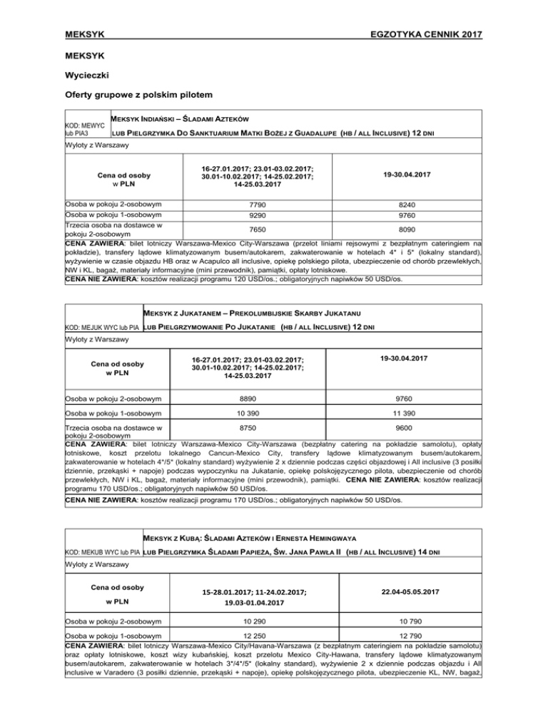 MEKSYK EGZOTYKA CENNIK 2017 MEKSYK Wycieczki Oferty grupowe z polskim pilotem MEKSYK INDIAŃSKI – ŚLADAMI AZTEKÓW KOD: MEWYC LUB PIELGRZYMKA DO SANKTUARIUM MATKI BOŻEJ Z GUADALUPE (HB / ALL INCLUSIVE) 12 DNI lub PIA3 Wyloty z Warszawy 16-27.01.2017; 23.01-03.02.2017; 30.01-10.02.2017; 14-25.02.2017; 14-25.03.2017 19-30.04.2017 Osoba w pokoju 2-osobowym 7790 8240 Osoba w pokoju 1-osobowym 9290 Cena od osoby w PLN 9760 Trzecia osoba na dostawce w 7650 8090 pokoju 2-osobowym CENA ZAWIERA: bilet lotniczy Warszawa-Mexico City-Warszawa (przelot liniami rejsowymi z bezpłatnym cateringiem na pokładzie), transfery lądowe klimatyzowanym busem/autokarem, zakwaterowanie w hotelach 4* i 5* (lokalny standard), wyżywienie w czasie objazdu HB oraz w Acapulco all inclusive, opiekę polskiego pilota, ubezpieczenie od chorób przewlekłych, NW i KL, bagaż, materiały informacyjne (mini przewodnik), pamiątki, opłaty lotniskowe. CENA NIE ZAWIERA: kosztów realizacji programu 120 USD/os.; obligatoryjnych napiwków 50 USD/os. MEKSYK Z JUKATANEM – PREKOLUMBIJSKIE SKARBY JUKATANU KOD: MEJUK WYC lub PIA LUB PIELGRZYMOWANIE PO JUKATANIE (HB / ALL INCLUSIVE) 12 DNI Wyloty z Warszawy 16-27.01.2017; 23.01-03.02.2017; 30.01-10.02.2017; 14-25.02.2017; 14-25.03.2017 19-30.04.2017 Osoba w pokoju 2-osobowym 8890 9760 Osoba w pokoju 1-osobowym 10 390 11 390 Cena od osoby w PLN Trzecia osoba na dostawce w 8750 9600 pokoju 2-osobowym CENA ZAWIERA: bilet lotniczy Warszawa-Mexico City-Warszawa (bezpłatny catering na pokładzie samolotu), opłaty lotniskowe, koszt przelotu lokalnego Cancun-Mexico City, transfery lądowe klimatyzowanym busem/autokarem, zakwaterowanie w hotelach 4*/5* (lokalny standard) wyżywienie 2 x dziennie podczas części objazdowej i All inclusive (3 posiłki dziennie, przekąski + napoje) podczas wypoczynku na Jukatanie, opiekę polskojęzycznego pilota, ubezpieczenie od chorób przewlekłych, NW i KL, bagaż, materiały informacyjne (mini przewodnik), pamiątki. CENA NIE ZAWIERA: kosztów realizacji programu 170 USD/os.; obligatoryjnych napiwków 50 USD/os. CENA NIE ZAWIERA: kosztów realizacji programu 170 USD/os.; obligatoryjnych napiwków 50 USD/os. MEKSYK Z KUBĄ: ŚLADAMI AZTEKÓW I ERNESTA HEMINGWAYA KOD: MEKUB WYC lub PIA LUB PIELGRZYMKA ŚLADAMI PAPIEŻA, ŚW. JANA PAWŁA II (HB / ALL INCLUSIVE) 14 DNI Wyloty z Warszawy Cena od osoby w PLN Osoba w pokoju 2-osobowym 15-28.01.2017; 11-24.02.2017; 19.03-01.04.2017 22.04-05.05.2017 10 290 10 790 Osoba w pokoju 1-osobowym 12 250 12 790 CENA ZAWIERA: bilet lotniczy Warszawa-Mexico City/Havana-Warszawa (z bezpłatnym cateringiem na pokładzie samolotu) oraz opłaty lotniskowe, koszt wizy kubańskiej, koszt przelotu Mexico City-Hawana, transfery lądowe klimatyzowanym busem/autokarem, zakwaterowanie w hotelach 3*/4*/5* (lokalny standard), wyżywienie 2 x dziennie podczas objazdu i All inclusive w Varadero (3 posiłki dziennie, przekąski + napoje), opiekę polskojęzycznego pilota, ubezpieczenie KL, NW, bagaż, MEKSYK EGZOTYKA CENNIK 2017 od chorób przewlekłych, materiały informacyjne (mini przewodnik). CENA NIE ZAWIERA: kosztów realizacji programu 400 USD/os obligatoryjnych napiwków 50 USD/os., opłaty wyjazdowej z Kuby 25 USD/os. CENA NIE ZAWIERA: kosztów realizacji programu 460 USD/os.; obligatoryjnych napiwków 50 USD/os., opłaty wylotowej z Kuby 25 USD Oferty indywidualne realizowane od 2 osób KOD: MEGWA MEKSYK Z GWATEMALĄ (ZGODNIA Z PROGRAMEM) 12 DNI Wyloty z Warszawy Cena od osoby 23.01-03.02.2017; 30.01-10.02.2017; 14-25.02.2017; w PLN 14-25.03.2017 Osoba w pokoju 2-osobowym 1920 USD Osoba w pokoju 1-osobowym Na zapytanie CENA ZAWIERA:, koszt przelotu lokalnego Cancun-Mexico City, transfery lądowe klimatyzowanym busem/autokarem, zakwaterowanie w hotelach 4* (lokalny standard) wyżywienie 2 x dziennie podczas części objazdowej i All inclusive (3 posiłki dziennie, przekąski + napoje) podczas wypoczynku na Jukatanie, opiekę polskiego przewodnika, ubezpieczenie od NW i KL, chorób przewlekłych, bagaż, materiały informacyjne (mini przewodnik), pamiątki. CENA NIE ZAWIERA: biletu lotniczego Warszawa-Gwatemala City/Cancun-Warszawa, napoi do posiłków, napiwków MEKSYK Z PUERTO VALLARTA – TEQUILA, POR FAVOR! KOD: METPF (ZGODNIA Z PROGRAMEM) 10 DNI Wyloty z Warszawy Cena od osoby w PLN 23.01-01.02.2017; 30.01-08.02.2017; 14-23.02.2017; 14-23.03.2017 Osoba w pokoju 2-osobowym 2395 USD Osoba w pokoju 1-osobowym Na zapytanie CENA ZAWIERA: transfery lądowe klimatyzowanym samochodem, zakwaterowanie w hotelach 3* i 4* (lokalny standard) wyżywienie śniadania, opiekę anglojęzycznego przewodnika, ubezpieczenie od chorób przewlekłych, NW i KL, choroby przewlekłe, bagaż, materiały informacyjne CENA NIE ZAWIERA: bilet lotniczy Warszawa-Puerto Vallarta–Warszawa, dodatkowych posiłków, napiwków, wydatków własnych UWAGI: 1. Cena przelotu została podana w najniższej taryfie obowiązującej na przelot w okresie ważności powyższej taryfy. W przypadku niedostępności tej taryfy istnieje możliwość rezerwacji biletu w innej wyższej – za odpowiednią dopłatą. 2. Przy wylotach w okresie „Wysokiego Sezonu” (najczęściej jest to okres Świąt Bożego Narodzenia oraz Świąt Wielkanocnych) obowiązuje dopłata do biletu lotniczego (zgodnie z taryfą linii lotniczej, na której został zarezerwowany przelot). 3. Płatności można dokonać zarówno w walucie PLN jak i USD (na oddzielne konto dolarowe naszego biura). 4. Istnieje możliwość wykupienia dodatkowego ubezpieczenia od kosztów rezygnacji 3,2%. 5. Cena została skalkulowana przy minimum 30 osobach. 6. Cena została skalkulowana wg kursu sprzedaży USD Banku PEKAO SA = 3,8 zł. 7. Za pokój 3-osobowy w Meksyku uważa się pokój z dwoma łóżkami małżeńskimi.