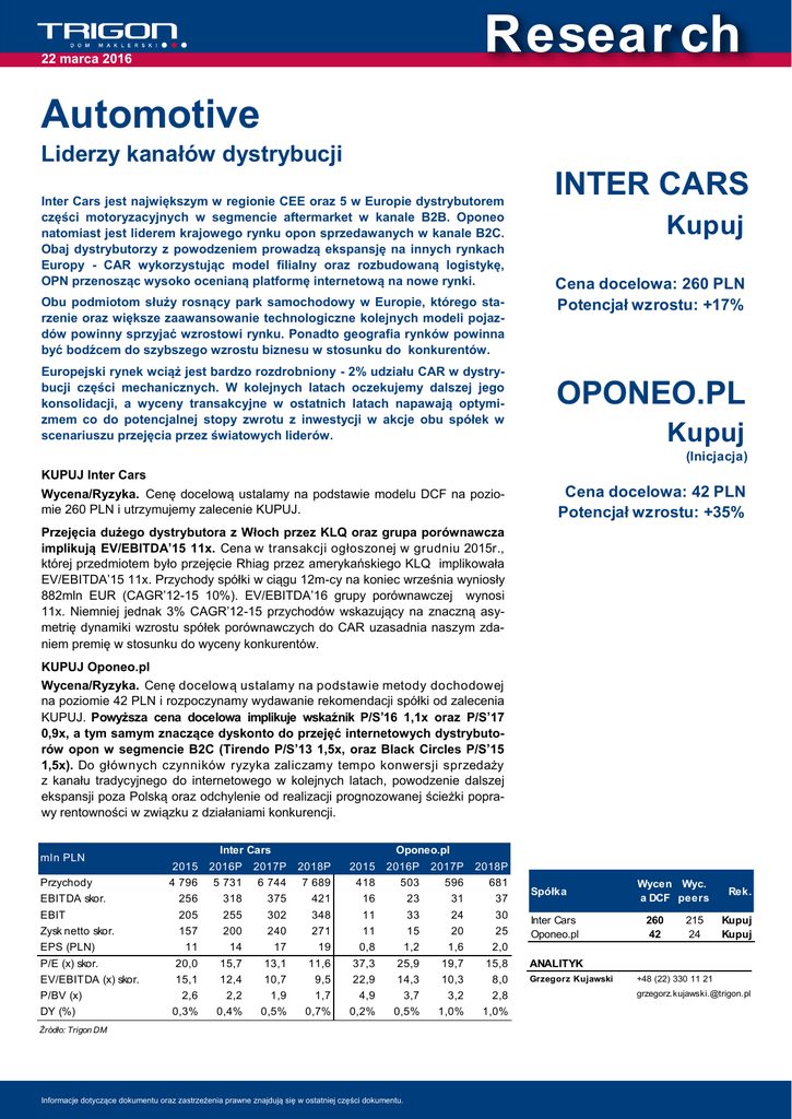 Resear ch 22 marca 2016 Automotive Liderzy kanałów dystrybucji Inter Cars jest największym w regionie CEE oraz 5 w Europie dystrybutorem części motoryzacyjnych w segmencie aftermarket w kanale B2B. Oponeo natomiast jest liderem krajowego rynku opon sprzedawanych w kanale B2C. Obaj dystrybutorzy z powodzeniem prowadzą ekspansję na innych rynkach Europy - CAR wykorzystując model filialny oraz rozbudowaną logistykę, OPN przenosząc wysoko ocenianą platformę internetową na nowe rynki. Obu podmiotom służy rosnący park samochodowy w Europie, którego starzenie oraz większe zaawansowanie technologiczne kolejnych modeli pojazdów powinny sprzyjać wzrostowi rynku. Ponadto geografia rynków powinna być bodźcem do szybszego wzrostu biznesu w stosunku do konkurentów. Europejski rynek wciąż jest bardzo rozdrobniony - 2% udziału CAR w dystrybucji części mechanicznych. W kolejnych latach oczekujemy dalszej jego konsolidacji, a wyceny transakcyjne w ostatnich latach napawają optymizmem co do potencjalnej stopy zwrotu z inwestycji w akcje obu spółek w scenariuszu przejęcia przez światowych liderów. INTER CARS Kupuj Cena docelowa: 260 PLN Potencjał wzrostu: +17% OPONEO.PL Kupuj (Inicjacja) KUPUJ Inter Cars Wycena/Ryzyka. Cenę docelową ustalamy na podstawie modelu DCF na poziomie 260 PLN i utrzymujemy zalecenie KUPUJ. Cena docelowa: 42 PLN Potencjał wzrostu: +35% Przejęcia dużego dystrybutora z Włoch przez KLQ oraz grupa porównawcza implikują EV/EBITDA’15 11x. Cena w transakcji ogłoszonej w grudniu 2015r., której przedmiotem było przejęcie Rhiag przez amerykańskiego KLQ implikowała EV/EBITDA’15 11x. Przychody spółki w ciągu 12m-cy na koniec września wyniosły 882mln EUR (CAGR’12-15 10%). EV/EBITDA’16 grupy porównawczej wynosi 11x. Niemniej jednak 3% CAGR’12-15 przychodów wskazujący na znaczną asymetrię dynamiki wzrostu spółek porównawczych do CAR uzasadnia naszym zdaniem premię w stosunku do wyceny konkurentów. KUPUJ Oponeo.pl Wycena/Ryzyka. Cenę docelową ustalamy na podstawie metody dochodowej na poziomie 42 PLN i rozpoczynamy wydawanie rekomendacji spółki od zalecenia KUPUJ. Powyższa cena docelowa implikuje wskaźnik P/S’16 1,1x oraz P/S’17 0,9x, a tym samym znaczące dyskonto do przejęć internetowych dystrybutorów opon w segmencie B2C (Tirendo P/S’13 1,5x, oraz Black Circles P/S’15 1,5x). Do głównych czynników ryzyka zaliczamy tempo konwersji sprzedaży z kanału tradycyjnego do internetowego w kolejnych latach, powodzenie dalszej ekspansji poza Polską oraz odchylenie od realizacji prognozowanej ścieżki poprawy rentowności w związku z działaniami konkurencji. mln PLN Przychody EBITDA skor. EBIT Zysk netto skor. EPS (PLN) P/E (x) skor. EV/EBITDA (x) skor. P/BV (x) DY (%) 2015 4 796 256 205 157 11 20,0 15,1 2,6 0,3% Inter Cars 2016P 2017P 5 731 318 255 200 14 15,7 12,4 2,2 0,4% 6 744 375 302 240 17 13,1 10,7 1,9 0,5% 2018P 2015 7 689 421 348 271 19 11,6 9,5 1,7 0,7% 418 16 11 11 0,8 37,3 22,9 4,9 0,2% Oponeo.pl 2016P 2017P 503 23 33 15 1,2 25,9 14,3 3,7 0,5% Źródło: Trigon DM Informacje dotyczące dokumentu oraz zastrzeżenia prawne znajdują się w ostatniej części dokumentu. 596 31 24 20 1,6 19,7 10,3 3,2 1,0% 2018P 681 37 30 25 2,0 15,8 8,0 2,8 1,0% Spółka Inter Cars Oponeo.pl Wycen Wyc. a DCF peers 260 42 215 24 Rek. Kupuj Kupuj ANALITYK Grzegorz Kujawski +48 (22) 330 11 21 [email protected] Spis treści Inter Cars…………..….…………………...…………......3 Podsumowanie inwestycyjne….……………...………………....…...5 Co „nie zagrało” w 2015r.?..……...……………………...…..……....9 Wyniki i prognozy…………………………….……..…………….…..11 Wycena dochodowa…………………………………………………..15 Wycena porównawcza……...………………………..…..…………..17 Wartość rynku, pozycja CAR………………………………………...18 Oponeo.pl…………….…….…………...…...…………..21 Podsumowanie inwestycyjne….……………………………………..23 Otoczenie rynkowe i konkurencyjne..……...………………...……..26 Profil/Strategia……………….…..…………….………………….…..30 Wyniki finansowe i prognozy………………………..………….……31 Wycena dochodowa……………………….……………………...….35 Wycena porównawcza…………………………………….………….37 2 2 Inter Cars Kupuj INTER CARS Cena docelowa: 260 PLN Potencjał wzrostu: +17% Najpierw masa później rzeźba Przejęcia dużego dystrybutora z Włoch przez KLQ oraz grupa porównawcza implikują EV/EBITDA’15 11x. Cena w transakcji ogłoszonej w grudniu 2015r., której przedmiotem było przejęcie Rhiag przez amerykańskiego KLQ implikowała EV/EBITDA’15 11x. Przychody spółki w ciągu 12m-cy na koniec września wyniosły 882mln EUR (CAGR’12-15 10%). EV/EBITDA’16 grupy porównawczej wynosi 11x. Niemniej jednak 3% CAGR’12-15 przychodów wskazujący na znaczną asymetrię dynamiki wzrostu spółek porównawczych do CAR uzasadnia naszym zdaniem premię w stosunku do wyceny konkurencji. Wycena/Ryzyka. Cenę docelową ustalamy na podstawie modelu DCF na poziomie 260 PLN i utrzymujemy zalecenie KUPUJ. Do głównych czynników ryzyka zaliczamy odchylenie od zakładanej ekspansji przychodów oraz realizacji prognozowanej ścieżki poprawy rentowności w związku z działaniami konkurencji. m ln EUR Przychody EBITDA skor. EBIT Zysk netto skor. EPS (PLN) P/E (x) skor. EV/EBITDA (x) skor. P/BV (x) DY (%) 2013 3 513 232 193 148 10,4 21,3 15,4 3,5 0,0% 2014 3 940 268 227 177 12,5 17,7 13,8 2,9 0,3% 2015 4 796 256 205 157 11,1 20,0 15,1 2,6 0,3% 2016P 5 731 318 255 200 14,1 15,7 12,4 2,2 0,4% 2017P 6 744 375 302 240 16,9 13,1 10,7 1,9 0,5% 2018P 7 689 421 348 271 19,1 11,6 9,5 1,7 0,7% CAR Sektor Dy stry bucja Kurs (PLN) 222 5