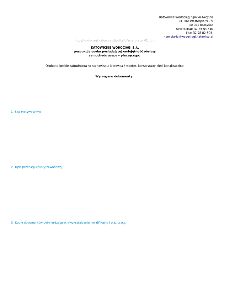 Katowickie Wodociągi Spółka Akcyjna ul. Obr.Westerplatte 89 40-335 Katowice Sekretariat: 32 25 54 810 Fax: 32 78 82 503 [email protected] http://wodociagi.katowice.pl/polka/oferta_pracy_02.html KATOWICKIE WODOCIĄGI S.A. poszukują osoby posiadającej umiejętność obsługi samochodu ssąco – płuczącego. Osoba ta będzie zatrudniona na stanowisku: kierowca / monter, konserwator sieci kanalizacyjnej Wymagane dokumenty: 1. List motywacyjny; 2. Opis przebiegu pracy zawodowej; 3. Kopie dokumentów potwierdzających wykształcenie, kwalifikacje i staż pracy; 4. Oświadczenie o wyrażeniu zgody na przetwarzanie danych osobowych dla potrzeb naboru zgodnie z ustawą o ochronie danych osobowych; Wymagania związane za stanowiskiem pracy: ● ● ● ● ● ● wykształcenie minimum zawodowe (preferowana specjalizacja sanitarna); minimum 3 lata doświadczenia przy prowadzeniu oraz obsłudze samochodu ssąco-płuczącego; (wymagane) doświadczenie przy renowacji sieci kanalizacyjnej metodą bezwykopową; prawo jazdy kategorii C; (wymagane) rzetelność i odpowiedzialność; zaangażowanie w wykonywaną pracę. Do zadań kandydata będzie należało: ● ● ● ● ● ● ● kierowanie pojazdem oraz obsługa samochodu ssąco-płuczącego; zapewnienie prawidłowego funkcjonowania sieci kanalizacyjnej poprzez właściwą konserwację i eksploatację; dokonywanie przeglądów, napraw oraz czyszczenia sieci kanalizacyjnej; utrzymywanie prawidłowego stanu zabezpieczenia sieci kanalizacyjnej przed zagrożeniami zewnętrznymi, w tym w postaci środków trujących; wykonywanie czynności eksploatacyjnych oraz konserwacyjnych na sieci kanalizacyjnej wraz z obiektami (tłocznia ścieków, przepompownie ścieków); uczestniczenie w akcjach awaryjnych (kryzysowych) ze służbami miejskimi; prowadzenie pojazdów służbowych. Informacja dotycząca zatrudnienia: Osoba wyłoniona podczas naboru podejmie zatrudnienie w wymiarze pełnego etatu w ramach umowy o pracę. Termin składania dokumentów: Do: 04.01.2016 r. Miejsce składania dokumentów: Bezpośrednio w siedzibie Katowickich Wodociągów S.A. w Katowicach, Obrońców Westerplatte nr 89, Dział Spraw Pracowniczych, pokój nr 8 w godzinach 7:30-14:30; Drogą pocztową na adres: Katowickie Wodociągi S.A., Obrońców Westerplatte 89, 40-335 Katowice. W przypadku przesłania dokumentów drogą pocztową, za datę ich złożenia uważa się datę stempla pocztowego. Wymagane dokumenty należy składać lub przesyłać w zamkniętych kopertach z dopiskiem: Nabór na stanowisko - kierowca/monter, konserwator sieci kanalizacyjnej w Katowickich Wodociągach S.A.