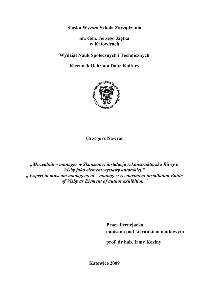 Śląska Wyższa Szkoła Zarządzania im. Gen. Jerzego Ziętka w Katowicach Wydział Nauk Społecznych i Technicznych Kierunek Ochrona Dóbr Kultury Grzegorz Nawrat „Muzealnik – manager w Skansenie: instalacja rekonstruktorska Bitwy o Visby jako element wystawy autorskiej.” „ Expert in museum management – manager: reenactment installation Battle of Visby as Element of author exhibition.” Praca licencjacka napisana pod kierunkiem naukowym prof. dr hab. Irmy Koziny Katowice 2009 ............................................................ imię i nazwisko Katowice, dnia................................ ............................................................. Wydział ............................................................. Kierunek OŚWIADCZENIE Świadomy odpowiedzialności prawnej oświadczam, że przedkładana praca została opracowana przeze mnie samodzielnie, nie zawiera żadnych danych oraz informacji, które zostały pozyskane w sposób niedozwolony, a także iż nie stanowiła ona wcześniej – w całości lub części – podstawy żadnej procedury urzędowej związanej z nadawaniem dyplomów wyższych uczelni bądź też tytułów zawodowych. Oświadczam, że przedkładana praca nie narusza praw autorskich w rozumieniu Ustawy z dnia 4 lutego 1994 roku o prawie autorskim i prawach pokrewnych (Dz. U. Nr 24 poz. 83), a także nie narusza dóbr osobistych chronionych prawem cywilnym. ....................................... 2 SPIS TREŚCI 1.Spis treści…………..……………………………………………..…………………...str. 3 2.Wstęp…………………...………………………. ……….……………..……………..str. 4 3. Muzeum jako przedsiębiorstwo……………………………………………………..str. 5 4. Górnośląski Park Etnograficzny miejscem instalacji rekonstruktorskiej…….....str. 9 5. Projekt wystawy – Bitwa o Visby……….…….……………………………………str. 13 6. Reenactment jako zjawisko kulturowe postmodernizmu………………………...str. 18 6. Aranżacja wystawy…………………………………………………….……………str. 23 8. Wpływ Bitwy o Visby na ruch Rekonstruktorski…………………………………str. 29 9. Załączniki………………………………………………………………………….....str. 34 9. Bibliografie……………………………………………………………………...…...str. 42 10. Spis zdjęć……………………………………………………………………………str. 44 3 Wstęp. Punktem wyjścia do niniejszej analizy jest organizacja wystawy o podłożu rekonstruktorskim. W związku z charakterem wystawy konieczne stało się rozpoznanie kilku zjawisk. Pierwsze wynikało z faktu, iż wystawa niżej omówiona wymaga wprowadzenia nowej formy ekspozycyjnej do muzeum skansenowskiego. Było to związane z koncepcją prowadzenia galerii pojmowanej jako zadanie dla managera kultury. Postawiło to przed autorem pracy potrzebę omówienia kwestii funkcjonowania muzealnika jako managera. Kolejnym istotnym dla pracy zagadnieniem jest charakter miejsca owej ekspozycji w formie, jakim jest muzeum na wolnym powietrzu – zwanym potocznie skansenem. Otwarta przestrzeń muzeum posiada ogromne możliwości dla instalacji rekonstruktorskiej oraz ekspozycji związanej z historią. Jako że praca obejmuję koncepcję wprowadzenia nowatorskiej metody ekspozycji, nie można określić jej stanu badań, gdyż wystawa jeszcze się nie odbyła i nikt nie przeprowadził wobec niej żadnych badań ani krytyki. Wobec tego autor musiał skupić się na opisaniu samej koncepcji ekspozycji, jak też na scenariuszu instalacji rekonstruktorskiej, która będzie jej czynnym aspektem w celu przyciągnięcia ludzi. Należało także przedstawić problematykę konfliktu, który miał miejsce w interesujących autora czasach. Sama instalacja rekonstruktorska polega na zjawisku postmodernistycznym zwanym reenactment, które należy omówić z racji braku znajomości tego fenomenu wśród potencjalnych czytelników. Przy kreowaniu wystawy o podłożu rekonstruktorskim należy omówić czynniki wpływające na nią. Otóż głównymi wytycznymi, według których powinno się rozpoczynać każde działanie rekonstrukcyjne, są to określenie właściwego podmiotu czasowego, geograficznego, społecznego i funkcjonalnego uzbrojenia, opancerzenia oraz ubioru. Dlatego też autor musiał odnieść się do potrzebnych mu danych i przedstawić je czytelnikowi. Za punkt wyjścia oraz swego rodzaju podsumowanie obrano omówienie wpływu wykopalisk archeologicznych pod Visby na rozwój ruchu reenactment w Polsce. Krótko opisano jego historię oraz zjawiska z nim związane. 4 Muzeum jako przedsiębiorstwo. Czy można nazwać muzeum przedsiębiorstwem? W rozumieniu świata ekonomicznego oraz rządzących nim praw można je tak nazwać. Muzea są bowiem częścią rynku artystycznego – biorą czynny udział w cyrkulacji kapitału kulturowego, który tworzą zbiory artystyczne oraz towarów, jakimi są dzieła sztuki. Gerald Matt w swojej pracy1 wyszczególnia sposób działania muzeów na płaszczyznach kultury i ekonomii. Na płaszczyźnie ekonomicznej muzeum musi działać na rynku, gdzie pozyskuje niezbędne dobra w procesie wykonywania swoich założeń (pozyskiwanie siły roboczej, dzieł sztuki, pamiątek itd.) oraz w celu zapewnienia sobie dużego zainteresowania zwiedzających (reklama, dobre wrażenie, meetingi itd.). Także przy działalności czysto kulturalnej i artystycznej, muzea zmuszone są kierować się zasadami rynku ekonomicznego. W obecnych czasach wysoce wzrosło współzawodnictwo instytucji życia publicznego, głównie zajmujących się organizacją zagospodarowania czasu wolnego oraz samych sfer kultury. Ponadto należy zwrócić uwagę na wzrastające koszty utrzymania oraz zakupu nowych dział s
