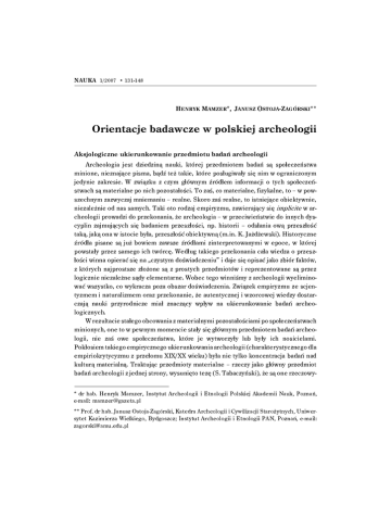 NAUKA 1/2007 • 131-148 HENRYK MAMZER*, JANUSZ OSTOJA-ZAGÓRSKI** Orientacje badawcze w polskiej archeologii Aksjologiczne ukierunkowanie przedmiotu badań archeologii Archeologia jest dziedziną nauki, której przedmiotem badań są społeczeństwa minione, nieznające pisma, bądź też takie, które posługiwały się nim w ograniczonym jedynie zakresie. W związku z czym głównym źródłem informacji o tych społeczeństwach są materialne po nich pozostałości. To zaś, co materialne, fizykalne, to – w powszechnym zazwyczaj mniemaniu – realne. Skoro zaś realne, to istniejące obiektywnie, niezależnie od nas samych. Taki oto rodzaj empiryzmu, zawierający się implicite w archeologii prowadzi do przekonania, że archeologia – w przeciwieństwie do innych dyscyplin zajmujących się badaniem przeszłości, np. historii – odsłania ową przeszłość taką, jaką ona w istocie była, przeszłość obiektywną (m.in. K. Jażdżewski). Historyczne źródła pisane są już bowiem zawsze źródłami zinterpretowanymi w epoce, w której powstały przez samego ich twórcę. Według takiego przekonania cała wiedza o przeszłości winna opierać się na „czystym doświadczeniu” i daje się opisać jako zbiór faktów, z których najprostsze złożone są z prostych przedmiotów i reprezentowane są przez logicznie niezależne sądy elementarne. Wobec tego winniśmy z archeologii wyeliminować wszystko, co wykracza poza obszar doświadczenia. Związek empiryzmu ze scjentyzmem i naturalizmem oraz przekonanie, że autentycznej i wzorcowej wiedzy dostarczają nauki przyrodnicze miał znaczący wpływ na ukierunkowanie badań archeologicznych. W rezultacie stałego obcowania z materialnymi pozostałościami po społeczeństwach minionych, one to w pewnym momencie stały się głównym przedmiotem badań archeologii, nie zaś owe społeczeństwa, które je wytworzyły lub były ich nosicielami. Pokłosiem takiego empirycznego ukierunkowania archeologii (charakterystycznego dla empiriokrytycyzmu z przełomu XIX/XX wieku) była nie tylko koncentracja badań nad kulturą materialną. Traktując przedmioty materialne – rzeczy jako główny przedmiot badań archeologii z jednej strony, wysunięto tezę (S. Tabaczyński), że są one rzeczowy* dr hab. Henryk Mamzer, Instytut Archeologii i Etnologii Polskiej Akademii Nauk, Poznań, e-mail: [email protected] ** Prof. dr hab. Janusz Ostoja-Zagórski, Katedra Archeologii i Cywilizacji Starożytnych, Uniwersytet Kazimierza Wielkiego, Bydgoszcz; Instytut Archeologii i Etnologii PAN, Poznań, e-mail: [email protected] 132 Henryk Mamzer, Janusz Ostoja-Zagórski mi (pozakulturowymi) korelatami kultury, z drugiej zaś strony sprzyjało to analogicznemu traktowaniu przedmiotów, jak to ma miejsce w przypadku zmatematyzowanego przyrodoznawstwa. Stąd już tylko krok do przekonania, że archeologia jako nauka o przedmiotach jest nauką przyrodoznawczą, zwłaszcza że korzysta również z wyników badań tych przedmiotów, prowadzonych przez takie dyscypliny, jak: fizyka, chemia czy biologia. Tego rodzaju postawa jest równoznaczna z całkowitą niemalże marginalizacją głównego przedmiotu badań archeologii, jakim są społeczeństwa minione i ich kultury1. W głównej mierze jej rola sprowadza się do dostarczycielki faktów potwierdzających tezy formułowanych na gruncie innych dyscyplin, zwłaszcza historii. Taką rolę dostarczycielki potwierdzeń empirycznych pełni archeologia biblijna. Takim też przesłaniem kierował się Heinrich Schliemann w swoich badaniach w Troi czy w Mykenach, mających na celu potwierdzenie wydarzeń opisywanych przez Homera. Tymczasem tytuł niniejszej wypowiedzi komunikuje, że w archeologii mamy do czynienia z wielością i różnorodnością postaw badawczych zarówno wobec archeologii samą, jak i jej przedmiotu badania, różniących się założeniami i w związku z tym konsekwencjami z owych założeń wynikającymi. Rzec by można, że mamy w związku z tym do czynienia z wielością i różnorodnością przeszłości. Skoro tak, to trudno w takiej sytuacji mówić w kategoriach realności o przeszłości takiej, jaką ona była sama w sobie, i obiektywności tego, co o niej mówimy. Zacznijmy wobec tego od postrzegania odkrywanych przez archeologa przedmiotów materialnych. Otóż mówienie o przedmiotach materialnych, jako przedmiotach realnych do tego stopnia „weszło nam w krew” – jak pisze Hilary Putnam – że trudno nam sobie wyobrazić, by można mówić o nich inaczej. Również trudno pogodzić nam się z tym, że kultury archeologiczne, mimo deklaracji o instrumentalnym ich charakterze, nie są realnym odbiciem rzeczywistości. Pozostałości po społeczeństwach minionych – przedmioty materialne, a więc dane obserwacyjne są bowiem dla archeologa efektem określonych działań w przeszłości. Są przezeń traktowane jako przedmioty wchodzące w związki metonimiczne: przyczynowo-skutkowe oraz Mimo że już w 1974 roku Waldemar Chmielewski pisał: „Archeologia przestaje być nauką o przedmiotach, ona jest metodą poznania społeczności ludzkich” – cytuję za J. Lech (2006, s. 577), wartą odnotowania w tym miejscu jest uwaga Łukasza Olędzkiego (2003, s. 138) w jego artykule poświęconym archeologii rytuału: „Znamienny był dla mnie głos studenta, jednego z uczestników konferencji w Obrzycku (Społeczne funkcjonowanie archeologii), kiedy to na spór o traktowanie człowieka jako przedmiotu i podmiotu badań archeologii zareagował on słowami: o czym my tu mówimy, przecież archeologia to nauka o zabytkach (sic!). Obawiam się – pisze Olędzki – że taki stosunek do archeologii w polskim kontekście (i nie tylko) nie jest odosobniony”. Powrót do tego rodzaju spojrzenia na archeologię jako dyscyplinę zajmującą się badaniem rzeczy – przedmiotów fizykalnych widoczny jest m.in. w ostatnich publikacjach norweskiego archeologa Bjørnara Olsena (2003) i za