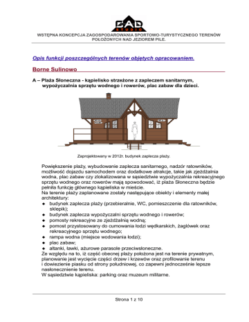 WSTĘPNA KONCEPCJA ZAGOSPODAROWANIA SPORTOWO-TURYSTYCZNEGO TERENÓW POŁOŻONYCH NAD JEZIOREM PILE. Opis funkcji poszczególnych terenów objętych opracowaniem. Borne Sulinowo A – Plaża Słoneczna - kąpielisko strzeżone z zapleczem sanitarnym, wypożyczalnia sprzętu wodnego i rowerów, plac zabaw dla dzieci. Zaprojektowany w 2012r. budynek zaplecza plaży. Powiększenie plaży, wybudowanie zaplecza sanitarnego, nadzór ratowników, możliwość dojazdu samochodem oraz dodatkowe atrakcje, takie jak zjeżdżalnia wodna, plac zabaw czy zlokalizowana w sąsiedztwie wypożyczalnia rekreacyjnego sprzętu wodnego oraz rowerów mają spowodować, iż plaża Słoneczna będzie pełniła funkcję głównego kąpieliska w mieście. Na terenie plaży zaplanowane zostały następujące obiekty i elementy małej architektury: budynek zaplecza plaży (przebieralnie, WC, pomieszczenie dla ratowników, sklepik); budynek zaplecza wypożyczalni sprzętu wodnego i rowerów; pomosty rekreacyjne ze zjeżdżalnią wodną; pomost przystosowany do cumowania łodzi wędkarskich, żaglówek oraz rekreacyjnego sprzętu wodnego; rampa wodna (miejsce wodowania łodzi); plac zabaw; altanki, ławki, ażurowe parasole przeciwsłoneczne. Ze względu na to, iż część obecnej plaży położona jest na terenie prywatnym, planowanie jest wycięcie części drzew i krzewów oraz profilowanie terenu i dowiezienie piasku od strony południowej, co zapewni jednocześnie lepsze nasłonecznienie terenu. W sąsiedztwie kąpieliska: parking oraz muzeum militarne. Strona 1 z 10 WSTĘPNA KONCEPCJA ZAGOSPODAROWANIA SPORTOWO-TURYSTYCZNEGO TERENÓW POŁOŻONYCH NAD JEZIOREM PILE. B – Muzeum militarne. Wstępna koncepcja muzeum militarnego (widok części nadziemnej oraz przekrój przez kondygnację podziemną i zejście do tuneli). Koncepcja zagospodarowania nabrzeża w Bornem Sulinowie wykonana została z myślą o rozwoju tzw. turystyki weekendowej. Główną ideą było stworzenie obiektów oraz miejsc, które dostarczą turystom atrakcji i sprawią, że Borne Sulinowo stanie się ciekawym miejscem, do którego warto udać się z rodziną czy znajomymi na jedno lub kilkudniową wycieczkę. Militarna historia miasta oraz sąsiedztwo zbudowanej przez Niemców w latach 30-tych linii umocnień zwanych Wałem Pomorskim sprawia, iż spora część turystów odwiedza tereny gminy pod tym właśnie kątem. Jednak większość umocnień Wału Pomorskiego została zniszczona, a nieliczne zachowane obiekty są trudno dostępne a ich zwiedzanie często niebezpieczne. Nietypowe muzeum militarne (budynek będący imitacją jednego z najmocniejszych i najbardziej rozbudowanych obiektów bojowych – bunkra o klasie odporności B, tzw. B-werk) ma umożliwić wszystkim turystom „dotknięcie” tej części historii. Muzeum zaplanowane zostało jako dwukondygnacyjne z fragmentem systemu podziemnego (częściowo wzorowanego na zachowanym na terenie gminy w grupie warownej „Góra Śmiadowska”). Obiekt w możliwie najwierniejszy sposób ma odzwierciedlać wygląd bunkra w momencie jego wybudowania (zewnętrzne malowanie oraz elementy maskujące, odtworzenie wyposażenia oraz instalacji technicznych - oświetlenia, wentylacji, rurowego systemu komunikacji głosowej). Jednocześnie budynek może być wyposażony w nowoczesne instalacje i systemy multimedialne (ukryte w pustych przestrzeniach pomiędzy ścianami) umożliwiające tworzenie efektów dźwiękowych i wizualnych (odgłosy wybuchów, bitwy, obrazy walk na ścianach) co w połączeniu z odpowiednim oświetleniem dostarczy zwiedzającym niezapomnianych emocji. W pomieszczeniach w części nadziemnej oraz mniejszych pomieszczeniach Strona 2 z 10 WSTĘPNA KONCEPCJA ZAGOSPODAROWANIA SPORTOWO-TURYSTYCZNEGO TERENÓW POŁOŻONYCH NAD JEZIOREM PILE. części podziemnej można wystawiać eksponaty oraz elementy wyposażenia związane z funkcjonowaniem bunkra, natomiast większe pomieszczenia w części podziemnej mogą pełnić funkcję muzeum, sali prelekcyjnej, sal multimedialnych (w których można wyświetlać filmy np. o historii regionu i miasta). System centralnego ogrzewania (ukrytego w posadzce) umożliwi przechowywanie w muzeum wszelkiego rodzaju pamiątek historycznych. Zaplanowany budynek ma bardzo prostą konstrukcję - ściany wewnętrzne z bloczków betonowych (pokrytych tynkami cementowymi) częściowo wykonanymi podwójnie (z pustą przestrzenią w środku), żelbetowe monolityczne stropy, betonowe posadzki. Realistyczny wygląd zewnętrzny zapewnią betonowe ściany osłonowe. Brak wielu elementów budowlanych i wykończeniowych stosowanych w tradycyjnych budynkach sprawi, iż koszty budowy takiego obiektu będą niewielkie. Pochyłe ukształtowanie terenu umożliwi wykonanie systemu podziemnego bezpośrednio pod powierzchnią terenu. Obiekt zaplanowany został na wzniesieniu w miejscu, w którym nabrzeże tworzy niewielki cypel, i z którego roztacza się piękny widok na jezioro. Teren wokół obiektu może być miejscem wystaw sprzętu militarnego. W sąsiedztwie muzeum: wieża widokowa, zagospodarowany teren nabrzeżny (pomost, altanki), plaża strzeżona, parking. C – Mini amfiteatr. Przykładowy mini amfiteatr wybudowany na zboczu skarpy (Przemyśl). Mini amfiteatr z miejscami siedzącymi dla około 250 osób, zlokalizowany na zboczu wyprofilowanej skarpy, ma umożliwić organizowanie w ładnej scenerii (nad brzegiem jeziora) kameralnych koncertów, przedstawień teatralnych, występów kabaretowych czy też występów okolicznościowych. Tarasy widowni oraz scena zaprojektowane zostaną w sposób harmonijnie komponujący obiekt z otoczeniem (kamienne okładziny tarasów-widowni, drewniana scena ze składanym płóciennym zadaszeniem w kształcie żagla, na skarpach skalniaki, wokół sceny nasadzenia zieleni ozdobnej). Obiekt wyposażony będzie w niezbędne instalacje techniczne. Strona 3 z 10 WSTĘPNA KONCEPCJA ZAGOSPODAROWANIA SPORTOWO-TURYSTYCZNEGO TERENÓW P
