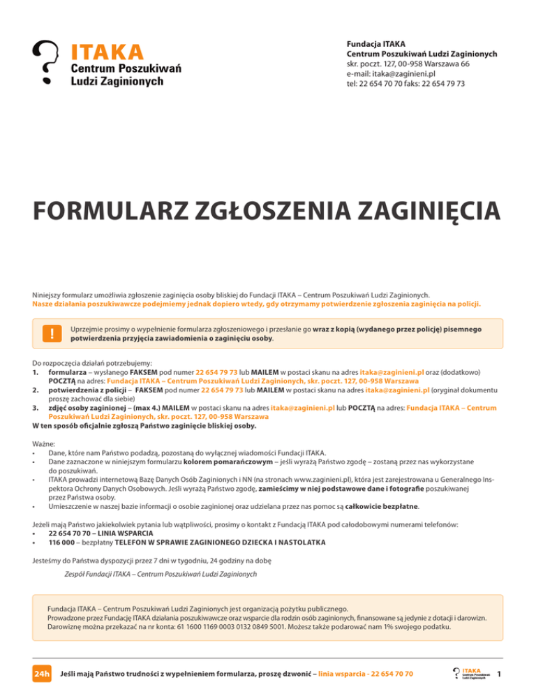 Fundacja ITAKA Centrum Poszukiwań Ludzi Zaginionych skr. poczt. 127, 00-958 Warszawa 66 e-mail: [email protected] tel: 22 654 70 70 faks: 22 654 79 73 FORMULARZ ZGŁOSZENIA ZAGINIĘCIA Niniejszy formularz umożliwia zgłoszenie zaginięcia osoby bliskiej do Fundacji ITAKA – Centrum Poszukiwań Ludzi Zaginionych. Nasze działania poszukiwawcze podejmiemy jednak dopiero wtedy, gdy otrzymamy potwierdzenie zgłoszenia zaginięcia na policji. Uprzejmie prosimy o wypełnienie formularza zgłoszeniowego i przesłanie go wraz z kopią (wydanego przez policję) pisemnego potwierdzenia przyjęcia zawiadomienia o zaginięciu osoby. Do rozpoczęcia działań potrzebujemy: 1. formularza – wysłanego FAKSEM pod numer 22 654 79 73 lub MAILEM w postaci skanu na adres [email protected] oraz (dodatkowo) POCZTĄ na adres: Fundacja ITAKA – Centrum Poszukiwań Ludzi Zaginionych, skr. poczt. 127, 00-958 Warszawa 2. potwierdzenia z policji – FAKSEM pod numer 22 654 79 73 lub MAILEM w postaci skanu na adres [email protected] (oryginał dokumentu proszę zachować dla siebie) 3. zdjęć osoby zaginionej – (max 4.) MAILEM w postaci skanu na adres [email protected] lub POCZTĄ na adres: Fundacja ITAKA – Centrum Poszukiwań Ludzi Zaginionych, skr. poczt. 127, 00-958 Warszawa W ten sposób oficjalnie zgłoszą Państwo zaginięcie bliskiej osoby. Ważne: • Dane, które nam Państwo podadzą, pozostaną do wyłącznej wiadomości Fundacji ITAKA. • Dane zaznaczone w niniejszym formularzu kolorem pomarańczowym – jeśli wyrażą Państwo zgodę – zostaną przez nas wykorzystane do poszukiwań. • ITAKA prowadzi internetową Bazę Danych Osób Zaginionych i NN (na stronach www.zaginieni.pl), która jest zarejestrowana u Generalnego Inspektora Ochrony Danych Osobowych. Jeśli wyrażą Państwo zgodę, zamieścimy w niej podstawowe dane i fotografie poszukiwanej przez Państwa osoby. • Umieszczenie w naszej bazie informacji o osobie zaginionej oraz udzielana przez nas pomoc są całkowicie bezpłatne. Jeżeli mają Państwo jakiekolwiek pytania lub wątpliwości, prosimy o kontakt z Fundacją ITAKA pod całodobowymi numerami telefonów: • 22 654 70 70 – LINIA WSPARCIA • 116 000 – bezpłatny TELEFON W SPRAWIE ZAGINIONEGO DZIECKA I NASTOLATKA Jesteśmy do Państwa dyspozycji przez 7 dni w tygodniu, 24 godziny na dobę Zespół Fundacji ITAKA – Centrum Poszukiwań Ludzi Zaginionych Fundacja ITAKA – Centrum Poszukiwań Ludzi Zaginionych jest organizacją pożytku publicznego. Prowadzone przez Fundację ITAKA działania poszukiwawcze oraz wsparcie dla rodzin osób zaginionych, finansowane są jedynie z dotacji i darowizn. Darowiznę można przekazać na nr konta: 61 1600 1169 0003 0132 0849 5001. Możesz także podarować nam 1% swojego podatku. Jeśli mają Państwo trudności z wypełnieniem formularza, proszę dzwonić – linia wsparcia - 22 654 70 70 1 Uprzejmie prosimy o wypełnienie formularza drukowanymi literami Dane zaznaczone kolorem pomarańczowym – jeśli wyrażą Państwo zgodę – zostaną przez nas wykorzystane do publikacji. INFORMACJE O OSOBIE ZAGINIONEJ NR Wypełnia Zespół Poszukiwań i Identyfikacji Fundacji ITAKA 1. Imię (imiona) 2. Nazwisko 3. Nazwiska używane wcześniej (rodowe, z poprzedniego małżeństwa, inne) 4. Pseudonim (np. przezwisko, imię używane równolegle z oficjalnym) 5. Adres e-mail 6. Telefon 7. Portale społecznościowe (link) ADRES ZAMIESZKANIA 8. Kraj 9. Województwo 10. Kod pocztowy 11. Miejscowość 12. Poczta 13. Ulica 14. Nr domu - 15. Nr mieszkania POZOSTAŁE INFORMACJE 16. Płeć K M 17. Data urodzenia D D - M M - R R R R 18. Miejsce urodzenia 19. Imię matki 20. Imię ojca 21. Obywatelstwo (obywatelstwa) 22. Wykształcenie 23. Zawód 24. Czy zna języki obce? Jakie? RYSOPIS 25. Wzrost cm 26. Waga kg 27. Budowa ciała (np. krępa, muskularna, otyła, szczupła, wysmukła, średnia, wątła) 28. Kolor oczu brązowe czarne niebieskie piwne szare zielone 29. Włosy (długość, kolor, ew. broda, wąsy) 30. Znaki szczególne: a) blizny (jakie i gdzie?) b) tatuaże (jakie i gdzie?) c) inne (jakie i gdzie?) 31. Uzębienie (np. pełne/niepełne, protezy, implanty, aparat ortodontyczny) 32.Sprzęt leczniczy (np. okulary/soczewki, aparat słuchowy, protezy/implanty, kule itp.) 33. Choroby (w tym psychiczne) 34. Czy przyjmuje leki? (jakie i jak długo?) 35. Uzależnienia/nadużywanie (np. alkohol, narkotyki, leki) Jeśli mają Państwo trudności z wypełnieniem formularza, proszę dzwonić – linia wsparcia - 22 654 70 70 2 INFORMACJE O ZAGINIĘCIU 36. Data zaginięcia D D - M M - R 38. Kraj R R R 37. Miejsce zaginięcia 39. Województwo 41. Miejscowość 40. Kod pocztowy - 42. Ulica (nr domu, nr mieszkania) 43. Ubiór (opis) 44. Jakie rzeczy osobiste wzięła ze sobą osoba zaginiona? (telefon, dokumenty, klucze, biżuteria itp.) 45. Okoliczności zaginięcia (opis) 46. Niepokojące sygnały, zdarzenia, które miały miejsce przed zaginięciem (np. konflikty rodzinne, problemy finansowe itp.) 47. Stan psychofizyczny w dniu zaginięcia (nastrój, zachowanie, o czym mówił/a, co planował/a) 48. Gdzie mogłaby się udać osoba zaginiona? (ulubione miejsca, poprzednie adresy itp.) 49. Poprzednie zaginięcia (jeśli były - to ile, kiedy i gdzie osoba się odnalazła) Pytania weryfikujące tożsamość - prosimy o podanie trzech pytań o szczegóły z życia osoby zaginionej- wraz z odpowiedziami. Informacje te umożliwią nam potwierdzenie tożsamości osoby zaginionej jeśli skontaktuje się z Fundacją ITAKA. 50. Pytanie 1 Odpowiedź 1 51. Pytanie 2 Odpowiedź 2 52. Pytanie 3 Odpowiedź 3 POLICJA UWAGA: Fundacja ITAKA może poszukiwać tylko osób, które są zgłoszone jako zaginione na policji. 53. Czy sprawa jest zgłoszona na policję? tak nie 54. Data zgłoszenia D D - M M - R R R R 55. Nazwa jednostki, w której zgłoszono zaginięcie 56. Nazwa jednostki prowadzącej sprawę (jeśli inna od miejsca zgłoszenia) 57. Policjant prowadzący
