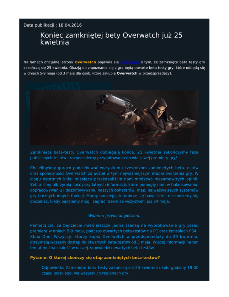 Data publikacji : 18.04.2016 Koniec zamkniętej bety Overwatch już 25 kwietnia Na łamach oficjalnej strony Overwatch pojawiła się informacja o tym, że zamknięte beta testy gry zakończą się 25 kwietnia. Okazją do zapoznania się z grą będą otwarte beta testy gry, które odbędą się w dniach 5-9 maja (od 3 maja dla osób, które zakupią Overwatch w przedsprzedaży). Zamknięte beta-testy Overwatch dobiegają końca. 25 kwietnia zakończymy fazę publicznych testów i rozpoczniemy przygotowania do własciwej premiery gry! Chcielibyśmy gorąco podziękować wszystkim uczestnikom zamkniętych beta-testów oraz społeczności Overwatch za udział w tym najważniejszym etapie tworzenia gry. W ciągu ostatnich kilku miesięcy przekazaliście nam mnóstwo niesamowitych opinii. Zebraliśmy olbrzymią ilość przydatnych informacji, które pomogły nam w balansowaniu, dopracowywaniu i doszlifowywaniu naszych bohaterów, map, najważniejszych systemów gry i różnych innych funkcji. Mamy nadzieję, że dobrze się bawiliście i nie możemy się doczekać, kiedy będziemy mogli zagrać razem ze wszystkimi już 24 maja. Wideo w języku angielskim. Pamiętajcie, że będziecie mieli jeszcze jedną szansę na wypróbowanie gry przed premierą w dniach 5-9 maja, podczas otwartych beta-testów na PC oraz konsolach PS4 i Xbox One. Wszyscy, którzy kupią Overwatch w przedsprzedaży do 29 kwietnia, otrzymają wczesny dostęp do otwartych beta-testów od 3 maja. Więcej informacji na ten temat można znaleźć w naszej zapowiedzi otwartych beta-testów. Pytanie: O której skończy się etap zamkniętych beta-testów? Odpowiedź: Zamknięte beta-testy zakończą się 25 kwietnia około godziny 19:00 czasu polskiego, we wszystkich regionach gry. Co się stanie po wyłączeniu dostępu do zamkniętej bety? Kiedy 25 kwietnia nastąpi wyłączenie serwerów, gracze nie będą mogli logować się do klienta wersji beta. Fora zamkniętej bety pozostaną dostępne do piątku 29 kwietnia. Czy będziecie przyznawać dostęp do zamkniętej bety nowym graczom przed 25 kwietnia? Nie. Obecnie nie planujemy przyznawania dostępu do zamkniętych beta-testów kolejnym graczom. Czy między otwartymi beta-testami a premierą będzie jakaś okazja, żeby zagrać w Overwatch? Otwarte beta-testy będą ostatnią okazją, żeby zagrać w Overwatch przed premierą 24 maja. Czy postępy z zamkniętych beta-testów zostaną przeniesione po premierze do pełnej wersji gry? Nie. Obecnie nie przewidujemy przeniesienia postępów graczy z zamkniętych beta-testów do otwartej bety lub premierowej wersji gry. Źródło: Battle.net Autor: Sigmar Liczba wyświetleń strony: 1412 Data publikacji : 18.04.2016 Tagi: Overwatch, beta test Komentarz (0) dodaj komentarz Brak komentarzy dodaj komentarz Pozostałe nowości DreamHack Open: Valencia 2016 - Nerchio w półfinale - live! DreamHack Valencia to jedno z największych e-sportowych wydarzeń w Europie - dlatego nie mogło zabraknąć na nim StarCrafta II! W czasie rozgrywek 96 graczy będzie konkurować o 50 000 USD oraz 5 000 punktów WCS.Data publikacji: 16.07.20161 Aktualizacja 3.4 – Duże zmiany w rankingu StarCrafta II Na oficjalnym blogu Blizzarda pojawił się nowy wpis dotyczący tym razem zmian w rankingach: Ranking StarCrafta II jest areną dla niezwykle zaciętej rywalizacji. Do walki rusza wielu uczestników, ale tylko nieliczni awansują do ścisłej czołówki.Data publikacji: 03.07.20160 Rozpoczęcie trzeciego sezonu rankingowego 2016 Trzeci sezon tegorocznych rozgrywek ligowych w StarCrafta II uważamy za otwarty! Zresetowano pulę punktów premiowych oraz rankingi i przyznano nagrody za sezon drugi roku 2016.Data publikacji: 26.06.20160 Filmowy „Warcraft” już wkrótce w księgarniach! Powieść „Warcraft”, której wydanie zbiega się z polską premierą filmu „Warcraft. Początek” w reżyserii Duncana Jonesa, do księgarń trafi już 15 czerwca. Na kartach książki czytelnicy wkroczą w nowy wymiar emocji towarzyszących bohaterom fikcyjnych światów Azeroth i Draenor. Za sprawą Christie Golden, pisarki od lat cenionej przez fanów świata Warcraft, konflikt ludzi i orków nabierze jeszcze większej intensywności.Data publikacji: 13.06.20160 Blokada obecnego sezonu i darmowa zmiana nazwy postaci Jak czytamy na oficjalnym blogu Blizzarda: Obecny sezon rankingowy zbliża się ku końcowi i wkrótce zamknięte zostaną wszystkie ligi i dywizje. Kilka dni przed rozpoczęciem nowego sezonu, darmowa zmiana nazwy postaci w StarCraft II zostanie ponownie dodana do wszystkich kont, dla których funkcja ta nie jest obecnie dostępna.Data publikacji: 12.06.20160 Wszystkie nowości