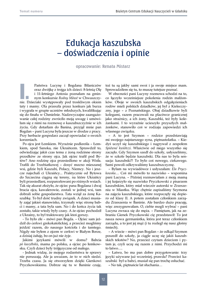 Temat numeru Biuletyn Centrum Edukacji Nauczycieli w Gdańsku Edukacja kaszubska – doświadczenia i opinie opracowanie: Renata Mistarz I. Państwa Lucynę i Bogdana Biłaniczów oraz dwójkę z trojga ich dzieci: 8-letnią Olę i 11-letniego Antosia poznałam na gminnym konkursie Rodny Mòwë w Chwaszczynie. Dzieciaki występowały pod troskliwym okiem taty i mamy. Ola przeszła przez konkurs jak burza i wygrała w grupie uczniów młodszych, kwalifikując się do finału w Chmielnie. Nadzwyczajne zaangażowanie całej rodziny zwróciło moją uwagę i umówiłam się z nimi na rozmowę o kaszubszczyźnie w ich życiu. Gdy dotarłam do Banina, przyjął mnie pan Bogdan – pani Lucyna była jeszcze w drodze z pracy. Przy herbacie gospodarz zaczął opowiadać o swoich korzeniach. Po ojcu jest Łemkiem. Wyraźnie podkreśla – Łemkiem, spod Sanoka, nie Ukraińcem. Sprawdził to, odwiedzając jakiś czas temu z żoną rodzinne strony przodków ze strony ojca. Jak ojciec trafił pod Bytów? Ano rodzinę ojca przesiedlono w akcji Wisła. Trafili do Trzebiatkowej – dosyć mocno mieszanej wsi, gdzie byli Kaszubi, Polacy, Niemcy. No i jeszcze najechali ci Ukraińcy... Praktycznie od Bytowa do Szczecina ciągną się tereny, na które Ukraińcy byli przesiedlani, rozparcelowani po różnych wsiach. Tak się akurat złożyło, że ojciec pana Bogdana i dwaj bracia ojca, kawalerowie, zostali w jednej wsi, tam dobrali sobie gospodarstwa. Tata wziął za żonę Kaszubkę. To był dość trudny związek. A dzieci musiały zająć jakieś stanowisko, trzymały więc stronę babci i mamy, a tata była sam. No i do końca życia tak zostało, takie wtedy były czasy. A że ojciec pochodził z Ukrainy, to był traktowany jak ktoś gorszy. - To było złe – mówi pan Bogda. – Ojciec sam jeździł do cerkwi grekokatolickiej, a przecież mogliśmy jeździć razem, do naszego kościoła i do tamtego. Nigdy nie byłem z ojcem w cerkwi w Białym Borze, a dzisiaj żałuję, bo on już nie żyje. Jakimi językami mówili w domu? Babcia pò kaszëbskù, mama po polsku, a ojciec po łemkowsku. Czyli dzieci były trójjęzyczne od małego. - Jednak widzę, że mojego rodzeństwa te sprawy nie poruszają. Ale ja uważam, że to w nich siedzi. Trzeba czasu. Ja się otworzyłem dzięki Gienkowi Pryczkowskiemu. Dobrze się tu w Baninie czuję, toż tu są jakby sami swoi i ja swoje miejsce mam. Sprowadziłem się tu, to muszę tutejsze poznać. W obecności pani Lucyny rozmowa schodzi na to, co łączyło wcześniejsze pokolenia rodzin małżonków. Oboje w swoich kaszubskich odgałęzieniach rodów mieli polskich dziadków, jej był z Kielecczyzny, jego – z Poznańskiego. Obaj dziadkowie byli kolegami, razem pracowali na placówce granicznej jako strażnicy, a ich żony, Kaszubki, też były koleżankami. I to wyraźnie ucieszyło przyszłych małżonków, stanowiło coś w rodzaju zapowiedzi ich własnego związku. – A to jest Szymon – rodzice przedstawiają mi swojego najstarszego syna, piętnastolatka. – Kiedyś uczył się kaszubskiego i nagrywał z zespołem Spiéwné kwiôtczi. Właściwie od niego wszystko się zaczęło. Gdy Szymon szedł do szkoły, usłyszeliśmy, że w szkole będzie kaszubski. Dla nas to była sensacja: kaszubski?! To było coś nowego, ciekawego. Sami powoli odkrywaliśmy kaszubszczyznę. – Byłam na wywiadówce i usłyszałam: Ela Pryczkowska… Coś mi mówiło to nazwisko – wspomina pani Lucyna. – Później rozmawiałam z moją mamą i jej kojarzyło się nazwisko Pryczkowski z pisarzem kaszubskim, który miał wieczór autorski w Zrzeszeniu w Miastku. Więc chętnie zapisaliśmy Szymona na zajęcia kaszubskiego, które rozpoczęły się dopiero od klasy II. A potem zostałam członkiem zarządu Zrzeszenia w Baninie. Ale bardzo dużo pracuję, więc zrezygnowałam. O, ciebie mogli wybrać – pani Lucyna zwraca się do męża. – Pamiętam, jak na zebraniu Gienek Pryczkowski cię przedstawił: To jest nasza nowa germanistka, która jest teraz członkiem zarządu, a to jest jej mąż (i tu rozległ się nasz głośny śmiech). – A wiecie – mówi pan Bogdan – że odkąd Szymon poszedł do szkoły, ja ciągle uczę się jakiś kaszubskich tekstów? No, przecież czytam dzieciom i pytam je, czyli uczę się razem z nimi. Przychodzi mi to łatwo…. – Łatwo, bo ma pan dobre przygotowanie: trzy języki używane już wcześniej, prawda? Przecież kaszubski był u babci, musiał się pan trochę osłuchać. – No tak, piętnaście lat słuchania… 12 Fot. R. Mistarz Fot. R. Mistarz EDUKACJA POMORSKA nr 64/65 (15/16) – maj-sierpień 2014 r. Ola, podobnie jak bracia, ma teczkę pełną dyplomów dokumentujących jej sukcesy, w większości związane z kaszubszczyzną. Portfolia założył dzieciom tata. Teczki są rodzinnie przeglądane, pomagają kształtować osobowość dzieci, budują wiarę we własne możliwości. publicznego występowania i przemawiania. Zachęca dzieci do brania udziału w konkursach i wspiera w przygotowaniach. Ola zaczęła startować w konkursach recytatorskich bardzo wcześnie, za namową pani od religii, uczącej też kaszubskiego. Było to jeszcze w „zerówce”, do której dziewczynka poszła rok wcześniej niż jej rówieśnicy. No i za swoje osiągnięcia z okresu „zerówki” i klasy I została stypendystką burmistrza Żukowa. Gdy otrzymywała stypendium, była tak mała, że wręczający je burmistrz nie dostrzegł zgłaszającej się dziewczynki i uznał, że na uroczystość po prostu nie dotarła… Dzieci państwa Biłaniczów często recytują kaszubskie utwory podczas rodzinnych uroczystości, dla babci, prababci i pozostałych członków rodziny. Ostatnio Antek zaśpiewał prababci – na setne urodziny – hymn kaszubski, bo prababcia znała tę pieśń i śpiewała ją wcześniej mamie Antka. Podczas naszego spotkania Ola, na prośbę rodziców, opowiada kaszubskie szporty, dzięki którym zdobyła wiele nagr