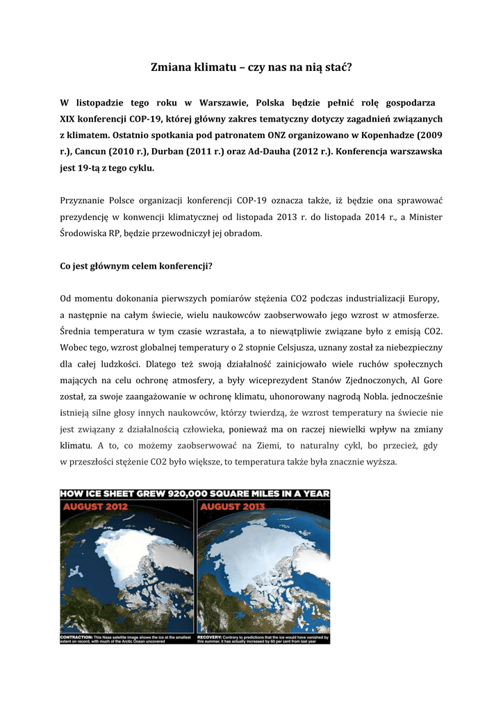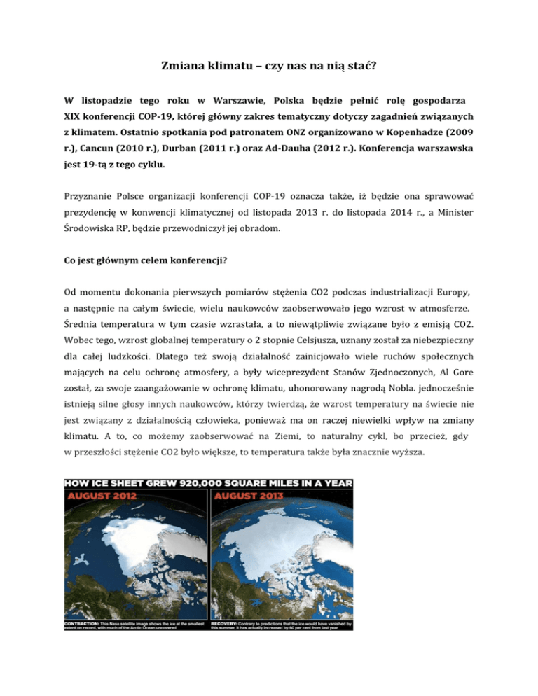 Zmiana klimatu – czy nas na nią stać? W listopadzie tego roku w Warszawie, Polska będzie pełnić rolę gospodarza XIX konferencji COP-19, której główny zakres tematyczny dotyczy zagadnień związanych z klimatem. Ostatnio spotkania pod patronatem ONZ organizowano w Kopenhadze (2009 r.), Cancun (2010 r.), Durban (2011 r.) oraz Ad-Dauha (2012 r.). Konferencja warszawska jest 19-tą z tego cyklu. Przyznanie Polsce organizacji konferencji COP-19 oznacza także, iż będzie ona sprawować prezydencję w konwencji klimatycznej od listopada 2013 r. do listopada 2014 r., a Minister Środowiska RP, będzie przewodniczył jej obradom. Co jest głównym celem konferencji? Od momentu dokonania pierwszych pomiarów stężenia CO2 podczas industrializacji Europy, a następnie na całym świecie, wielu naukowców zaobserwowało jego wzrost w atmosferze. Średnia temperatura w tym czasie wzrastała, a to niewątpliwie związane było z emisją CO2. Wobec tego, wzrost globalnej temperatury o 2 stopnie Celsjusza, uznany został za niebezpieczny dla całej ludzkości. Dlatego też swoją działalność zainicjowało wiele ruchów społecznych mających na celu ochronę atmosfery, a były wiceprezydent Stanów Zjednoczonych, Al Gore został, za swoje zaangażowanie w ochronę klimatu, uhonorowany nagrodą Nobla. jednocześnie istnieją silne głosy innych naukowców, którzy twierdzą, że wzrost temperatury na świecie nie jest związany z działalnością człowieka, ponieważ ma on raczej niewielki wpływ na zmiany klimatu. A to, co możemy zaobserwować na Ziemi, to naturalny cykl, bo przecież, gdy w przeszłości stężenie CO2 było większe, to temperatura także była znacznie wyższa. Źródło: (Daily Mail) MailOnline, 13 września 2013 rok Nie chcę mówić, ani osądzać, kto ma rację a kto nie. Moje podejście jest inne. Powinniśmy dbać o czyste środowisko i oddychać zdrowym powietrzem bez ryzyka zatrucia CO2 lub innymi gazami. Dlatego też, popieram wszelkie starania, które prowadzą do zwiększenia stopnia czystości naszej planety i klimatu. Bez wątpienia jest to największe wyzwanie, przed którym stoi dziś ludzkość. Jak rozumieć wyzwanie? Spostrzec można, że wyzwanie, jakim jest ochrona klimatu, pojmowane jest pozytywnie właściwie przez wszystkie kraje świata. Padło wiele deklaracji i przyrzeczeń. Przy tym wiodącą rolę w tej kwestii odgrywa UE, która wspierana jest przez kraje OECD i G-20, nie wykluczając zresztą gospodarek krajów rozwijających się. Wydaje się, że problem jest bardzo dobrze rozumiany, a każde wielonarodowe porozumienie może zostać z łatwością osiągnięte. Niestety, „diabeł tkwi w szczegółach”. Aby wymienić kilka z nich wystarczy wspomnieć o: różnym poziomie rozwoju gospodarczego oraz jego dalszych perspektywach, możliwości wykorzystania energii odnawialnej zależnie od uwarunkowań geograficznych, zasobach rodzimych źródeł energii i różnych systemach prawnych – przy tym, czy zaproponowane krajom rozwiązania powinny być obligatoryjne, czy oparte na deklaracjach, i jakie będą spodziewane międzynarodowe konsekwencje z tytułu ich nie wypełnienia, jeśli w ogóle będą? Jak mierzyć emisję CO2: w procentach czy w tonach? Wszelkie dyskusje w kwestii dokonywania pomiarów CO2 były do tej pory w poszczególnych krajach oparte na odniesieniach procentowych. Ale co to tak naprawdę oznacza, gdy mówimy, że kraj X zmniejszył od roku 1990 swoją emisję CO2 o 20% albo i o więcej? Z całą natomiast pewnością jest to bez znaczenia dla przeciętnego człowieka, skoro właściwie nie wie, co tak naprawdę pułap 20% oznacza dla Australii, a co dla UE. Posługiwanie się procentami w dyskusji na temat emisji CO2 nie zawsze jest zrozumiałe, ponieważ nie pokazuje ono rzeczywistej siły gospodarczej oraz rozwoju danego kraju. Dlatego też doceniam propozycję CEEP, aby we wszystkich dokumentach powstałych po 2020 roku, stosować jednostkę miary wyrażoną w „tonach na mieszkańca” zamiast procentów. Użycie jednostki miary „tona na mieszkańca” stanowi jasne i precyzyjne odniesienie dla każdego, a jego zastosowanie jest łatwe w przypadku przeprowadzania badań porównawczych rzeczywistych poziomów emisji. Dlatego, aby lepiej zrozumieć całą sytuację oraz występujące różnice, będę posługiwał się jednostką miary „tona na mieszkańca”, zamiast procentami. „Łatwiej powiedzieć, niż zrobić” Musimy wziąć pod uwagę ogromne różnice w rozwoju gospodarczym, jakie występują na całym świecie, nie zapominając przy tym o narodowych aspiracjach do rozwijania swoich gospodarek drogą industrializacji. W większości przypadków, uprzemysłowienie zawsze oznaczać będzie większą emisję CO2. W krajach rozwiniętych takich, jak Stany Zjednoczone, emisja CO2 liczona na jednego mieszkańca w 2011 roku wyniosła 17,3 tony, w Kanadzie 16,2, w Australii 19, w Japonii 9,8, w Rosji 12,8, a w Korei Południowej 12,6. Jednocześnie w EU średni poziom emisji w 2011 roku wynosił 7,5 tony. Emisja CO2 w 2011 roku w przykładowych krajach (tony na mieszkańca) Stany Zjednoczone 17,3 Kanada 16,2 Australia 19,0 Japonia 9,8 Rosja 12,8 Korea Płd. 12,6 Chiny 7,2 Indie 1,6 Brazylia 2,3 Turcja 3,8 Indonezja 2,0 Afryka Płd. 7,2 UE 7,5 Źródło: Joint Research Centre (JRC) To oczywiste, że UE musiała przeznaczyć znaczne środki, aby ograniczyć emisję CO2. Średnia dla świata wynosiła w 2011 roku zaledwie 4,9 tony. Jeśli weźmiemy pod uwagę globalny punkt odniesienia, to wówczas widać, że większość państw, znajduje się poniżej poziomu UE. Największy emitent na świecie, Chiny, w szybkim jednak tempie zbliża się do średniej unijnej. Przy czym Chiny, już zmuszone są stawić czoła katastrofalnej sytuacji wynikającej z faktu skoncentrowania zanieczyszczeń na terenach uprzemysłowionych, które z kolei zamieszkiwane są przez znaczną część chińskiej populacji. Wiele du