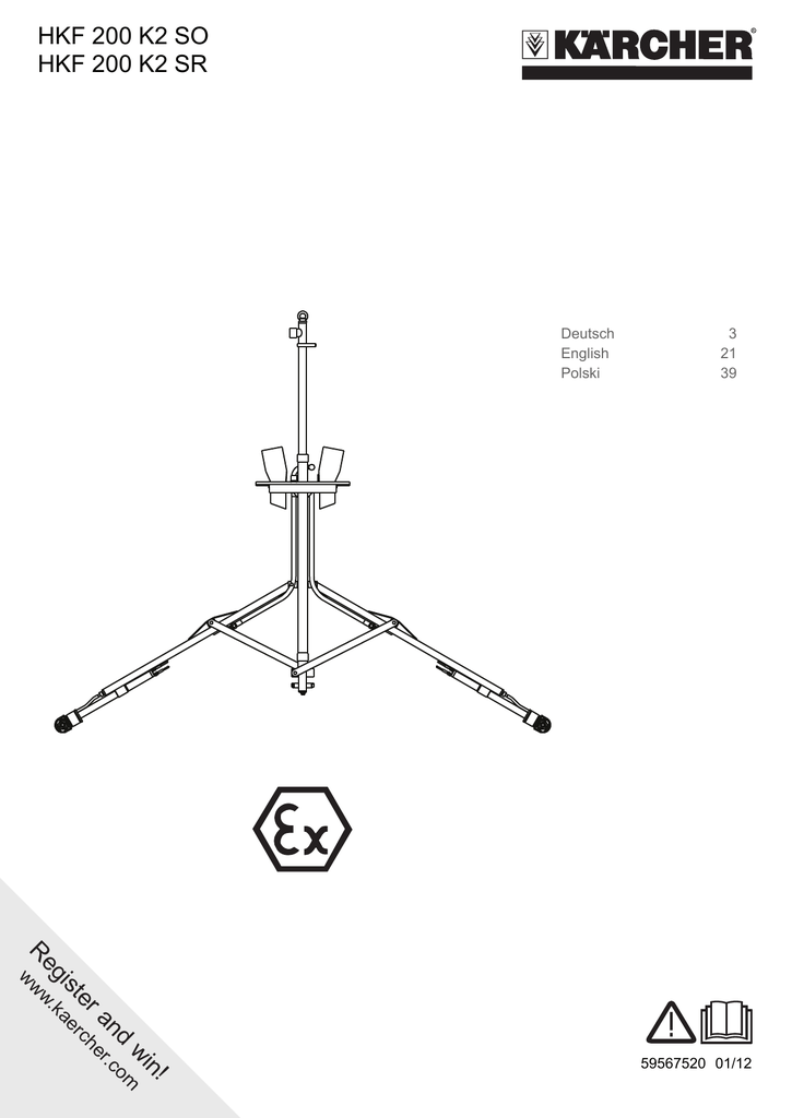 HKF 200 K2 SO HKF 200 K2 SR Deutsch English Polski 3 21 39 R e w gis w w. te ka r a er n ch d er .c w om in! 59567520 01/12 2 Lesen Sie vor der ersten Benutzung Ihres Gerätes diese OrigiDeutsch nalbetriebsanleitung, handeln Sie danach und bewahren Sie diese für späteren Gebrauch oder für Nachbesitzer auf. – Vor erster Inbetriebnahme Sicherheitshinweise Nr. 5.951-949 unbedingt lesen! – Bei Transportschaden sofort Händler informieren. Inhaltsverzeichnis Umweltschutz . . . . . . . . . . . Symbole in der Betriebsanleitung. . . . . . . . . . . . . . . . . . . Bestimmungsgemäße Verwendung . . . . . . . . . . . . . . . . . . Funktion . . . . . . . . . . . . . . . Sicherheitshinweise . . . . . . Technische Daten. . . . . . . . Inbetriebnahme. . . . . . . . . . Bedienung. . . . . . . . . . . . . . Außerbetriebnahme . . . . . . Stilllegung . . . . . . . . . . . . . . Lagerung. . . . . . . . . . . . . . . Transport . . . . . . . . . . . . . . Pflege und Wartung . . . . . . Hilfe bei Störungen . . . . . . . EG-Konformitätserklärung . Garantie . . . . . . . . . . . . . . . Reinigungsabläufe . . . . . . . DE . . 1 DE . . 1 DE DE DE DE DE DE DE DE DE DE DE DE DE DE DE .. 1 .. 2 .. 3 .. 6 . 13 . 14 . 15 . 15 . 15 . 15 . 15 . 16 . 17 . 17 . 18 Umweltschutz Die Verpackungsmaterialien sind recyclebar. Bitte werfen Sie die Verpackungen nicht in den Hausmüll, sondern führen Sie diese einer Wiederverwertung zu. Altgeräte enthalten wertvolle recyclingfähige Materialien, die einer Verwertung zugeführt werden sollten. Batterien, Öl und ähnliche Stoffe dürfen nicht in die Umwelt gelangen. Bitte entsorgen Sie Altgeräte deshalb über geeignete Sammelsysteme. Hinweise zu Inhaltsstoffen (REACH) Aktuelle Informationen zu Inhaltsstoffen finden Sie unter: www.kaercher.de/REACH Symbole in der Betriebsanleitung Gefahr Für eine unmittelbar drohende Gefahr, die zu schweren Körperverletzungen oder zum Tod führt. 몇 Warnung Für eine möglicherweise gefährliche Situation, die zu schweren Körperverletzungen oder zum Tod führen könnte. Vorsicht Für eine möglicherweise gefährliche Situation, die zu leichten Verletzungen oder zu Sachschäden führen kann. Bestimmungsgemäße Verwendung Die Tank-Reinigungsvorrichtung HKF 200 K2 ist eine Spritzeinrichtung zur Reinigung von Tankwagen. – Die Reinigungsköpfe werden von oben in den vollständig entleerten Tank eingebracht. Nach Befestigung der Grundplatte am Dom des Tanks, werden die beiden Reinigungsköpfe durch eine mechanische Vorrichtung in Arbeitsstellung geschwenkt und reinigen die Innenwände des Tanks mit HochdruckFlüssigkeitsstrahlen. Der Tank kann durch Zuführen von Wasserdampf (Sattdampf) vor dem Reinigungsvorgang von innen beheizt werden. Zum Trocknen kann Warmluft durch den Tankraum geleitet werden. – Druckluft, Hochdruck, Dampf und Warmluft werden von separaten Einrichtungen erzeugt und durch Zuleitungen an die Tank-Reinigungsvorrichtung angeschlossen. Für die Sicherheit der gesamten Anlage ist der Betreiber verantwortlich. – Die Tank-Reinigungsvorrichtung darf nur während des Reinigungsvorgangs im Behälter sein. Der Antrieb der Reinigungsköpfe darf nur bei gleichzeitiger Versorgung mit Reinigungsflüssigkeit eingeschaltet werden. Hinweis: Es dürfen nur die im Kapitel „Reinigungsabläufe“ aufgeführten Reinigungsmittel bei den angegebenen Temperaturen verwendet werden. Dabei sind für die aufgeführten Reststoffe nur die im Kapitel „Reinigungsabläufe“ zugeordneten Reinigungsflüssigkeiten zu verwenden. – Als nicht bestimmungsgemäß gilt der Betrieb außerhalb geschlossener Behälter und mit höheren Drücken und höheren Temperaturen als in den Technischen Daten angegeben. Bitte Reinigungsflüssigkeiten nicht in die Umwelt gelangen lassen. Bitte Boden schützen und Altöl umweltgerecht entsorgen. Bitte mineralölhaltiges Abwasser nicht ins Erdreich, Gewässer oder Kanalisation gelangen lassen. DE -1 3 Funktion 5 3 1 2 7 4 6 4 B A 9 8 – – – 4 Die Tank-Reinigungsvorrichtung besteht aus Grundplatte (1), Klappgestell (2), Zugrohr (3) und zwei Reinigungsköpfen (4) mit Druckluftantrieb. Während des Betriebes ist die TankReinigungsvorrichtung mit der Ringschraube (5) an einem Hebezeug befestigt. Das Klappgestell bewegt die Reinigungsköpfe in die Ein-/Ausfahrstellung (A) oder die Arbeitsstellung (B). In der Ein-/Ausfahrstellung ist das Zugrohr nach unten geschoben und mit der Transportsicherung an der Grundplatte arretiert. Die Reinigungsköpfe sind nach unten geschwenkt. In dieser Stellung wird die Tank-Reinigungsvorrichtung in Tanks ein- und ausgefahren. In Arbeitsstellung ist die Grundplatte mit den beiden Spannvorrichtungen dicht auf den Tankdom gespannt. Durch das Unter-/Überdruckventil (8) findet der Druckausgleich zwischen Behälter und Umgebung statt. Das Zugrohr wird mit dem Hebezeug bis zur Markierung nach oben gezogen. Dabei werden die Reinigungsköpfe in Arbeitsstellung geschwenkt. – – – – Über das Zugrohr und die Dampfdüsen (6) kann Dampf zur Beheizung des Tanks eingeleitet werden. Bei Behältern ohne Boden-Ablassventil kann durch die Absaugöffnung (9) Restflüssigkeit mit einer bauseitigen Saugeinrichtung abgesaugt werden. Die Düsen der Reinigungsköpfe drehen sich um zwei Achsen und erfassen dadurch jede Stelle des Tanks. Der Antrieb erfolgt durch Druckluftmotoren. Nach der Reinigung kann über die beiden Warmluftanschlüsse (7) Luft zum Trocknen des Tanks ein- und ausgeleitet werden. DE -2 Sicherheitshinweise Jeweilige nationale Vorschriften des Gesetzgebers beachten. – Sicherheitshinweise, die den verwendeten Reinigungsmitteln beigestellt sind (i. d. R. auf dem Verpackungsetikett) beachten. – Um Gefahren durch falsche Bedienung zu vermeiden darf die Anlage nur von Personen bedient werden, die in der Handhabung unterwiesen sind, ihre Fähigkeiten zum Bedienen nachgewiesen haben und mit der Benutzung beauftragt sind. – Die Betriebsanleitung muss jedem Bediener zugänglich sein