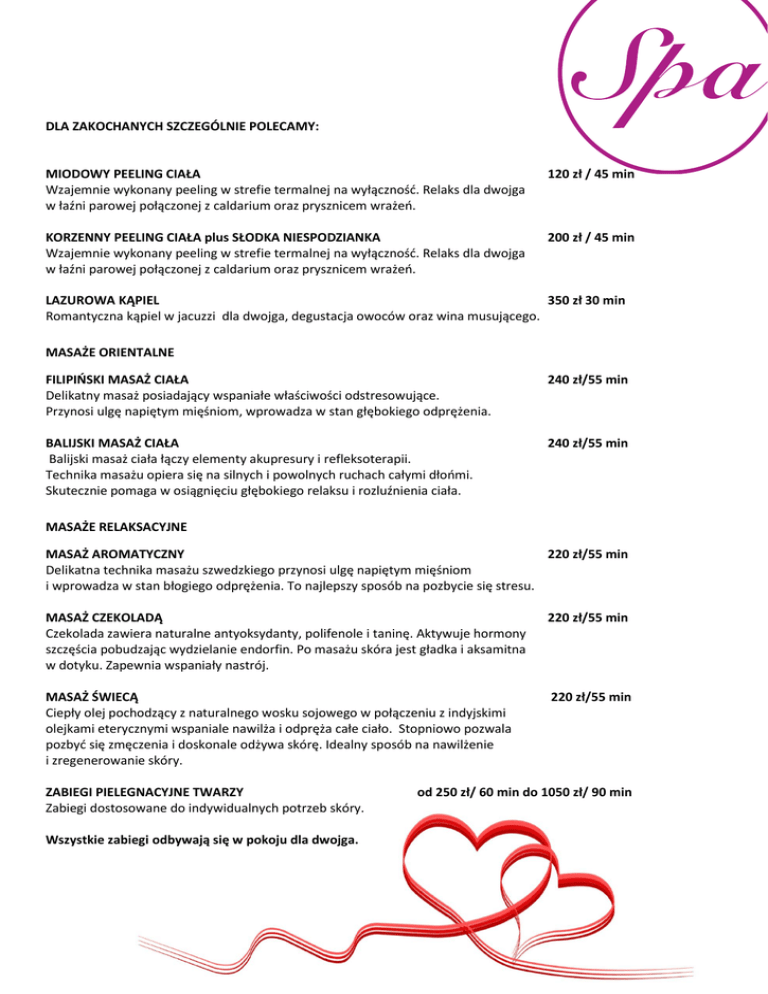 DLA ZAKOCHANYCH SZCZEGÓLNIE POLECAMY: MIODOWY PEELING CIAŁA Wzajemnie wykonany peeling w strefie termalnej na wyłączność. Relaks dla dwojga w łaźni parowej połączonej z caldarium oraz prysznicem wrażeń. 120 zł / 45 min KORZENNY PEELING CIAŁA plus SŁODKA NIESPODZIANKA Wzajemnie wykonany peeling w strefie termalnej na wyłączność. Relaks dla dwojga w łaźni parowej połączonej z caldarium oraz prysznicem wrażeń. 200 zł / 45 min LAZUROWA KĄPIEL 350 zł 30 min Romantyczna kąpiel w jacuzzi dla dwojga, degustacja owoców oraz wina musującego. MASAŻE ORIENTALNE FILIPIŃSKI MASAŻ CIAŁA Delikatny masaż posiadający wspaniałe właściwości odstresowujące. Przynosi ulgę napiętym mięśniom, wprowadza w stan głębokiego odprężenia. 240 zł/55 min BALIJSKI MASAŻ CIAŁA Balijski masaż ciała łączy elementy akupresury i refleksoterapii. Technika masażu opiera się na silnych i powolnych ruchach całymi dłońmi. Skutecznie pomaga w osiągnięciu głębokiego relaksu i rozluźnienia ciała. 240 zł/55 min MASAŻE RELAKSACYJNE MASAŻ AROMATYCZNY 220 zł/55 min Delikatna technika masażu szwedzkiego przynosi ulgę napiętym mięśniom i wprowadza w stan błogiego odprężenia. To najlepszy sposób na pozbycie się stresu. MASAŻ CZEKOLADĄ Czekolada zawiera naturalne antyoksydanty, polifenole i taninę. Aktywuje hormony szczęścia pobudzając wydzielanie endorfin. Po masażu skóra jest gładka i aksamitna w dotyku. Zapewnia wspaniały nastrój. 220 zł/55 min MASAŻ ŚWIECĄ Ciepły olej pochodzący z naturalnego wosku sojowego w połączeniu z indyjskimi olejkami eterycznymi wspaniale nawilża i odpręża całe ciało. Stopniowo pozwala pozbyć się zmęczenia i doskonale odżywa skórę. Idealny sposób na nawilżenie i zregenerowanie skóry. 220 zł/55 min ZABIEGI PIELEGNACYJNE TWARZY Zabiegi dostosowane do indywidualnych potrzeb skóry. Wszystkie zabiegi odbywają się w pokoju dla dwojga. od 250 zł/ 60 min do 1050 zł/ 90 min