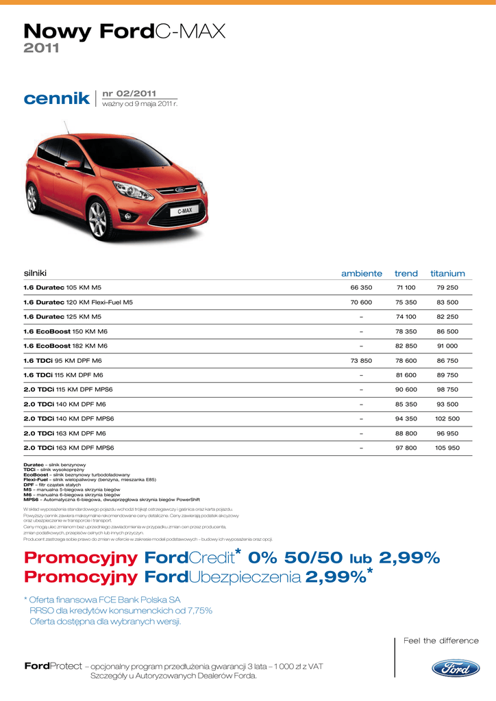 Nowy FordC-MAX 2011 nr 02/2011 cennik wa˝ny od 9 maja 2011 r. silniki ambiente trend titanium 1.6 Duratec 105 KM M5 66 350 71 100 79 250 1.6 Duratec 120 KM Flexi–Fuel M5 70 600 75 350 83 500 1.6 Duratec 125 KM M5 – 74 100 82 250 1.6 EcoBoost 150 KM M6 – 78 350 86 500 1.6 EcoBoost 182 KM M6 – 82 850 91 000 1.6 TDCi 95 KM DPF M6 73 850 78 600 86 750 1.6 TDCi 115 KM DPF M6 – 81 600 89 750 2.0 TDCi 115 KM DPF MPS6 – 90 600 98 750 2.0 TDCi 140 KM DPF M6 – 85 350 93 500 2.0 TDCi 140 KM DPF MPS6 – 94 350 102 500 2.0 TDCi 163 KM DPF M6 – 88 800 96 950 2.0 TDCi 163 KM DPF MPS6 – 97 800 105 950 Duratec – silnik benzynowy TDCi – silnik wysokopr´˝ny EcoBoost – silnik beznynowy turbodo∏adowany Flexi–Fuel – silnik wielopaliwowy (benzyna, mieszanka E85) DPF – filtr czàstek sta∏ych M5 – manualna 5-biegowa skrzynia biegów M6 – manualna 6-biegowa skrzynia biegów MPS6 – Automatyczna 6-biegowa, dwusprz´g∏owa skrzynia biegów PowerShift W sk∏ad wyposa˝enia standardowego pojazdu wchodzi trójkàt ostrzegawczy i gaÊnica oraz karta pojazdu. Powy˝szy cennik zawiera maksymalne rekomendowane ceny detaliczne. Ceny zawierajà podatek akcyzowy oraz ubezpieczenie w transporcie i transport. Ceny mogà ulec zmianom bez uprzedniego zawiadomienia w przypadku zmian cen przez producenta, zmian podatkowych, przepisów celnych lub innych przyczyn. Producent zastrzega sobie prawo do zmian w ofercie w zakresie modeli podstawowych – budowy ich wyposa˝enia oraz opcji. Promocyjny FordCredit* 0% 50/50 lub 2,99% Promocyjny FordUbezpieczenia 2,99%* * Oferta finansowa FCE Bank Polska SA RRSO dla kredytów konsumenckich od 7,75% Oferta dost´pna dla wybranych wersji. FordProtect – opcjonalny program przed∏u˝enia gwarancji 3 lata – 1 000 z∏ z VAT Szczegó∏y u Autoryzowanych Dealerów Forda. Nowy FordC-MAX 2011 bezpieczeƒstwo wyposa˝enie iente amb d tren s s s s s s – – s s s s – – p s s s s p p s s s s s s s – p s – – s – – s p s s 4 500 – – s – s – – s – – – s s p p s s – s – s – 900 (3) 1 000 – – s s s s – s s – s 900 (3) 1 000 – – – – – s p p p s p s s s s – – – – – – 1 400 p 2 100 800 p s p – 800 p – p p – 100 100 p 100 100 s s s s s 5 300 1 500 2 900 1 500 750 1 950 400 s 800 s – – 750 1 950 200 s 800 – s 1 400 Inteligentny system bezpieczeƒstwa (IPS) System ABS z elektronicznym uk∏adem podzia∏u si∏y hamowania (EBD) Elektroniczny uklad stabilizacji toru jazdy (ESP) z uk∏adem kontroli trakcji (TA) oraz uk∏adem wspomagania awaryjnego hamowania (EBA) Zawansowany uk∏ad ESP – elektroniczny uk∏ad toru jazdy (ESP) z uk∏adem kontroli trakcji (TA), uk∏adem wspomagania awaryjnego hamowania (EBA) ora uk∏adem u∏atwiajàcym ruszanie na wzniesieniach (HSA) Poduszki powietrzne czo∏owe dla kierowcy i pasa˝era z przodu Poduszki powietrzne boczne dla kierowcy i pasa˝era z przodu Boczne kurtyny powietrzne chroniàce osoby w 1 i 2 rz´dzie siedzeƒ Âwiat∏a awaryjnego hamowania w∏àczajàce si´ automatycznie podczas gwa∏townego hamowania Wycieraczki przedniej szyby automatyczne z czujnikiem deszczu Przednie Êwiat∏a przeciwmgielne System reflektorów automatycznych z automatycznymi wycieraczkami z czujnikiem deszczu, automatycznie Êciemniajàcym si´ lusterkiem wstecznym, funkcjà wy∏àczania Êwiate∏ z opóênieniem oraz przednie Êwiat∏a przeciwmgielne System reflektorów biksenonowych z samoczynnà regulacja kàta ustawienia i spryskiwaczami, systemem statycznych Êwiate∏ doÊwietlajàcych zakety (zawierajà regulacj´ jasnoÊci podÊwietlenia zegarów) System elektrycznej blokady tylnych drzwi uniemo˝liwiajàcy ich otwarcie od Êrodka przez dzieci System bezkorkowego wlewu paliwa Ford Easy Fuel komfort Klimatyzacja manualna Klimatyzacja dwustrefowa z automatycznà regulacjà temperatury (DEATC) Przycisk rozrusznika FordPower Komputer pok∏adowy Fotel kierowcy – regulacja odcinka l´dêwiowego Fotel kierowcy – r´czna regulacja po∏o˝enia w p∏aszczyênie przód–ty∏ Fotel kierowcy – r´czna regulacja po∏o˝enia w p∏aszczyznach: góra–dó∏ i przód–ty∏ Fotel pasa˝era z przodu – r´czna regulacja podparcia odcinka l´dêwiowego Fotel pasa˝era z przodu – r´czna regulacja po∏o˝enia w p∏aszczyênie przód–ty∏ Fotel pasa˝era z przodu – r´czna regulacja po∏o˝enia w p∏aszczyznach: góra–dó∏ i przód–ty∏ Przednie fotele podgrzewane z regulacjà temperatury System komfortowej konfiguracji foteli w 2. rz´dzie (niedost´pny w kombinacji z ko∏em zapasowym) Lusterka boczne – sterowane elektrycznie, obudowy w kolorze nadwozia, ze zintegrowanymi kierunkowskazami Lusterka boczne – sterowane i podgrzewane elektrycznie, obudowy w kolorze nadwozia, ze zintegrowanymi kierunkowskazami Lusterka boczne – sk∏adane elektrycznie Lusterko wsteczne samoczynnie Êciemniajàce si´ Lusterko do obserwowania dzieci na tylnych fotelach Elektrycznie sterowane szyby przednich drzwi, szyba kierowcy otwierana ca∏kowicie jednym naciÊni´ciem przycisku Elektrycznie sterowane szyby przednich i tylnych drzwi, opuszczane i podnoszone jednym naciÊni´ciem przycisku, funkcja ca∏kowitego otwierania i zamykania wszystkich szyb Czujniki parkowania – z przodu i z ty∏u Czujniki parkowania z ty∏u Podgrzewana przednia szyba Quickclear Tempomat z funkcjà regulowanego uk∏adu ograniczania pr´dkoÊci (ASLD) Dach panoramiczny nieotwierany z elektrycznie sterowanymi roletami przeciws∏onecznymi (niedost´pny w kombinacji z d∏ugà konsolà dachowà) Konsola Êrodkowa Premium – z pod∏okietnikiem z regulacjà w poziomie, otwartym schowkiem, schowkiem na p∏yty CD, dodatkowymi gniazdkami zasilania 12V (z przodu i z ty∏u), nawiewami wentylacji w 2. rz´dzie siedzeƒ, z wykoƒczeniem górnej kraw´dzi uchwytów na kubki w kolorze chromu, wykoƒczeniem podsufitki z tkaniny o podwy˝szonej jakoÊci, uchwytem dêwigni ha