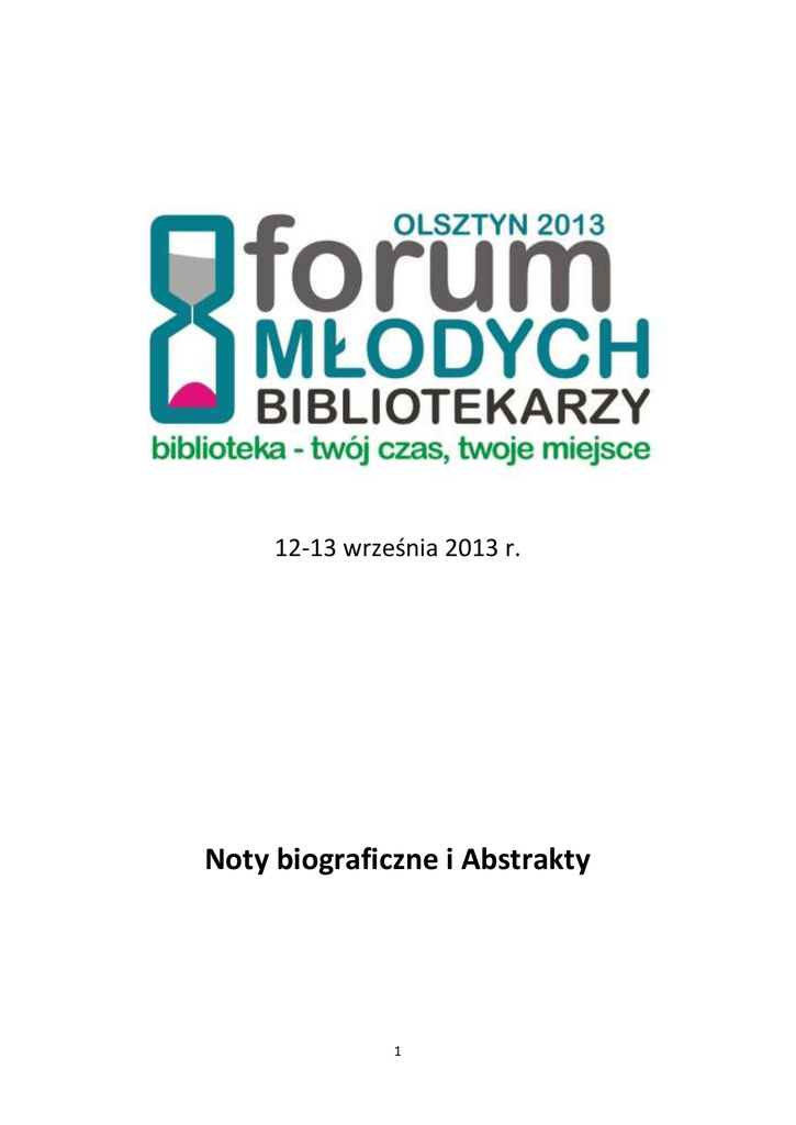 12-13 września 2013 r. Noty biograficzne i Abstrakty 1 Aplikacje mobilne w bibliotece W krótkich żołnierskich słowach o korzyściach związanych z zastosowaniem nowych technologii w relacjach z czytelnikami. Opowiemy o pilotażowym projekcie "mobilna biblioteka", dzięki któremu biblioteka opuściła swoją siedzibę, by na kilka godzin zagościć podczas Jarmarku Cysterskiego w Łeknie. Uczestnicy imprezy przez cały dzień mogli zapisywać się do biblioteki, przeglądać katalog online oraz wypożyczać książki. Opowiemy o nowych technologiach także w kontekście osób niepełnosprawnych, starszych i młodzieży. Prowadzący: Sylwia Czub-Kiełczewska – połowa działu strategii i rozwoju w MAK-u+. Prowadzi serwisy internetowe MAK-a+, koordynuje realizację przepisów ochrony danych osobowych w warszawskim oddziale Instytutu Książki, odpowiada za sprawy bardziej i mniej formalne związane z MAK-iem+. Ma głowę pełną pomysłów i nieograniczony zapał do pracy. W wolnych chwilach realizuje liczne, sportowe pasje oraz prowadzi portal o podróżach: podrozujsamodzielnie.pl. Fanka czytania książek w przestrzeni publicznej, szczególnie w środkach komunikacji miejskiej. Odjazdowa nie-bibliotekarka. Nie lubi niespodzianek, ale czasami sama potrafi siebie zaskoczyć, spakować plecak i przejechać tysiąc kilometrów, by spotkać się z dawno niewidzianymi przyjaciółmi. Szymon Manikowski – z wykształcenia chemik, informatyk i bibliotekarz, z zamiłowania strażak, wojownik. Na co dzień Dyrektor Gminnego Ośrodka Kultury w Łeknie oraz Biblioteki Publicznej Gminy Wągrowiec w Łeknie. Założyciel i Przewodniczący Koła SBP w Łeknie a zarazem członek zarządu okręgu SBP w Pile. Człowiek pełen energii i pozytywnego uporu, dla którego najważniejszy jest nowoczesny wizerunek zawodu bibliotekarza i bibliotek oraz walka ze stereotypami. Otwarty na nowe pomysły i propozycje, chętnie podejmujący nowe wyzwania. Dla niego niemożliwe staje się możliwe. Architektura małych bibliotek – o współpracy między architektem a bibliotekarzem Proces inwestycyjny to praca zespołowa i wiele zadań do wykonania, do których należy zaangażować wiele osób. Na pewno należy zbadać stan istniejący, uporządkować status formalno-prawny budynku, przeprowadzić wieloaspektowy proces projektowy. Niektóre etapy tego procesu są rutynowe, o niektórych zaś łatwo zapomnieć – najważniejsze jednak jest aby dążyć do wytycznego celu. Bibliotekarz – postawiony w roli inwestora – jest jednocześnie gospodarzem biblioteki reprezentującym użytkownika. Architekt jest fachowcem, który wie, jak powinien wyglądać budynek czy kształtowana przestrzeń. O recepcie na dobrą współprace między architektem a bibliotekarzem rozmawiać będą Marlena Happach, architekt (Happach Architekci) oraz Elżbieta Dziubińska, bibliotekarz (MBP w Morągu). 2 Prowadzący: Piotr Kieżun – pracownik Instytutu Książki, w którym od 2008 roku zajmuje się programem Biblioteka+. Jest jednocześnie redaktorem tygodnika internetowego „Kultura Liberalna”, w którym szefuje działowi recenzji książkowych. Badanie potrzeb i satysfakcji użytkowników na przykładzie Biblioteki Głównej Uniwersytetu Ekonomicznego w Poznaniu Referat prezentuje wyniki badania ankietowego jakie w 2011 roku zostało przeprowadzone wśród czytelników Biblioteki Głównej UE w Poznaniu. Analizowano m.in. częstotliwość i przesłanki do korzystania ze zbiorów tradycyjnych i komputerowych baz danych oraz wiedzę czytelników w zakresie warunków korzystania z oferty bibliotecznej. Zapytano też o ocenę funkcjonowania poszczególnych elementów czytelni i wypożyczalni, poznając m.in. opinie o personelu, zbiorach, katalogach oraz pomieszczeniach Biblioteki. Prowadzący: Bartosz Szubert – absolwent studiów licencjackich w Wyższej Szkole Bankowej w Poznaniu na kierunku Administracja oraz studiów magisterskich na Uniwersytecie Ekonomicznym w Poznaniu na kierunku Logistyka krajowa i międzynarodowa. Od 2009 roku pracuje w Bibliotece Głównej UE w Poznaniu w dziale udostępniania, gdzie m.in. zajmuje się obsługą użytkowników. Biblioteka 3.0 Nowoczesna biblioteka przestała być już miejscem, w którym tylko wypożyczamy książki. Staje się centrum kulturalnym społeczności dla której działa. Jak nowoczesne rozwiązania technologiczne i komunikacyjne mogą wspierać działalność biblioteki? Czy nowoczesna biblioteka to wciąż miejsce dla półek pełnych książek? Zapraszam na podróż do biblioteki przyszłości, która będzie przyciągać mieszkańców i angażować w ich odkrywanie dziedzictwa kulturowego. Prowadzący: Adam Piwek – Marketing & PR Manager w Aduma S.A., rzecznik prasowy Grupy Aduma, specjalizującej się w nowoczesnych systemach Human-Computer Interaction. Aduma S.A. to innowacyjna firma technologiczna realizująca projekty i realizacje w oparciu o technologie reagujące na ruch, kinetyczne, dotykowe, mobilne oraz Augmented Reality. Absolwent Uniwersytetu Wrocławskiego i studiów podyplomowych w Wyższej Szkole Bankowej we Wrocławiu oraz Wyższej Szkole Bankowej w Poznaniu. Wykładowca akademicki i szkoleniowiec z zakresu nowoczesnej komunikacji oraz budowania wizerunku. Przez wiele 3 lat związany z sektorem publicznym, gdzie współpracował m.in. z Narodowym Centrum Kultury, w którym współtworzył jeden z pierwszych w Polsce projektów edukacyjnych wykorzystujących technologię mobilną. Konsultant z zakresu public relations, współpracujący z kilkoma firmami z różnorodnych branż. Bibliotekarze asertywni na co dzień Celem warsztatów jest wskazanie możliwości wykorzystywania asertywności wykraczające poza potocznie przyjętą umiejętność mówienia „nie”. Poszerzenie wiedzy o asertywności umożliwi bibliotekarzom świadome budowanie relacji, zarówno w życiu zawodowym jak i prywatnym, a także wzmocni zabiegi środowiska o wzmocnienie prest