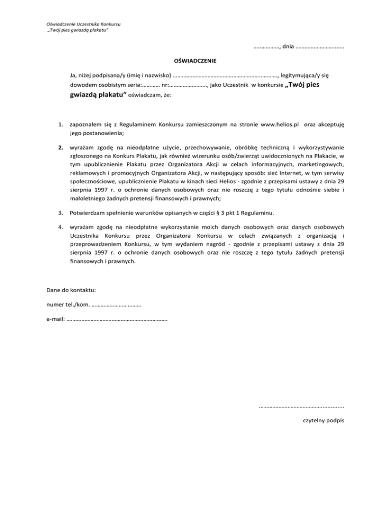 Oświadczenie Uczestnika Konkursu „Twój pies gwiazdą plakatu” …..…………, dnia ……………………….…. OŚWIADCZENIE Ja, niżej podpisana/y (imię i nazwisko) …………………………………………………..………., legitymująca/y się dowodem osobistym seria:………… nr:……………………., jako Uczestnik w konkursie „Twój pies gwiazdą plakatu” oświadczam, że: 1. zapoznałem się z Regulaminem Konkursu zamieszczonym na stronie www.helios.pl oraz akceptuję jego postanowienia; 2. wyrażam zgodę na nieodpłatne użycie, przechowywanie, obróbkę techniczną i wykorzystywanie zgłoszonego na Konkurs Plakatu, jak również wizerunku osób/zwierząt uwidocznionych na Plakacie, w tym upublicznienie Plakatu przez Organizatora Akcji w celach informacyjnych, marketingowych, reklamowych i promocyjnych Organizatora Akcji, w następujący sposób: sieć Internet, w tym serwisy społecznościowe, upublicznienie Plakatu w kinach sieci Helios - zgodnie z przepisami ustawy z dnia 29 sierpnia 1997 r. o ochronie danych osobowych oraz nie roszczę z tego tytułu odnośnie siebie i małoletniego żadnych pretensji finansowych i prawnych; 3. Potwierdzam spełnienie warunków opisanych w części § 3 pkt 1 Regulaminu. 4. wyrażam zgodę na nieodpłatne wykorzystanie moich danych osobowych oraz danych osobowych Uczestnika Konkursu przez Organizatora Konkursu w celach związanych z organizacją i przeprowadzeniem Konkursu, w tym wydaniem nagród - zgodnie z przepisami ustawy z dnia 29 sierpnia 1997 r. o ochronie danych osobowych oraz nie roszczę z tego tytułu żadnych pretensji finansowych i prawnych. Dane do kontaktu: numer tel./kom. …………………………… e-mail: …………………………………………………………. .…………………………………............... czytelny podpis Oświadczenie Uczestnika Konkursu „Twój pies gwiazdą plakatu” …..…………, dnia ……………………….…. OŚWIADCZENIE Ja, niżej podpisana/y (imię i nazwisko) …………………………………………………..………., legitymująca/y się dowodem osobistym seria:………… nr:……………………., jako rodzic / opiekun prawny1 małoletniego Uczestnika, wyrażam zgodę na udział ………………………………….……………..(imię i nazwisko małoletniego Uczestnika) w konkursie „Twój pies gwiazdą plakatu” i jednocześnie 2 oświadczam, że: 5. zapoznałem się z Regulaminem Konkursu zamieszczonym na stronie www.helios.pl oraz akceptuję jego postanowienia; 6. wyrażam zgodę na nieodpłatne użycie, przechowywanie, obróbkę techniczną i wykorzystywanie zgłoszonego na Konkurs Plakatu, jak również wizerunku osób/zwierząt uwidocznionych na Plakacie, w tym upublicznienie Plakatu przez Organizatora Akcji w celach informacyjnych, marketingowych, reklamowych i promocyjnych Organizatora Akcji, w następujący sposób: sieć Internet, w tym serwisy społecznościowe, upublicznienie Plakatu w kinach sieci Helios - zgodnie z przepisami ustawy z dnia 29 sierpnia 1997 r. o ochronie danych osobowych oraz nie roszczę z tego tytułu odnośnie siebie i małoletniego żadnych pretensji finansowych i prawnych; 7. Potwierdzam spełnienie warunków opisanych w części § 3 pkt 1 Regulaminu. 8. wyrażam zgodę na nieodpłatne wykorzystanie moich danych osobowych oraz danych osobowych Uczestnika Konkursu przez Organizatora Konkursu w celach związanych z organizacją i przeprowadzeniem Konkursu, w tym wydaniem nagród - zgodnie z przepisami ustawy z dnia 29 sierpnia 1997 r. o ochronie danych osobowych oraz nie roszczę z tego tytułu żadnych pretensji finansowych i prawnych. Dane do kontaktu: numer tel./kom. …………………………… e-mail: …………………………………………………………. Dane Dziecka: Imię i nazwisko: ………………………….. Wiek: …………………. .…………………………………............... czytelny podpis 1 Niepotrzebne skreślić 2 Wypełnia opiekun prawny niepełnoletniego Uczestnika poniżej 15 roku życia