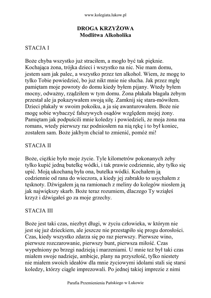 www.kolegiata.lukow.pl DROGA KRZYŻOWA Modlitwa Alkoholika STACJA I Boże chyba wszystko już straciłem, a mogło być tak pięknie. Kochająca żona, trójka dzieci i wszystko na nic. Nie mam domu, jestem sam jak palec, a wszystko przez ten alkohol. Wiem, że mogę to tylko Tobie powiedzieć, bo już nikt mnie nie słucha. Jak przez mgłę pamiętam moje powroty do domu kiedy byłem pijany. Wtedy byłem mocny, odważny, rządziłem w tym domu. Żona płakała błagała żebym przestał ale ja pokazywałem swoją siłę. Zamknij się stara-mówiłem. Dzieci płakały w swoim pokoiku, a ja się awanturowałem. Boże nie mogę sobie wybaczyć fałszywych osądów względem mojej żony. Pamiętam jak podpuścili mnie koledzy i powiedzieli, że moja żona ma romans, wtedy pierwszy raz podniosłem na nią rękę i to był koniec, zostałem sam. Boże jakbym chciał to zmienić, pomóż mi! STACJA II Boże, ciężkie było moje życie. Tyle kilometrów pokonanych żeby tylko kupić jedną butelkę wódki, i tak prawie codziennie, aby tylko się upić. Moją ukochaną była ona, butelka wódki. Kochałem ją codziennie od rana do wieczora, a kiedy jej zabrakło to usychałem z tęsknoty. Dźwigałem ją na ramionach z meliny do kolegów niosłem ją jak największy skarb. Boże teraz rozumiem, dlaczego Ty wziąłeś krzyż i dźwigałeś go za moje grzechy. STACJA III Boże jest taki czas, niezbyt długi, w życiu człowieka, w którym nie jest się już dzieckiem, ale jeszcze nie przestąpiło się progu dorosłości. Czas, kiedy wszystko zdarza się po raz pierwszy. Pierwsze wino, pierwsze rozczarowanie, pierwszy bunt, pierwsza miłość. Czas wypełniony po brzegi nadzieją i marzeniami. U mnie też był taki czas miałem swoje nadzieje, ambicje, plany na przyszłość, tylko niestety nie miałem swoich ideałów dla mnie życiowymi idolami stali się starsi koledzy, którzy ciągle imprezowali. Po jednej takiej imprezie z nimi Parafia Przemienienia Pańskiego w Łukowie www.kolegiata.lukow.pl od picia straciłem przytomność, później zdarzało się to bardzo często. Niestety nie podniosłem się z tego upadku i brnąłem w to dalej. Boże jakże bolesne były te pierwsze moje upadki. STACJA IV Boże ciągle brzmią mi w uszach słowa mojej matki, pamiętaj żebyś nie pił, odpowiadałem jej: Mamo przestań! Przecież wszyscy piją, nie mogę być inny, a kiedy powtarzała mi to setny raz to obracałem się na pięcie i wychodziłem. Dobra kochająca matka chciała dla mnie dobrze, ale ja przecież wiedziałem swoje - wiedziałem lepiej. Widziałem jak codziennie trzymała w rękach różaniec, modliła się za mnie. Nie mogę sobie darować, że kiedy leżała w szpitalu nie stać mnie było, aby ją odwiedzić. Tak Boże, przyznaję się byłem w ciągu alkoholowym, ale czy to mnie usprawiedliwia? Na wszystko jest już zdecydowanie za późno, bo moja najdroższa mama nie powie mi, że mi wszystko wybaczy, bo już odeszła z tego świata na zawsze. Kochany Jezu, który spotkałeś matkę na drodze krzyżowej przyślij ją do mnie żeby i mnie pocieszyła. STACJA V Boże, tak wiele razy nie mogłem iść o własnych siłach, tułałem się po chodnikach, drogach, spałem po rowach, na przystankach. Koledzy ciągnęli mnie jak barana, abym tylko doszedł do domu, ale ja krzyczałem do nich żeby mnie zostawili, nigdy mnie nie zostawili. Alkoholowa solidarność - nie wiem czy byli do tego przymuszeni, czy robili to z potrzeby serca. Może byli takim Szymonami z Cyreny? Czasami kłócili się ze sobą - to ty mu pomóż masz więcej siły, ja mu wczoraj pomagałem, mam dość ciągnąć go ciągle za sobą, daj mu w mordę to może otrzeźwieje. Boże co to było za życie! Parafia Przemienienia Pańskiego w Łukowie www.kolegiata.lukow.pl STACJA VI Miałem wtedy 18 lat zakochałem się po uszy, dla niej byłem w stanie zrobić wszystko. Codziennie myślałem o niej, tęskniłem i wiem, że świat był inny, przestałem pić - zrobiłem to dla niej, bo ją kochałem. Pamiętam jak jej obiecałem, że koniec z piciem i wytrzymałem przez pół roku. Życie wtedy było takie piękne i proste. Ona dla mnie była wtedy Weroniką z drogi krzyżowej. Niestety jak wszystko w moim życiu i to udało mi się popsuć. STACJA VII Boże, miałem takie piękne dzieci. Kiedy były małe przytulały się do mnie, czułem się prawdziwym ojcem, byłem dla nich ideałem do momentu w którym zobaczyły jak biję po pijaku ich matkę, to był dla nich cios, dla mnie też. Nigdy nie zapomnę ich łez, tego jak stawały w obronie matki, a ja stałem się dla nich tyranem. Krzyczałem już do pokoju spać bo i z wami zrobię porządek. Boże to kolejny upadek w moim życiu, tak jak Twój Jezu na drodze krzyżowej. STACJA VIII Boże, jak mnie dobijały te baby plotkary, wytykały mnie palcami, a co mówiły to nawet nie chce o tym myśleć. W sklepie to nie miały innego tematu tylko znowu ten Heniek pijany, ma się ta biedna Hanka z nim. Sklepowa wturowała im, że już nie płacą od miesiąca za zakupy co dalej będzie z nimi. Myślałem, że ich rozszarpię, wredne baby. Raz to nawet wykrzyczałem im, niech się zajmą swoimi chłopami. Boże dziwny jest ten świat, jak wiele w nim nienawiści, zła, udawango współczucia. Chyba rozumiem Ciebie i Twoje słowa Jezu na drodze krzyżowej, skierowane do niewiast - płaczcie nad sobą i nad waszymi dziećmi. STACJA IX Boże pamiętam mój ostatni detoks. Myślałem, że to już koniec białe myszki, drgawki, własnego cienia się bałem. Byłem już jedną nogą na tamtym świecie. Całe moje marne życie stanęło mi przed oczami. Parafia Przemienienia Pańskiego w Łukowie www.kolegiata.lukow.pl Najgorsze chyba było to, że z butelek po denaturacie i rojalu wychodziły jakieś stwory, które chciały mnie pożreć, to było straszne. Boże i z tego upadku podniosłeś mnie. Pomógł mi wtedy taki lekarz, który mówił panie Henryku wyjdzie Pan z tego i za