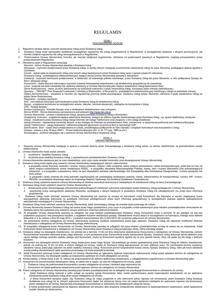 REGULAMIN DZIAŁ I POSTANOWIENIA OGÓLNE 1. Regulamin określa zakres i warunki świadczenia Usług przez Dostawcę Usług. 2. Dostawca Usług może wprowadzić dodatkowe szczegółowe regulaminy dla Usług uregulowanych w Regulaminie, w szczególności związane z akcjami promocyjnymi, jak również odrębne regulaminy dla usług nieuregulowanych w Regulaminie. 3. Postanowienia Umowy Abonenckiej, Cennika, jak również odrębnych regulaminów, odmienne od postanowień zawartych w Regulaminie, znajdują pierwszeństwo przed postanowieniami Regulaminu. 4. Określenia użyte w Regulaminie oznaczają: Abonent strona Umowy Abonenckiej zawartej z Dostawcą Usług Aktywacja czynności podejmowane przez Dostawcę Usług, w wyniku których następuje uruchomienie świadczenia Usług na rzecz Abonenta, podlegające opłacie zgodnie z Cennikiem; Cennik wykaz opłat za świadczenie Usług oraz innych usług świadczonych przez Dostawcę Usług wraz z opisem zasad ich naliczania; Dostawca Usług przedsiębiorca telekomunikacyjny, będący stroną Umowy Abonenckiej zawartej z Abonentem Instalacja czynności techniczne podejmowane, w zależności od wybranego pakietu taryfowego, przez Dostawcę Usług lub przez Abonenta, w celu podłączenia Sprzętu do Sieci i aktywacji Usługi. Konsument osoba fizyczna dokonująca czynności prawnej niezwiązanej bezpośrednio z jej działalnością gospodarczą lub zawodową; Lokal budynek lub lokal mieszkalny lub użytkowy wskazany w Umowie Abonenckiej jako miejsce świadczenia Usługi/zakończenia Sieci; Okres Rozliczeniowy okres, za który dokonywane są rozliczenia należności z tytułu świadczenia Usług, wynoszący jeden miesiąc kalendarzowy.; Operator „TEN.NET" Piotr Ekspedyt Frankowski z siedzibą w Białymstoku, ul.Rycerska1p – przedsiębiorca telekomunikacyjny świadczący Usługi na podstawie Umowy.; Opłata Abonamentowa wskazana w Cenniku lub regulaminie promocji opłata przysługująca Dostawcy Usług wobec Abonenta, naliczana z tytułu świadczenia Usługi za każdy Okres Rozliczeniowy; Regulamin niniejszy regulamin; Sieć sieć telekomunikacyjna wykorzystywana przez Dostawcę Usług do świadczenia Usług; Sprzęt urządzenie techniczne ﴾w szczególności antena, dekoder, terminal abonencki﴿, niezbędne do korzystania z Usług; CPE Rodzaj Sprzętu; Zestaw Instalacyjny Komplet Sprzętu wraz z niezbędnym okablowaniem oraz uchwytem. Strona WWW Strona internetowa zamieszczona pod adresem http://www.ten.net.pl; Umowa Abonencka umowa o świadczenie Usług, zawarta pomiędzy Dostawcą Usług a Abonentem; Urządzenie końcowe urządzenie będące własnością Abonenta, służące do odbioru sygnału dostarczanego przez Dostawcę Usług , np. aparat telefoniczny, komputer; Usługi świadczone przez Dostawcę Usług Usługi Internetu lub Usługi Telefoniczne oraz związane z nimi usługi dodatkowe; Usługi Internetu zapewnienie transmisji danych, w tym dostępu do Internetu za pośrednictwem Sieci, świadczone w stacjonarnej publicznej sieci telekomunikacyjnej; Usługi Telefoniczne usługi inicjowania i odbierania połączeń głosowych za pomocą Sieci w technologii VoIP. Zakończenie Sieci część Sieci umiejscowiona w Lokalu, umożliwiająca podłączenie do Sieci Sprzętu i Urządzeń Końcowych oraz korzystanie z Usług; Ustawa ustawa z dnia 16 lipca 2004 r. – Prawo telekomunikacyjne ﴾Dz. U. Nr 171 poz. 1800 ze zm.﴿; Zamawiający podmiot ubiegający się o zawarcie Umowy Abonenckiej z Dostawcą Usług. DZIAŁ II UMOWA ABONENCKA 1. Zawarcie Umowy Abonenckiej następuje w oparciu o wniosek złożony przez Zamawiającego u Dostawcy Usług ustnie, na piśmie, telefonicznie, za pośrednictwem poczty elektronicznej. 2. Umowa Abonencka może zostać zawarta: 1. na piśmie w siedzibie Dostawcy Usług, 2. na piśmie poza siedzibą Dostawcy Usług, z upoważnionym przedstawicielem Dostawcy Usług, 3. Umowa Abonencka zawierana jest na czas nieokreślony, przy czym może określać minimalny czas obowiązywania Umowy Abonenckiej. 4. Dostawca Usług może żądać przy zawarciu Umowy Abonenckiej następujących danych i dokumentów: 1. w przypadku osoby fizycznej: nazwisko i imiona, imiona rodziców, miejsce i data urodzenia, adres miejsca zamieszkania i adres korespondencyjny, jeżeli jest on inny niż adres miejsca zamieszkania; numer ewidencyjny PESEL w przypadku obywatela Rzeczypospolitej Polskiej, nazwy, serii i numeru dokumentu ﴾ów﴿ potwierdzających tożsamość, a w przypadku cudzoziemca, który nie jest obywatelem państwa członkowskiego Unii Europejskiej albo Konfederacji Szwajcarskiej numeru paszportu lub karty pobytu, 2. w przypadku osoby prawnej lub innej jednostki organizacyjnej nie posiadającej osobowości prawnej: nazwy, adresu/adresu do korespondencji, numeru NIP, numeru REGON na podstawie okazanego wpisu do Krajowego Rejestru Sądowego lub Ewidencji Działalności Gospodarczej. 5. Dostawca Usług uzależnia zawarcie Umowy Abonenckiej od istnienia warunków technicznych niezbędnych do świadczenia Usług na rzecz Zamawiającego. 6. Dostawca Usług może uzależnić zawarcie Umowy Abonenckiej od: 1. dostarczenia przez Zamawiającego dokumentów potwierdzających możliwość wykonania zobowiązań wobec Dostawcy Usług wynikających z Umowy Abonenckiej, 2. pozytywnej oceny wiarygodności płatniczej Abonenta, wynikającej z danych będących w posiadaniu Dostawcy Usług lub udostępnionych mu przez biuro informacji gospodarczej. 7. Dostawca Usług może odmówić zawarcia Umowy Abonenckiej lub zawrzeć tę umowę na warunkach mniej korzystnych dla Abonenta w wyniku negatywnej oceny wiarygodności płatniczej dokonanej na podstawie informacji udostępnionych przez biuro informacji gospodarczej, w szczególności poprzez żądanie zabezpieczenia wierzytelności wynikających z Umowy Abonenckiej. 8. Dostawca Usług może odmówić zawarcia Umowy Abonenckiej, jeżeli zamawiający Usługę nie posiada tytułu prawnego do Lokalu. 