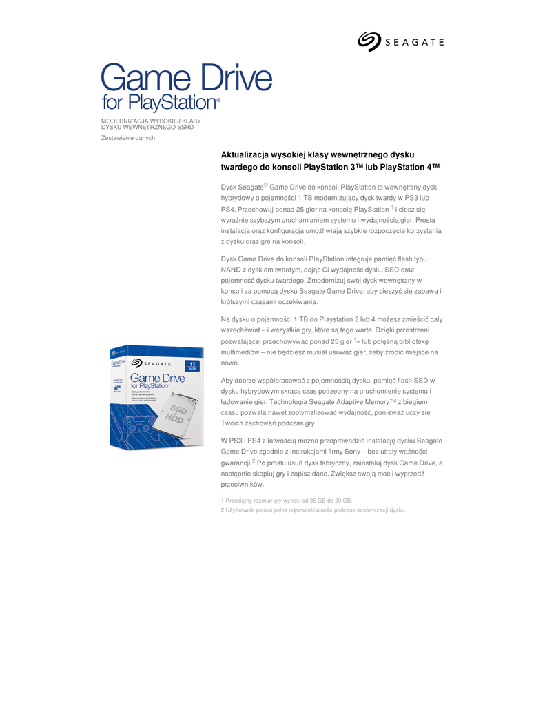 MODERNIZACJA WYSOKIEJ KLASY DYSKU WEWNĘTRZNEGO SSHD Zestawienie danych Aktualizacja wysokiej klasy wewnętrznego dysku twardego do konsoli PlayStation 3™ lub PlayStation 4™ Dysk Seagate® Game Drive do konsoli PlayStation to wewnętrzny dysk hybrydowy o pojemności 1 TB modernizujący dysk twardy w PS3 lub PS4. Przechowuj ponad 25 gier na konsolę PlayStation 1 i ciesz się wyraźnie szybszym uruchamianiem systemu i wydajnością gier. Prosta instalacja oraz konfiguracja umożliwiają szybkie rozpoczęcie korzystania z dysku oraz grę na konsoli. Dysk Game Drive do konsoli PlayStation integruje pamięć flash typu NAND z dyskiem twardym, dając Ci wydajność dysku SSD oraz pojemność dysku twardego. Zmodernizuj swój dysk wewnętrzny w konsoli za pomocą dysku Seagate Game Drive, aby cieszyć się zabawą i krótszymi czasami oczekiwania. Na dysku o pojemności 1 TB do Playstation 3 lub 4 możesz zmieścić cały wszechświat – i wszystkie gry, które są tego warte. Dzięki przestrzeni pozwalającej przechowywać ponad 25 gier 1– lub potężną bibliotekę multimediów – nie będziesz musiał usuwać gier, żeby zrobić miejsce na nowe. Aby dobrze współpracować z pojemnością dysku, pamięć flash SSD w dysku hybrydowym skraca czas potrzebny na uruchomienie systemu i ładowanie gier. Technologia Seagate Adaptive Memory™ z biegiem czasu pozwala nawet zoptymalizować wydajność, ponieważ uczy się Twoich zachowań podczas gry. W PS3 i PS4 z łatwością można przeprowadzić instalację dysku Seagate Game Drive zgodnie z instrukcjami firmy Sony – bez utraty ważności gwarancji.2 Po prostu usuń dysk fabryczny, zainstaluj dysk Game Drive, a następnie skopiuj gry i zapisz dane. Zwiększ swoją moc i wyprzedź przeciwników. 1 Przeciętny rozmiar gry wynosi od 35 GB do 50 GB. 2 Użytkownik ponosi pełną odpowiedzialność podczas modernizacji dysku. MODERNIZACJA WYSOKIEJ KLASY DYSKU WEWNĘTRZNEGO SSHD Parametry Opakowanie detaliczne Wymiary produktu Wymiary opakowania Wymiary kartonu zbiorczego Wymiary palety Długość (cale/mm) 3,92/99,57 4,685/119 6,496/165 39,842/1 012 Szerokość (cale/mm) 2,745/69,72 6,248/158,7 5,5/139,7 43,031/1 093 Głębokość (cale/mm) 0,37/9,4 1,75/44,45 4,811/122,2 43,661/1 109 0,245/0,111 0,428/0,194 1,521/0,69 695,982/315,692 Waga (funty/kg) Ilości Opakowania w kartonie zbiorczym 3 Liczba kartonów zbiorczych na palecie Liczba warstw palety 392 8 Wymagania systemowe Zawartość zestawu PlayStation 3™, PlayStation 4™ SATA 6 Gb/s (kompatybilność wsteczna z SATA 3 Gb/s) Region Numer modelu Pojemność Na całym świecie STBD1000101 1 TB Dysk Seagate ® Game Drive do PlayStation (2,5-calowy, hybrydowy dysk półprzewodnikowy 9,5 mm) Skrócona instrukcja obsługi Ograniczona gwarancja (miesiące) 60 Kod UPC Kod EAN 763649074404 7636490072956 Kod UPC opakowania zbiorczego 10763649074401 SEAGATE.COM AMERYKA PŁN. I PŁD. AZJA/PACYFIK EMEA Seagate Technology LLC 10200 South De Anza Boulevard, Cupertino, California 95014, USA, +1 408 658 1000 Seagate Singapore International Headquarters Pte. Ltd. 7000 Ang Mo Kio Avenue 5, Singapur 569877, +65 6485 3888 Seagate Technology SAS 16-18, rue du Dôme, 92100 Boulogne-Billancourt, France, 33 1-4186 10 00 © 2016 Seagate Technology LLC. Wszelkie prawa zastrzeżone. Seagate, Seagate Technology i logo Spiral są zastrzeżonymi znakami towarowymi firmy Seagate Technology LLC w Stanach Zjednoczonych i/lub innych krajach. Adaptive Memory jest znakiem towarowym lub zastrzeżonym znakiem towarowym firmy Seagate Technology LLC lub jednej z jej firm zależnych w Stanach Zjednoczonych i/lub innych krajach. Wszystkie pozostałe znaki towarowe i zastrzeżone znaki towarowe należą do odpowiednich właścicieli. 1W przypadku oznaczania pojemności dysków twardych, jeden gigabajt (oznaczany także jako „GB”) jest równy jednemu miliardowi bajtów; jeden terabajt (oznaczany także jako „TB”) jest równy jednemu bilionowi bajtów. W systemie operacyjnym komputera mogą być używane różne standardy pomiarowe i raportowana pojemność może być mniejsza. Ponadto część podanej pojemności jest używana do formatowania oraz w innych celach i może nie być dostępna do przechowywania danych. Ilościowe dane dotyczące używania w różnych zastosowaniach mają charakter przykładowy. Rzeczywiste wartości mogą różnić się w zależności od wielu czynników, takich jak rozmiar plików, ich format oraz używane funkcje i aplikacje. Rzeczywiste wartości danych mogą się różnić w zależności od środowiska operacyjnego i innych czynników. Za przestrzeganie wszelkich obowiązujących praw autorskich odpowiedzialność ponosi użytkownik. Firma Seagate zastrzega sobie prawo do wprowadzania zmian w ofercie produktów lub w ich parametrach bez powiadomienia. DS1860.3-1603PL