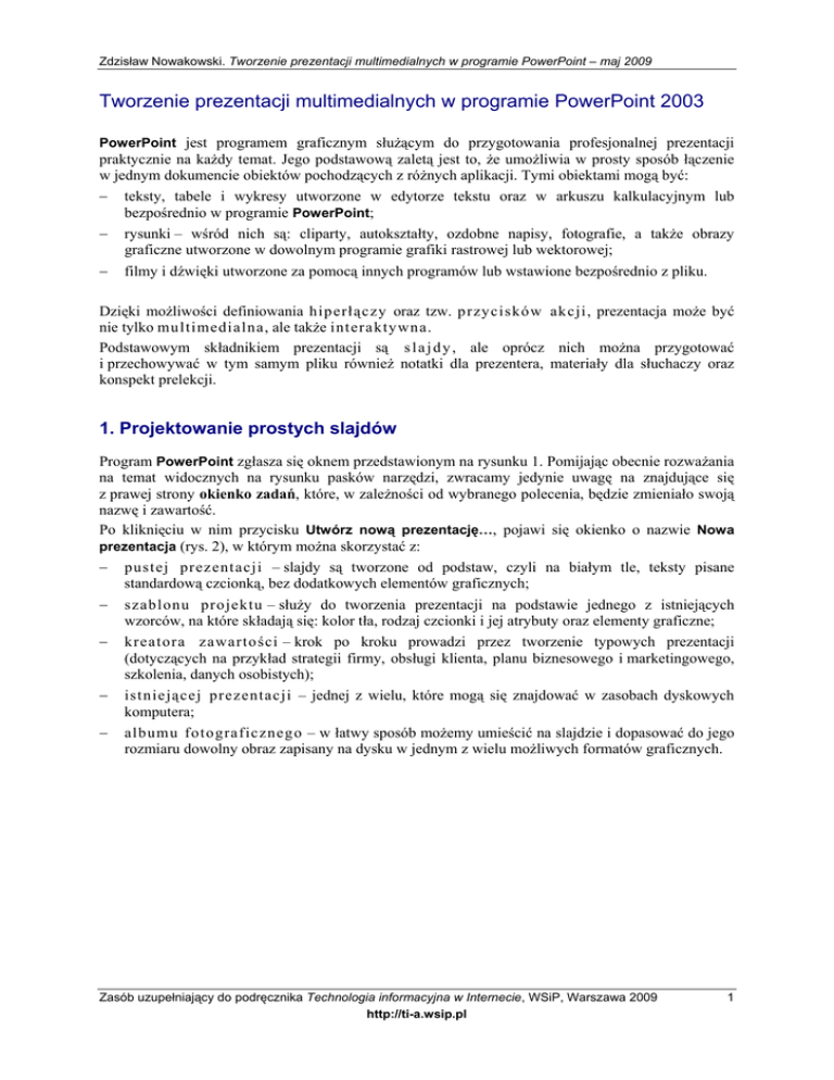 Zdzisław Nowakowski. Tworzenie prezentacji multimedialnych w programie PowerPoint – maj 2009 Tworzenie prezentacji multimedialnych w programie PowerPoint 2003 PowerPoint jest programem graficznym służącym do przygotowania profesjonalnej prezentacji praktycznie na każdy temat. Jego podstawową zaletą jest to, że umożliwia w prosty sposób łączenie w jednym dokumencie obiektów pochodzących z różnych aplikacji. Tymi obiektami mogą być: − teksty, tabele i wykresy utworzone w edytorze tekstu oraz w arkuszu kalkulacyjnym lub bezpośrednio w programie PowerPoint; − rysunki – wśród nich są: cliparty, autokształty, ozdobne napisy, fotografie, a także obrazy graficzne utworzone w dowolnym programie grafiki rastrowej lub wektorowej; − filmy i dźwięki utworzone za pomocą innych programów lub wstawione bezpośrednio z pliku. Dzięki możliwości definiowania hiperłączy oraz tzw. przy cisków akcji, prezentacja może być nie tylko multimedialna, ale także interakty wna. Podstawowym składnikiem prezentacji są s l a j d y , ale oprócz nich można przygotować i przechowywać w tym samym pliku również notatki dla prezentera, materiały dla słuchaczy oraz konspekt prelekcji. 1. Projektowanie prostych slajdów Program PowerPoint zgłasza się oknem przedstawionym na rysunku 1. Pomijając obecnie rozważania na temat widocznych na rysunku pasków narzędzi, zwracamy jedynie uwagę na znajdujące się z prawej strony okienko zadań, które, w zależności od wybranego polecenia, będzie zmieniało swoją nazwę i zawartość. Po kliknięciu w nim przycisku Utwórz nową prezentację…, pojawi się okienko o nazwie Nowa prezentacja (rys. 2), w którym można skorzystać z: − pustej prezentacji – slajdy są tworzone od podstaw, czyli na białym tle, teksty pisane standardową czcionką, bez dodatkowych elementów graficznych; − szablonu projektu – służy do tworzenia prezentacji na podstawie jednego z istniejących wzorców, na które składają się: kolor tła, rodzaj czcionki i jej atrybuty oraz elementy graficzne; − kreatora zawartości – krok po kroku prowadzi przez tworzenie typowych prezentacji (dotyczących na przykład strategii firmy, obsługi klienta, planu biznesowego i marketingowego, szkolenia, danych osobistych); − istniejącej prezentacji – jednej z wielu, które mogą się znajdować w zasobach dyskowych komputera; − albumu fotograficznego – w łatwy sposób możemy umieścić na slajdzie i dopasować do jego rozmiaru dowolny obraz zapisany na dysku w jednym z wielu możliwych formatów graficznych. Zasób uzupełniający do podręcznika Technologia informacyjna w Internecie, WSiP, Warszawa 2009 http://ti-a.wsip.pl 1 Zdzisław Nowakowski. Tworzenie prezentacji multimedialnych w programie PowerPoint – maj 2009 Rysunek 1. Okno programu PowerPoint 2003 Rysunek 2. Okienko zadań inicjujące pracę nad nową lub istniejącą już prezentacją Zasób uzupełniający do podręcznika Technologia informacyjna w Internecie, WSiP, Warszawa 2009 http://ti-a.wsip.pl 2 Zdzisław Nowakowski. Tworzenie prezentacji multimedialnych w programie PowerPoint – maj 2009 Załóżmy, ze zdecydowaliśmy się na jeden z wbudowanych do programu szablonów projektu o nazwie... Mieszaniny – oczywiście wybór należy do Ciebie i jeśli uznasz, że inny szablon jest bardziej interesujący, zastosuj go. 1.1. Wprowadzanie tekstu i wstawianie clipartu do slajdu tytułowego Naszym celem będzie teraz zaprojektowanie slajdu przedstawionego w podręczniku na rysunku C.6. Najpierw wprowadzimy do niego tekst i umieścimy clipart, potem zdefiniujemy w tym slajdzie hiperłącza i przyciski akcji. Ponieważ przystępujemy do tworzenia pierwszego slajdu, najodpowiedniejszy będzie slajd tytułowy (zob. rys. 1). Jego utworzenie polega na wpisaniu tekstów do pól przeznaczonych na tytuł i podtytuł. Aby wpisać tekst w slajdzie tytułowym, należy: 1. Kliknąć w obszarze ramki z napisem Kliknij, aby dodać tytuł i wpisać tekst tytułu (tu: Pierwsza prezentacja). 2. Kliknąć w obszarze ramki Kliknij, aby dodać podtytuł i wpisać tekst podtytułu (tu: Kilka sygnałów z rynku pracy). 3. Kliknąć poza ramkami, tym samym zakończyć wprowadzanie tekstu. Ramki z tekstem możemy w dowolny sposób przesuwać w obrębie slajdu, zmieniać ich rozmiar, wypełniać kolorem , obramowywać linią . Tekst możemy formatować według tych samych zasad co w edytorze tekstu. Wprowadźmy zatem kilka zmian. Ćwiczenie 1 a. Ustal dla tekstu czcionkę Tahoma o rozmiarze: 54 pkt dla tytułu oraz 32 pkt dla podtytułu. b. Zaznacz myszą tekst tytułu i – wybierając ikonę – zmień kolor czcionki na niebieski. Podobnie postąp z podtytułem. c. Wyśrodkuj tekst w obu ramkach – klikając ikonę . d. Jeśli ramki wokół obu tekstów są zbyt duże – zmniejsz je, a potem przesuń razem z tekstem w miejsca, które uznasz za najwłaściwsze dla wyglądu slajdu. e. Skorzystaj z ikony i wypełnij ramkę tytułu jasnym popielatym kolorem. Dobrym zwyczajem jest zamieszczanie na slajdzie tytułowym elementu graficznego, np. fotografii lub clipartu. Aby wstawić clipart do slajdu, należy: 1. Wybrać polecenie Wstaw | Obraz | Clipart…. 2. W okienku zadań (rys. 3) wybrać polecenie Organizuj klipy…. Zasób uzupełniający do podręcznika Technologia informacyjna w Internecie, WSiP, Warszawa 2009 http://ti-a.wsip.pl 3 Zdzisław Nowakowski. Tworzenie prezentacji multimedialnych w programie PowerPoint – maj 2009 Rysunek 3. Okienko zadań umożliwiające organizowanie clipartów 3. W oknie organizatora rysunków (Clip Organizer – rys. 4) wybrać folder Kolekcje pakietu Office. Rysunek 4. Okno organizatora rysunków 4. Otworzyć folder z wybraną kategorią rysunków (tu: Biznes i clipart z mężczyzną siedzącym przy komputerze – rys. 5). Aby wstawić konkretny rysunek, należy kliknąć strzałkę umieszczoną z jego prawej strony, a następnie z menu podręcznego wybrać p