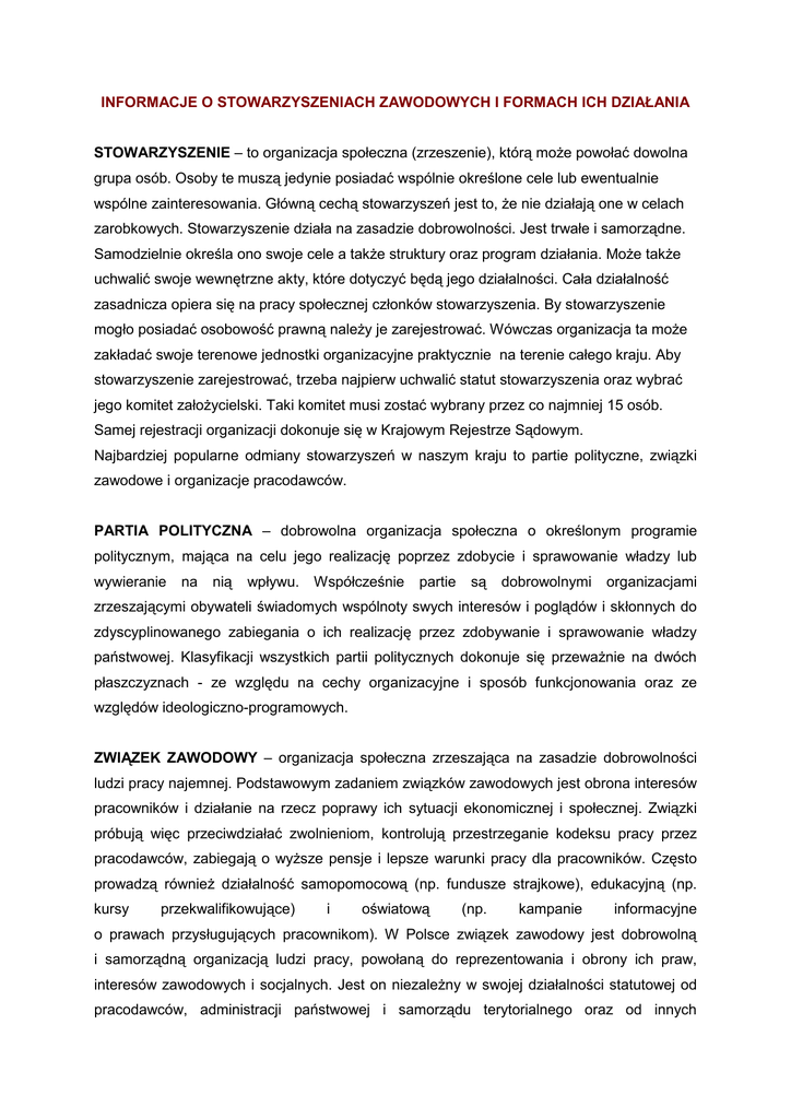 INFORMACJE O STOWARZYSZENIACH ZAWODOWYCH I FORMACH ICH DZIAŁANIA STOWARZYSZENIE – to organizacja społeczna (zrzeszenie), którą może powołać dowolna grupa osób. Osoby te muszą jedynie posiadać wspólnie określone cele lub ewentualnie wspólne zainteresowania. Główną cechą stowarzyszeń jest to, że nie działają one w celach zarobkowych. Stowarzyszenie działa na zasadzie dobrowolności. Jest trwałe i samorządne. Samodzielnie określa ono swoje cele a także struktury oraz program działania. Może także uchwalić swoje wewnętrzne akty, które dotyczyć będą jego działalności. Cała działalność zasadnicza opiera się na pracy społecznej członków stowarzyszenia. By stowarzyszenie mogło posiadać osobowość prawną należy je zarejestrować. Wówczas organizacja ta może zakładać swoje terenowe jednostki organizacyjne praktycznie na terenie całego kraju. Aby stowarzyszenie zarejestrować, trzeba najpierw uchwalić statut stowarzyszenia oraz wybrać jego komitet założycielski. Taki komitet musi zostać wybrany przez co najmniej 15 osób. Samej rejestracji organizacji dokonuje się w Krajowym Rejestrze Sądowym. Najbardziej popularne odmiany stowarzyszeń w naszym kraju to partie polityczne, związki zawodowe i organizacje pracodawców. PARTIA POLITYCZNA – dobrowolna organizacja społeczna o określonym programie politycznym, mająca na celu jego realizację poprzez zdobycie i sprawowanie władzy lub wywieranie na nią wpływu. Współcześnie partie są dobrowolnymi organizacjami zrzeszającymi obywateli świadomych wspólnoty swych interesów i poglądów i skłonnych do zdyscyplinowanego zabiegania o ich realizację przez zdobywanie i sprawowanie władzy państwowej. Klasyfikacji wszystkich partii politycznych dokonuje się przeważnie na dwóch płaszczyznach - ze względu na cechy organizacyjne i sposób funkcjonowania oraz ze względów ideologiczno-programowych. ZWIĄZEK ZAWODOWY – organizacja społeczna zrzeszająca na zasadzie dobrowolności ludzi pracy najemnej. Podstawowym zadaniem związków zawodowych jest obrona interesów pracowników i działanie na rzecz poprawy ich sytuacji ekonomicznej i społecznej. Związki próbują więc przeciwdziałać zwolnieniom, kontrolują przestrzeganie kodeksu pracy przez pracodawców, zabiegają o wyższe pensje i lepsze warunki pracy dla pracowników. Często prowadzą również działalność samopomocową (np. fundusze strajkowe), edukacyjną (np. kursy przekwalifikowujące) i oświatową (np. kampanie informacyjne o prawach przysługujących pracownikom). W Polsce związek zawodowy jest dobrowolną i samorządną organizacją ludzi pracy, powołaną do reprezentowania i obrony ich praw, interesów zawodowych i socjalnych. Jest on niezależny w swojej działalności statutowej od pracodawców, administracji państwowej i samorządu terytorialnego oraz od innych organizacji, a organy państwowe, samorządu terytorialnego i pracodawcy obowiązani są traktować jednakowo wszystkie związki zawodowe. Związki zawodowe finansują swoje działania ze składek członkowskich oraz darowizn, spadków zapisów, przychodów z działalności gospodarczej i dotacji celowych. Organizacje związkowe w rozumieniu ustawy o Trójstronnej Komisji do Spraw Społeczno-Gospodarczych: Forum Związków Zawodowych Zarząd Wojewódzki Województwa Pomorskiego, Zarząd Regionu Gdańskiego NSZZ "Solidarność", Rada Ogólnopolskiego Porozumienia Związków Zawodowych Województwa Pomorskiego. ORGANIZACJA PRACODAWCÓW - samorządny i niezależny w swej działalności statutowej od administracji państwowej i samorządowej związek pracodawców, którego celem jest obrona interesów i praw pracodawców wobec związków zawodowych, organów władzy i administracji. Związek pracodawców powstaje z mocy uchwały o jego założeniu, podjętej na zgromadzeniu założycielskim przez co najmniej 10 pracodawców. Następnie zgromadzenie uchwala statut i wybiera komitet założycielski liczący co najmniej 3 osoby. Związek pracodawców podlega obowiązkowi rejestracji w Krajowym Rejestrze Sądowym. W Polsce istnieje 4 organizacje pracodawców reprezentatywnych w skali kraju: • Business Centre Club • Pracodawcy Rzeczypospolitej Polskiej (dawniej Konfederacja Pracodawców Polskich) • Polska Konfederacja Pracodawców Prywatnych Lewiatan (PKPP Lewiatan) • Związek Rzemiosła Polskiego (ZRP) Organizacje pracodawców w rozumieniu ustawy o Trójstronnej Komisji do Spraw Społeczno- Gospodarczych: Business Centre Club Loża Gdańska, Gdański Związek Pracodawców, Cech Rzemiosł Różnych w Kartuzach. Organizacje rolników, w tym związków zawodowych rolników indywidualnych i izb rolniczych: Pomorska Izba Rolnicza, Wojewódzki Związek Zawodowy Rolników, Kółek i Organizacji Rolniczych w Gdańsku. PRZYDATNE STRONY: http://www.mps.gov.pl/ http://www.cotojest.info http://www.organizacjepozytku.info http://kartuzy.info/katalog,kategoria,59,0,Urzedy-i-organizacje-Stowarzyszenia-kluby.html